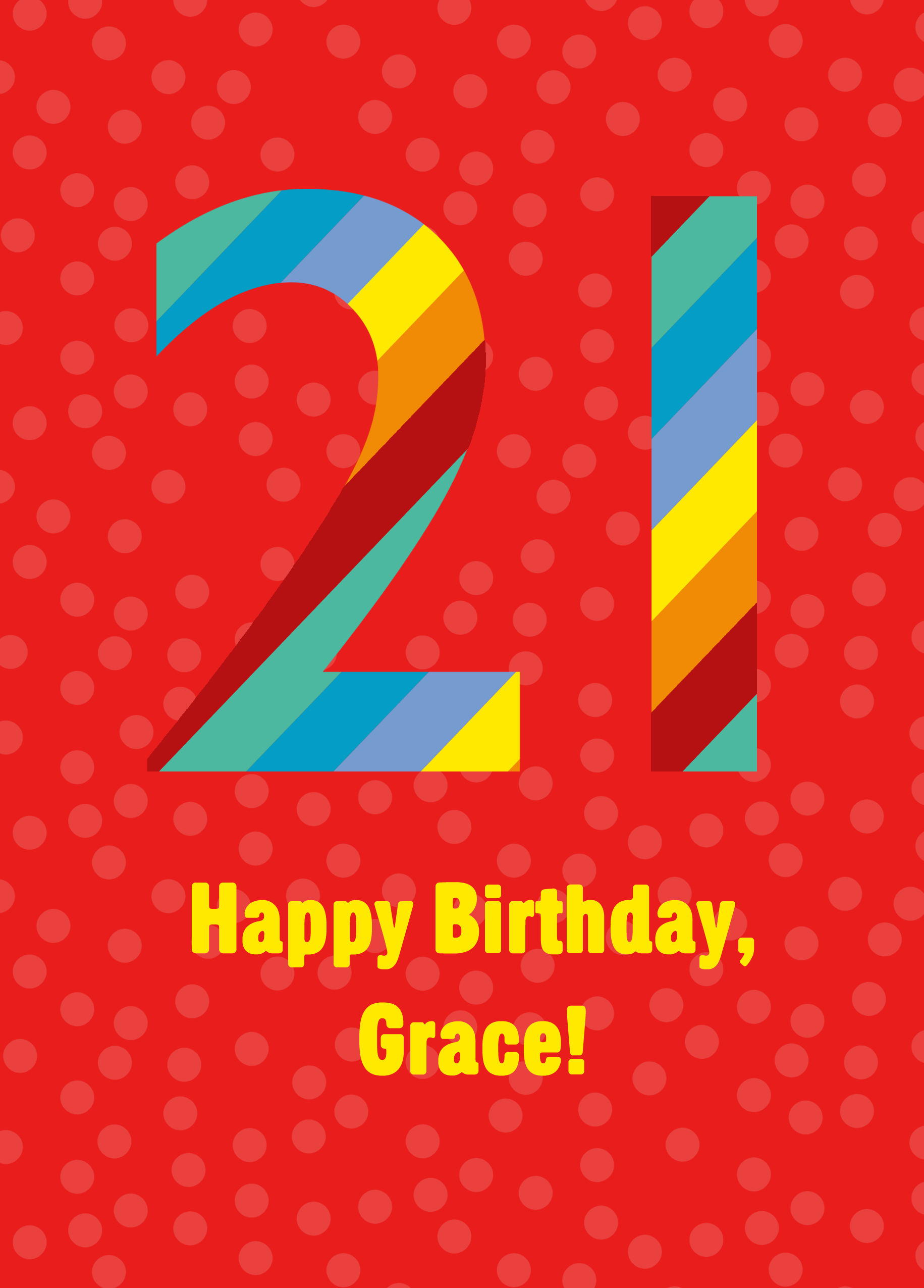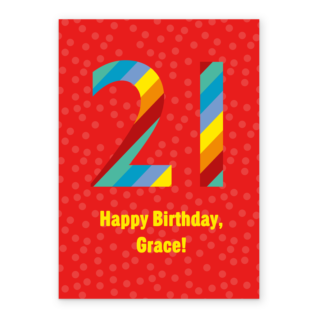 Printed on premium-quality board, this card features a fun, rainbow striped number on a bright confetti background to make their 21st birthday even brighter, with the message '21, Happy Birthday', space to personalise a name, and comes complete with a co-ordinating white envelope.