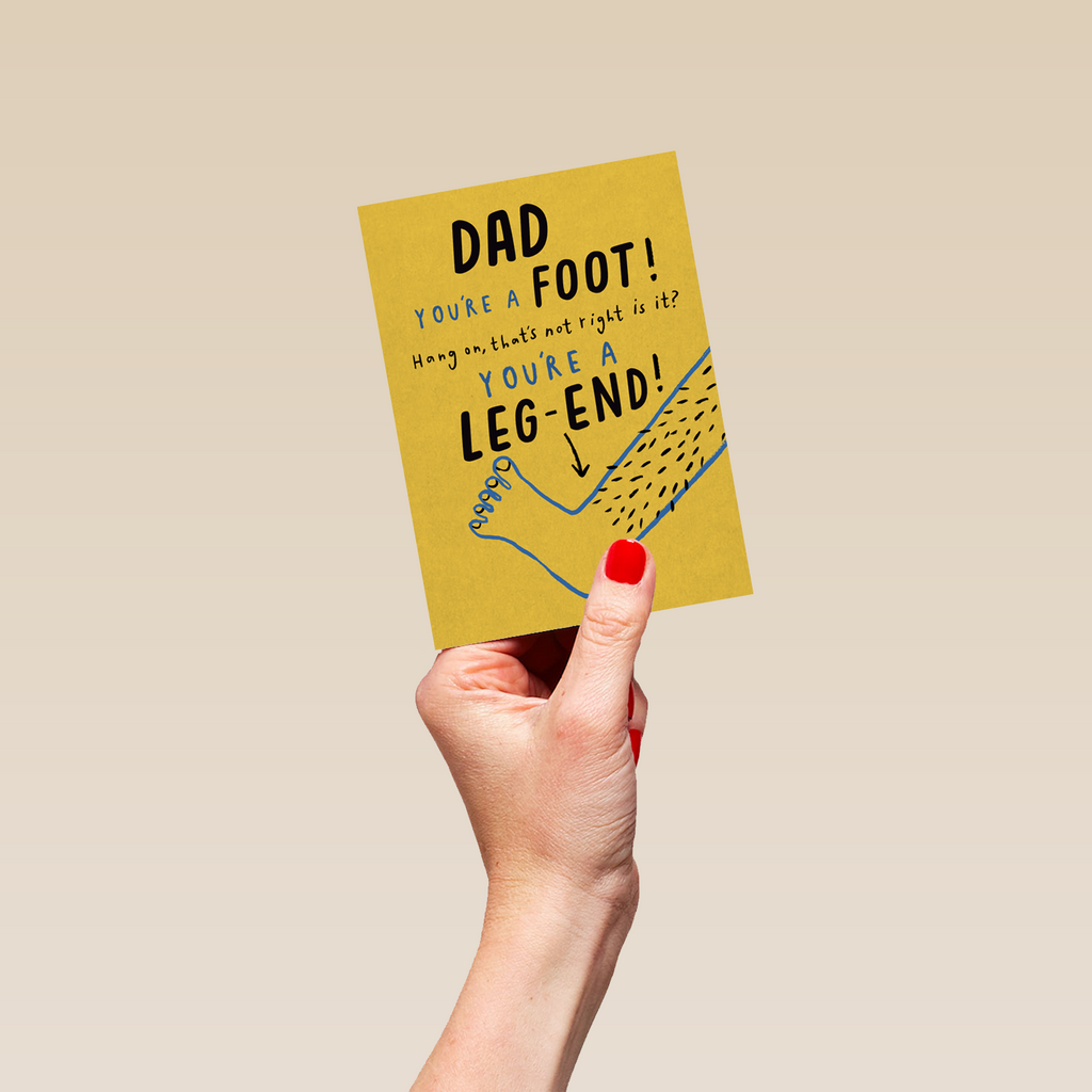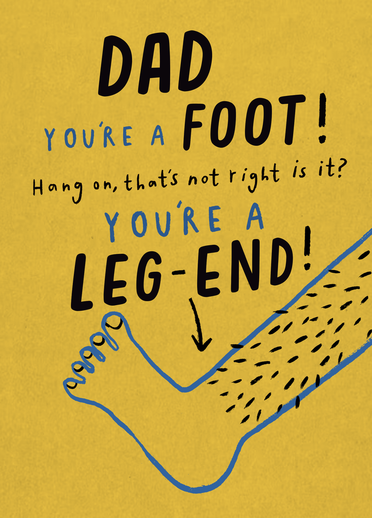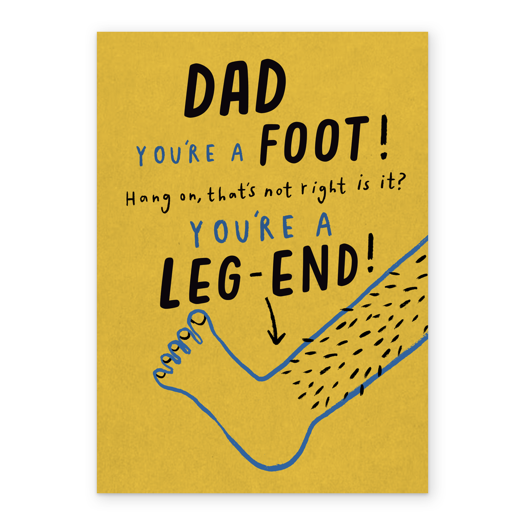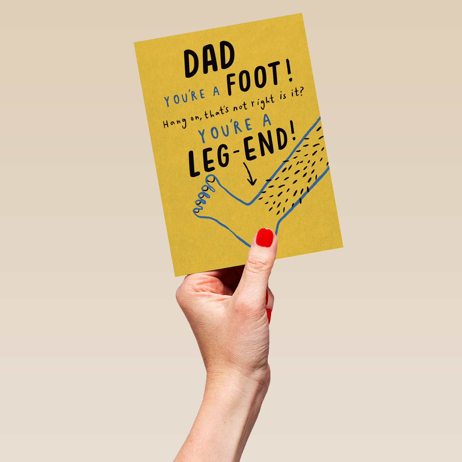 Printed on premium-quality board, this card features a funny cartoon foot with a hairy leg, with the message 'Dad, you're a foot! Hang on, that's not right is it? You're a leg-end!', space to personalise your message, and comes complete with a co-ordinating white envelope.