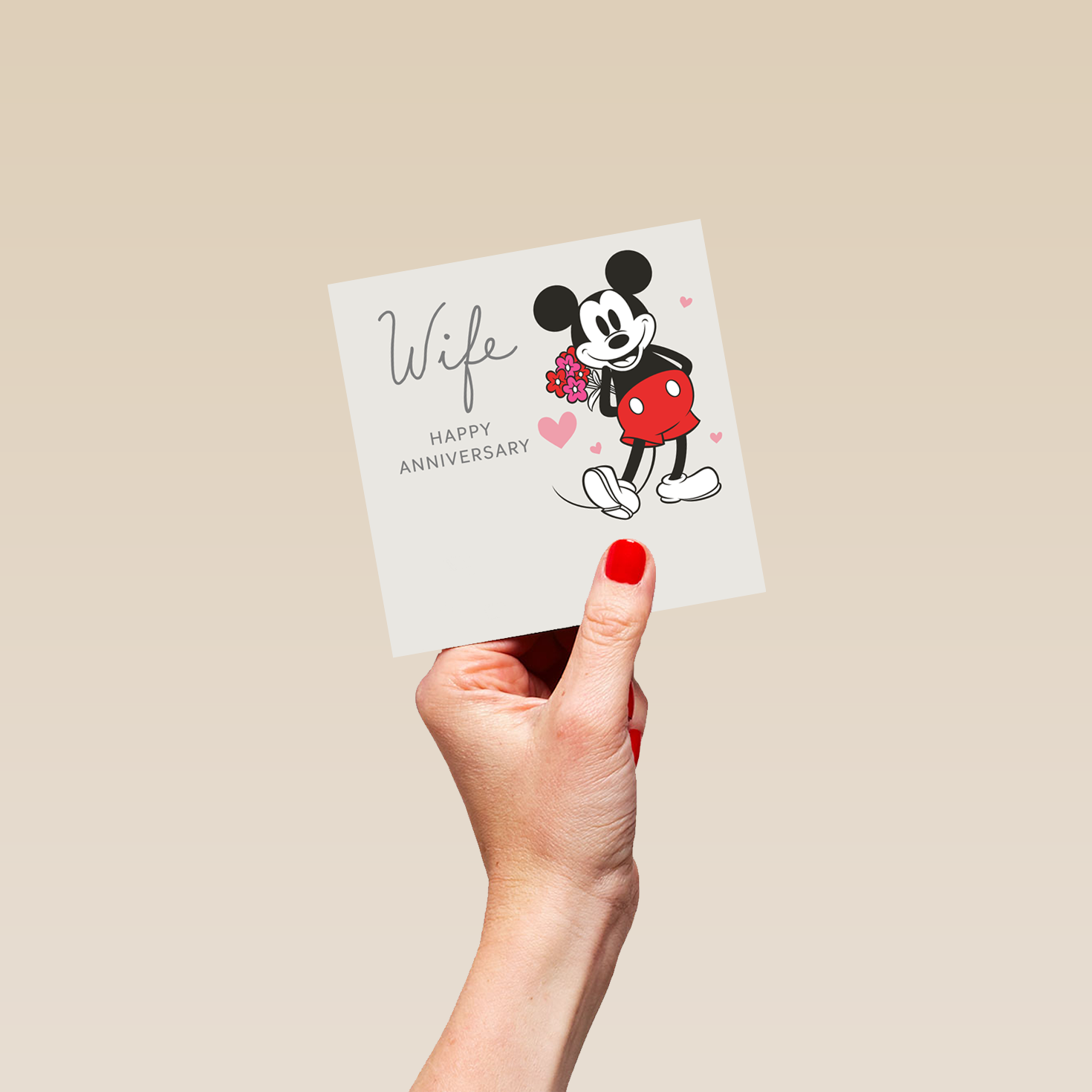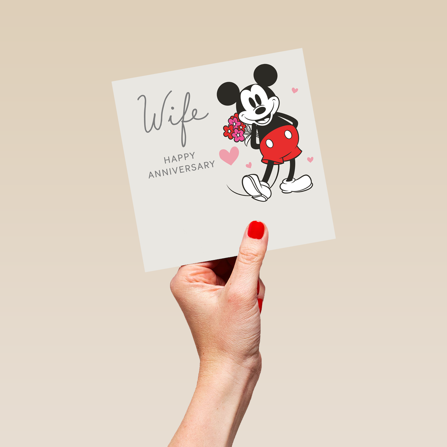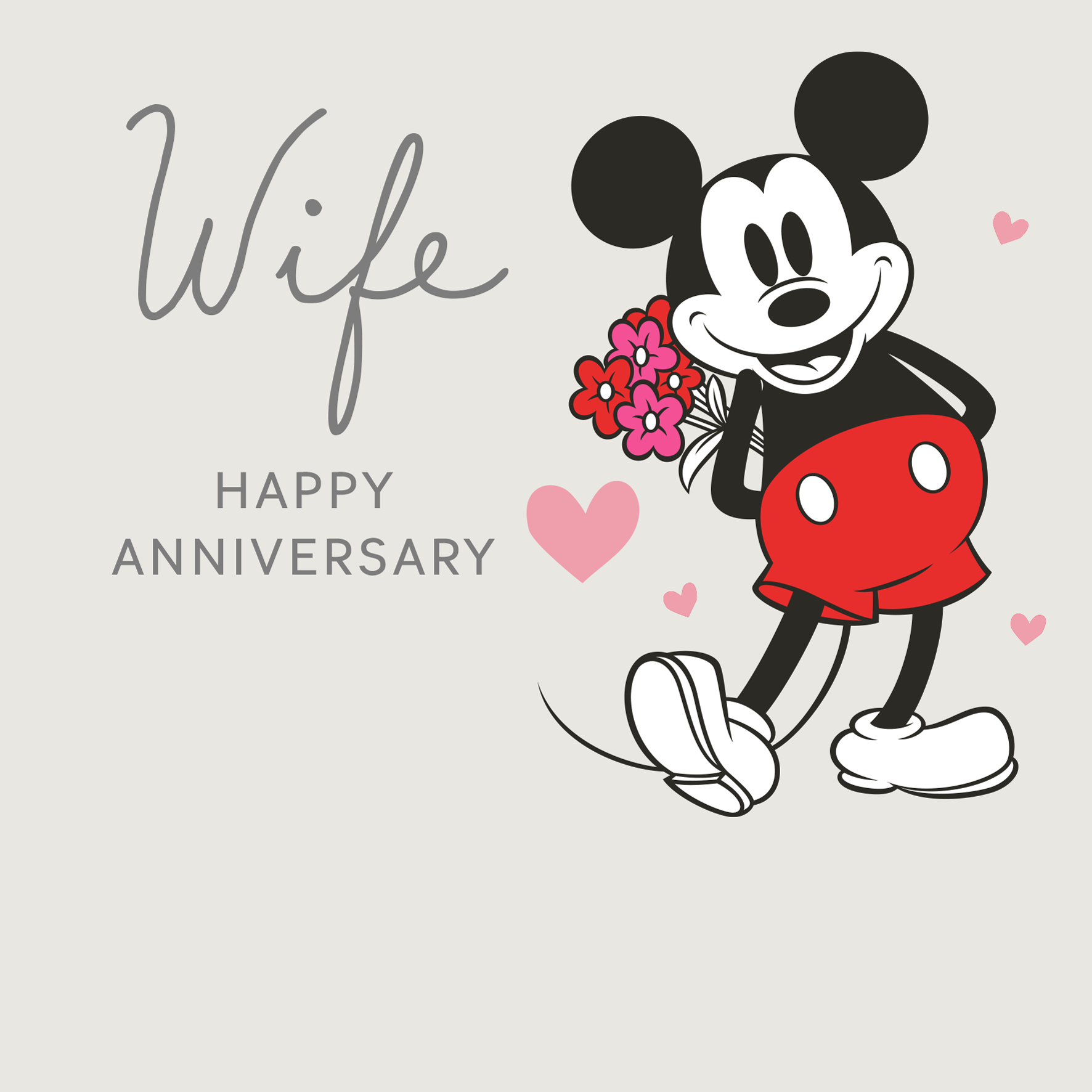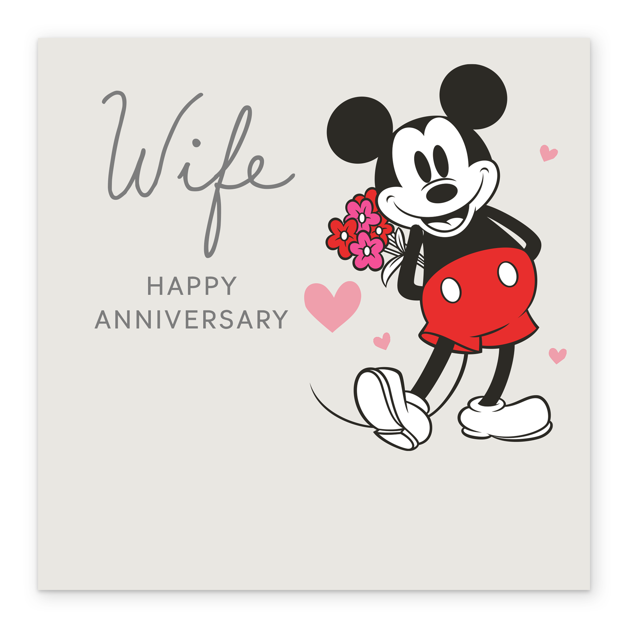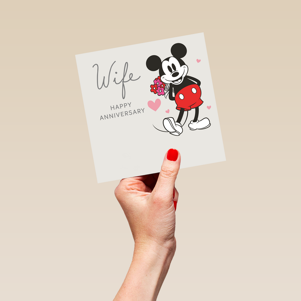 Printed on premium-quality board, this card features a cute illustration of Disney's Mickey Mouse, with the message ‘Wife, Happy Anniversary', space to personalise a name, and comes complete with a co-ordinating white envelope.