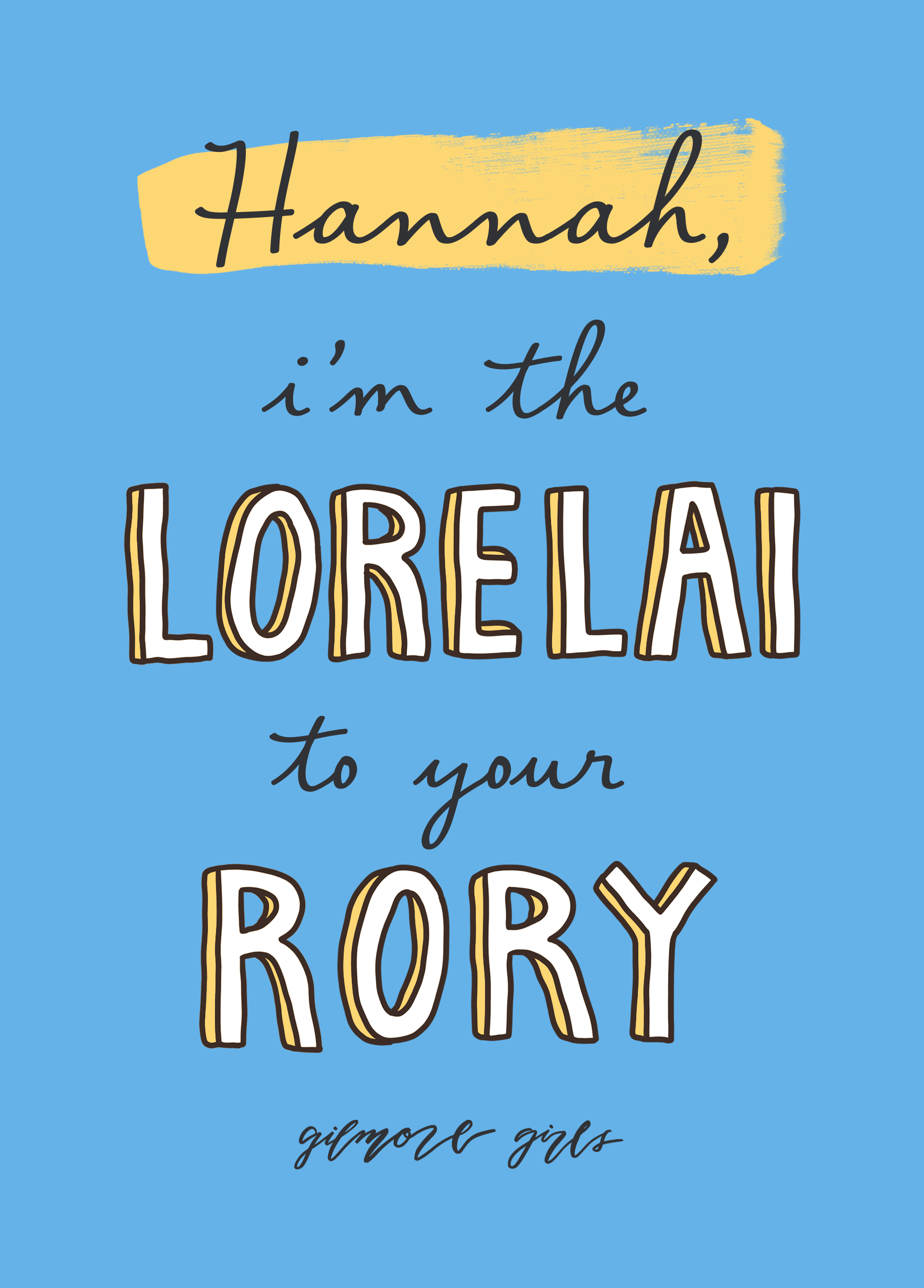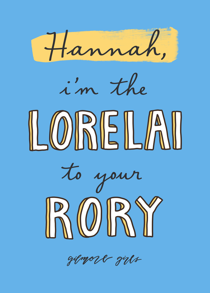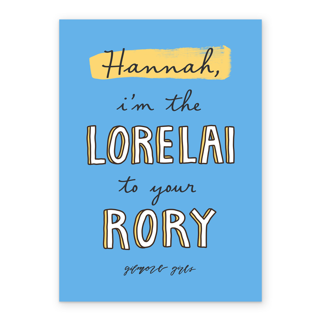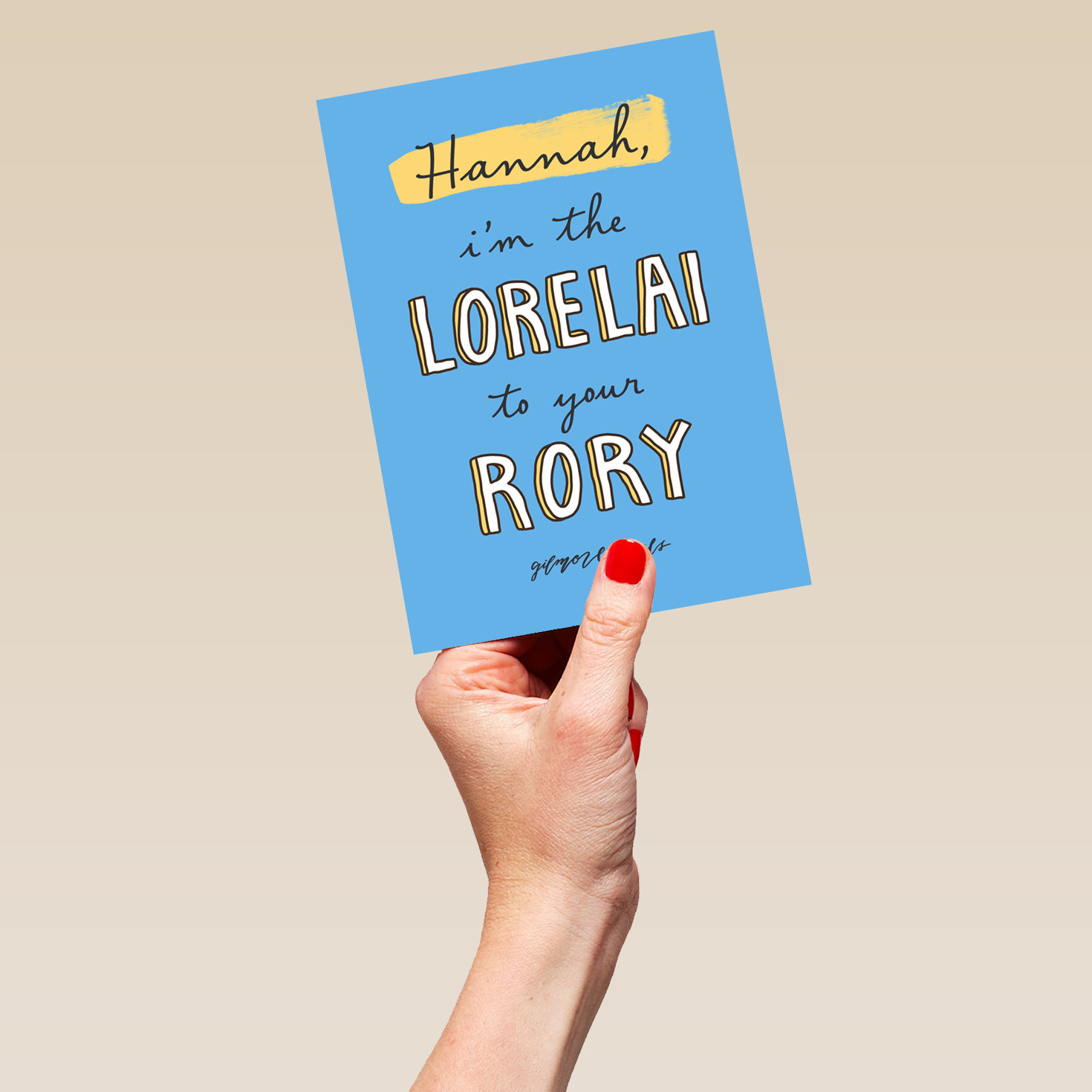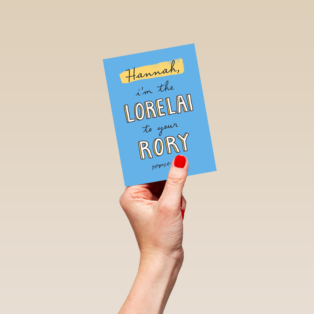 Printed on premium-quality board, this card features Blue background with a funny Gilmore Girls inspired word art, with the message ‘I'm the Lorelai to your Rory', space to personalise a name, and comes complete with a co-ordinating white envelope.