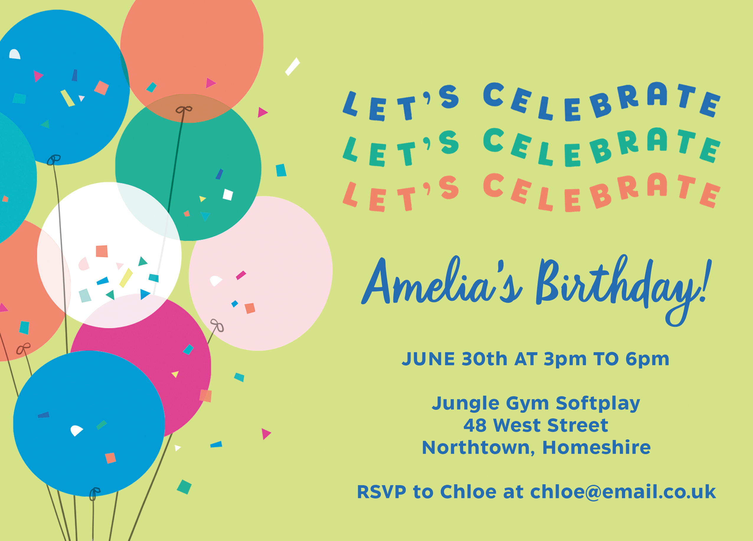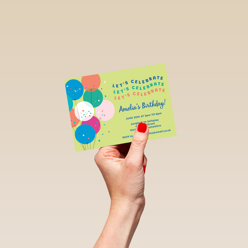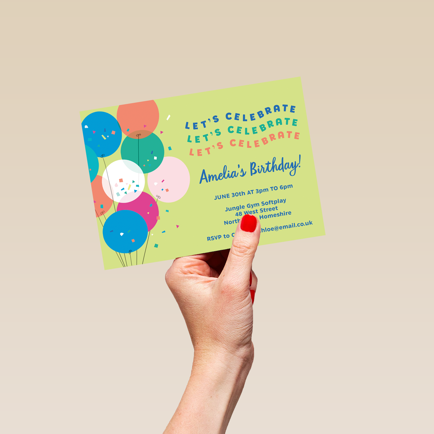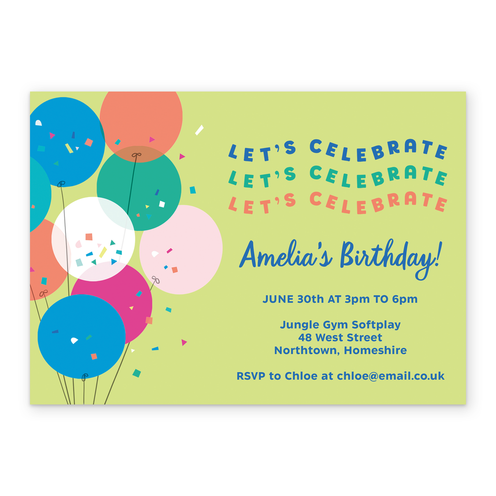 Printed on premium-quality board, this card features editable space for a date, address and contact details, a colourful balloon with fun confetti design, with the message 'Let's Celebrate [Name]'s Birthday!', space to personalise a name, and comes complete with a co-ordinating white envelope.