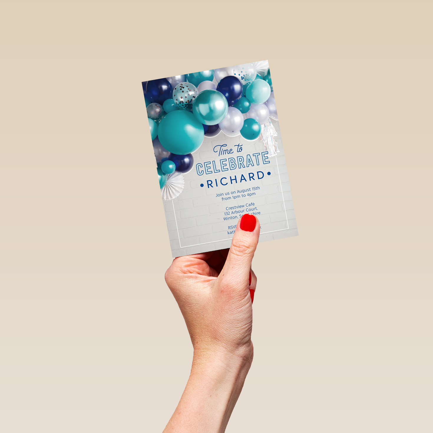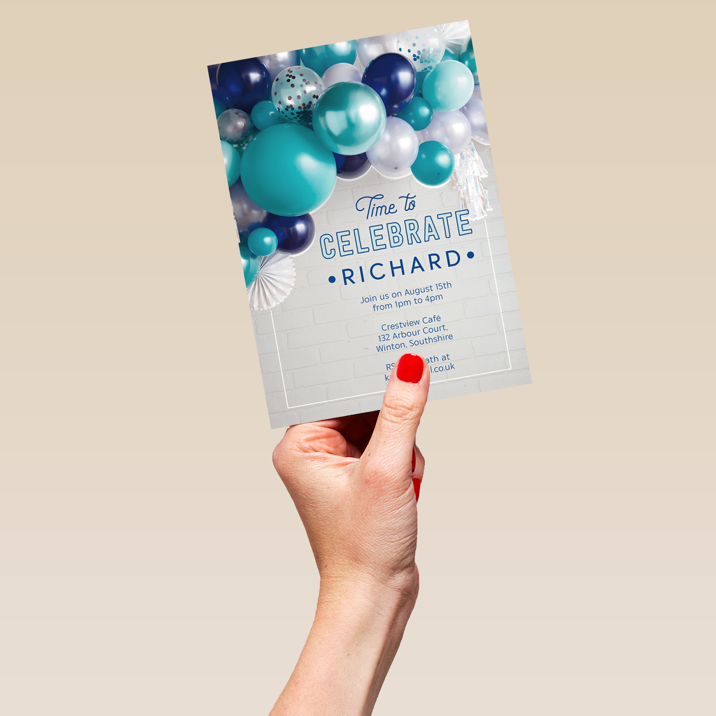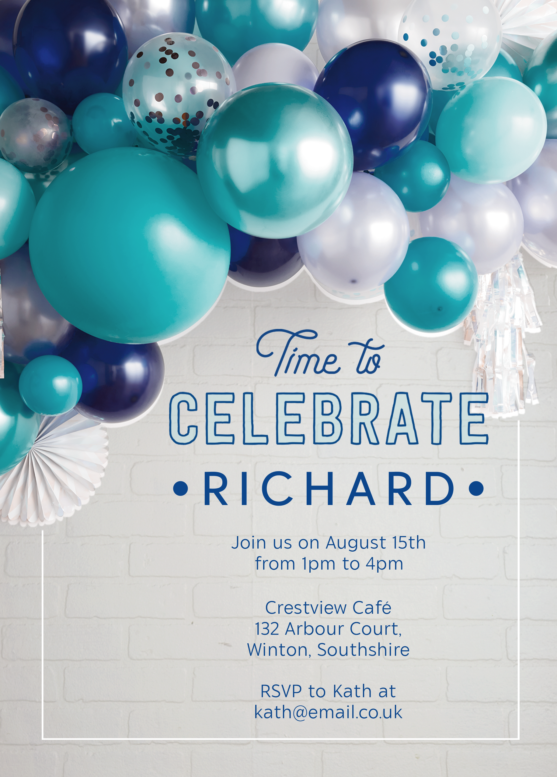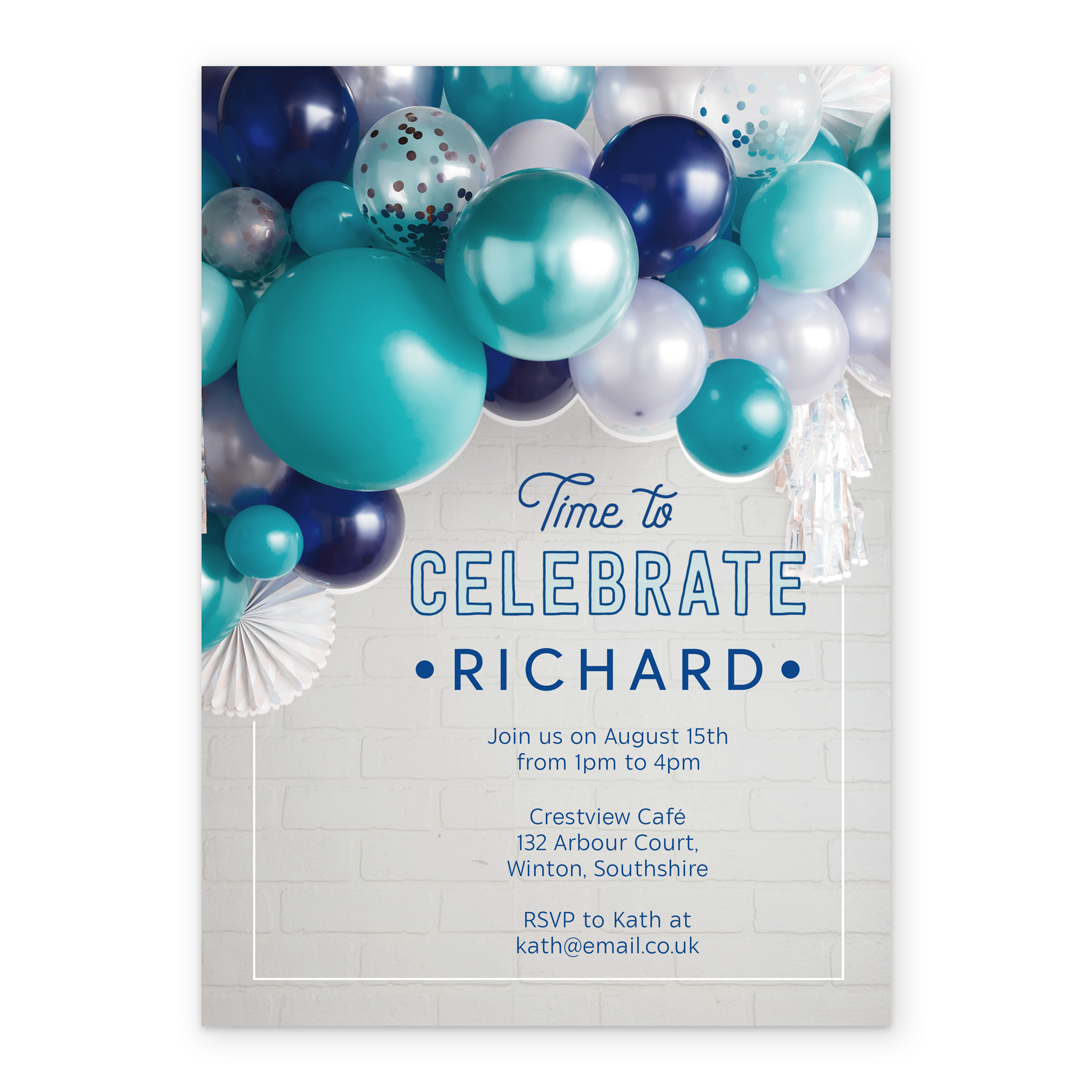 Printed on premium-quality board, this card features editable space for a date, address and contact details, blue balloon display design, with the message 'Time to celebrate [Name]', space to personalise a name, and comes complete with a co-ordinating white envelope.