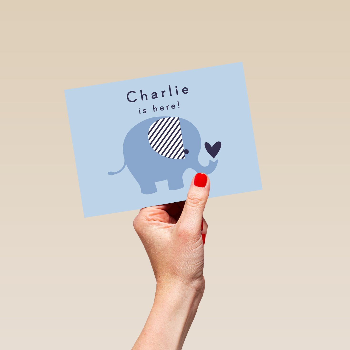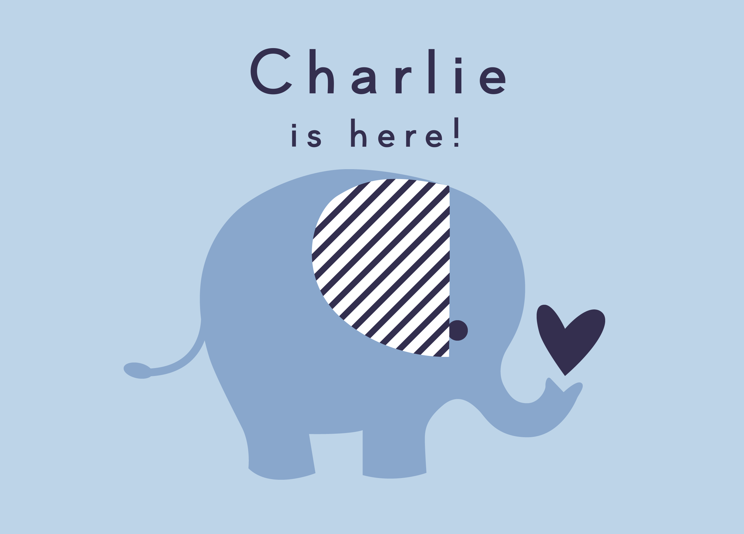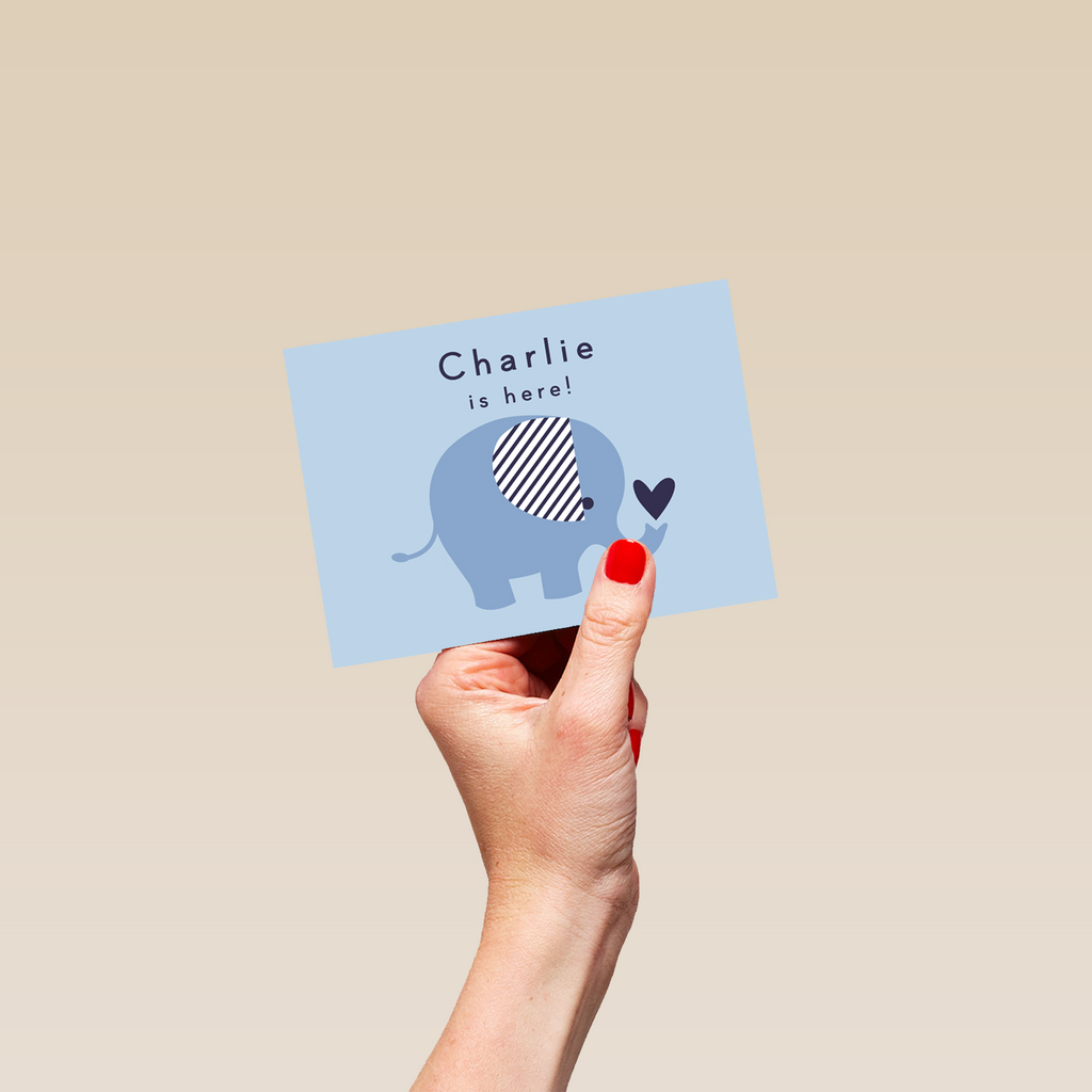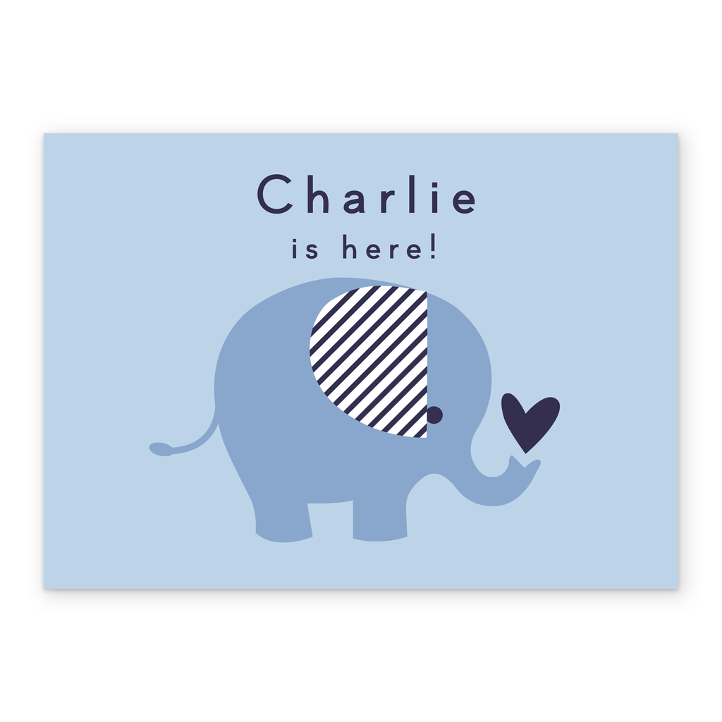Printed on premium-quality board, this card features a cute blue elephant design with a red heart, with the message '[Name] is here!', space to personalise your message, and comes complete with a co-ordinating white envelope.