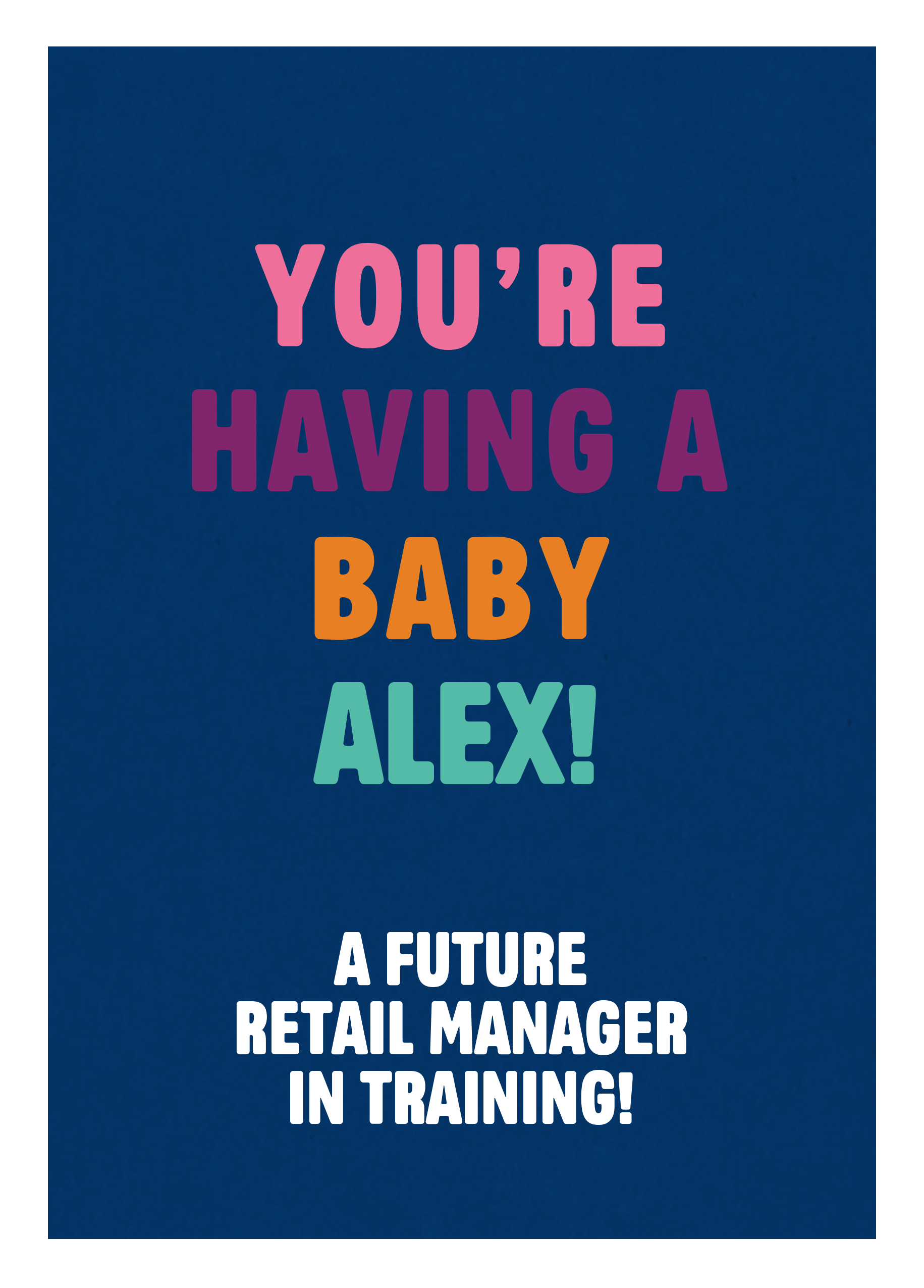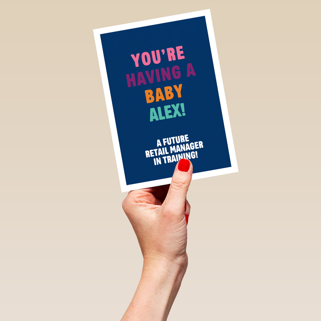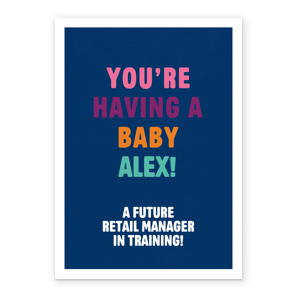Printed on premium-quality board, this card features a funny and bold text based design, with the message 'You're having a baby! A future [Job Position] in training!', space to personalise your message, and comes complete with a co-ordinating white envelope.