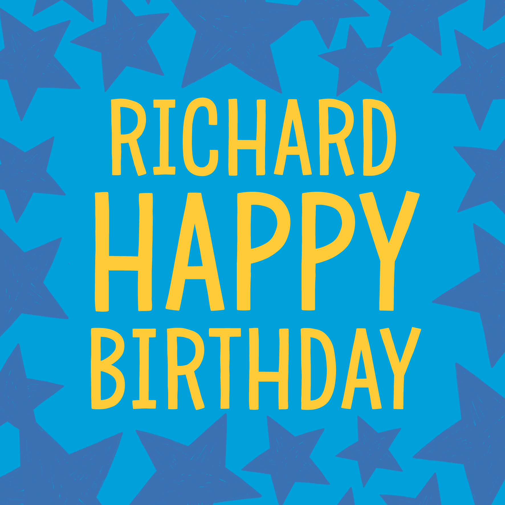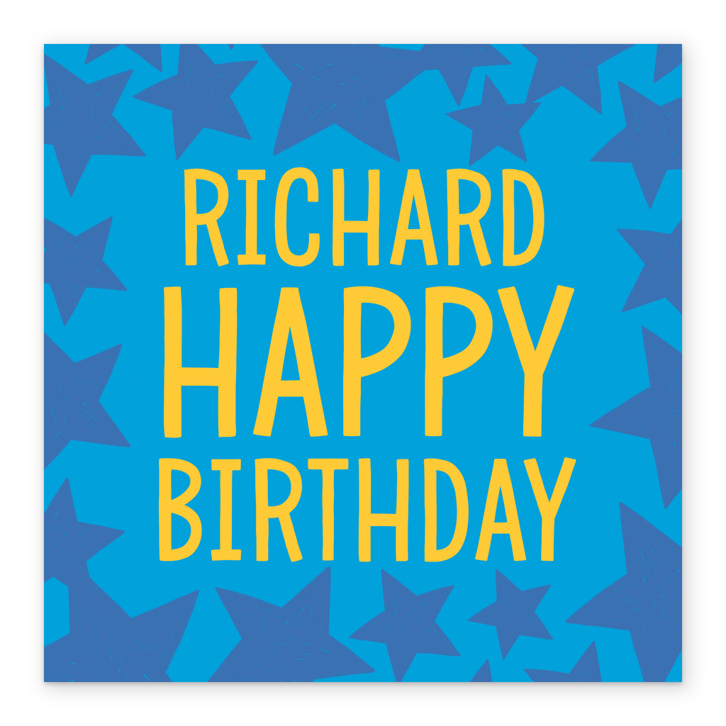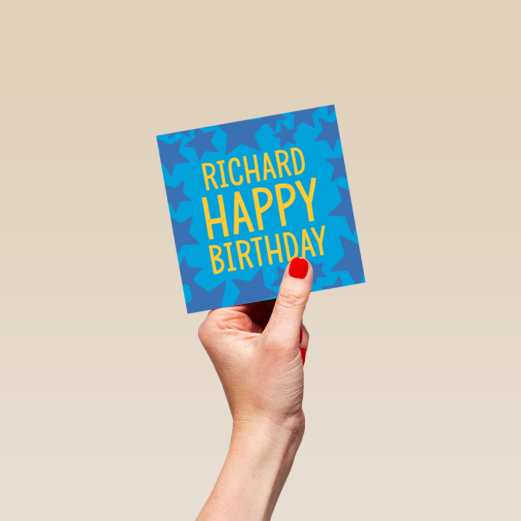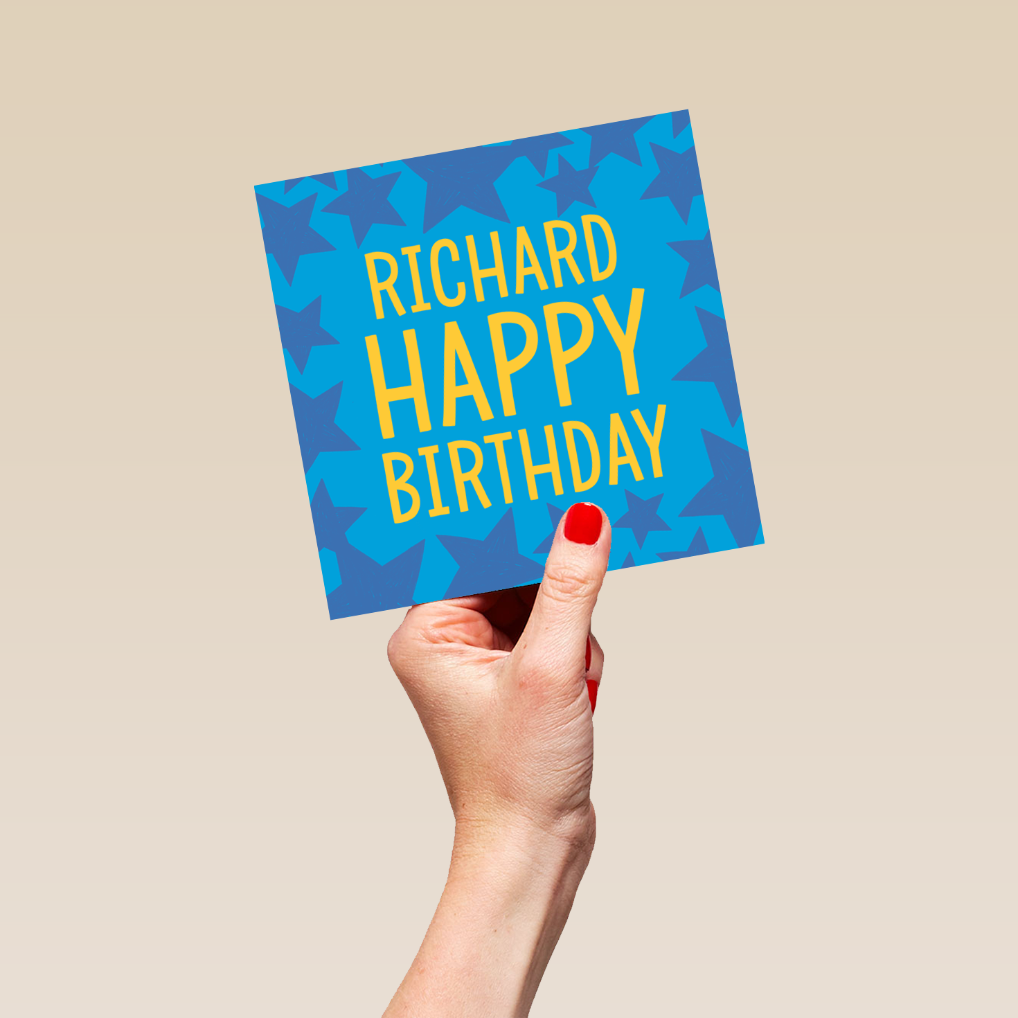 Printed on premium-quality board, this card features a blue background with blue stars border, with the message '[NAME] Happy Birthday', space to personalise a name, and comes complete with a co-ordinating white envelope.