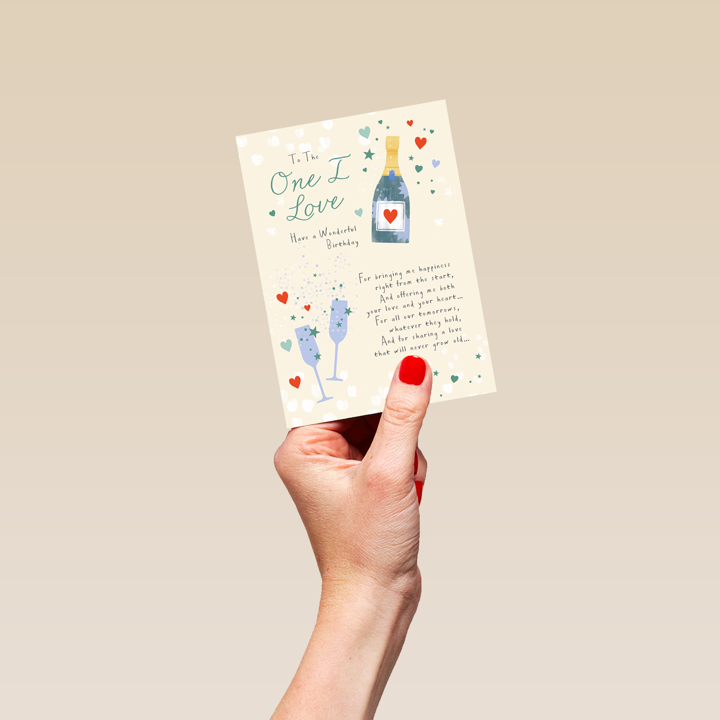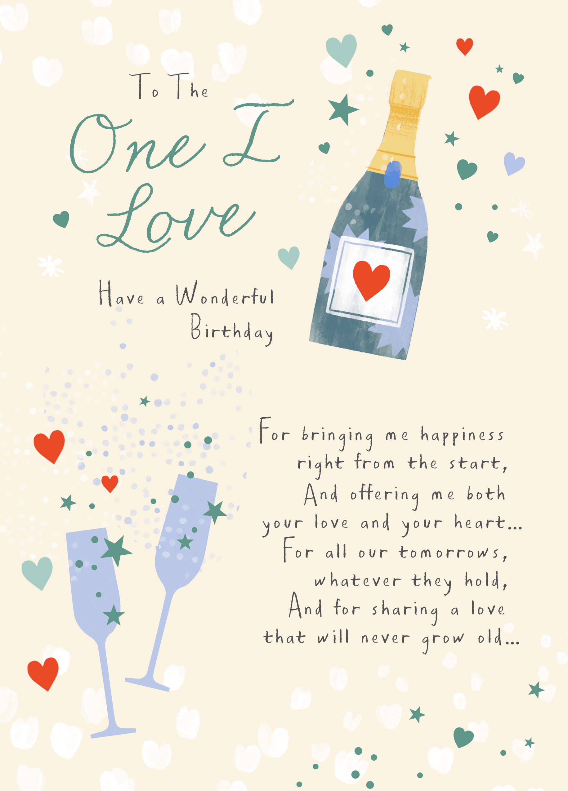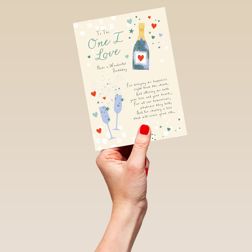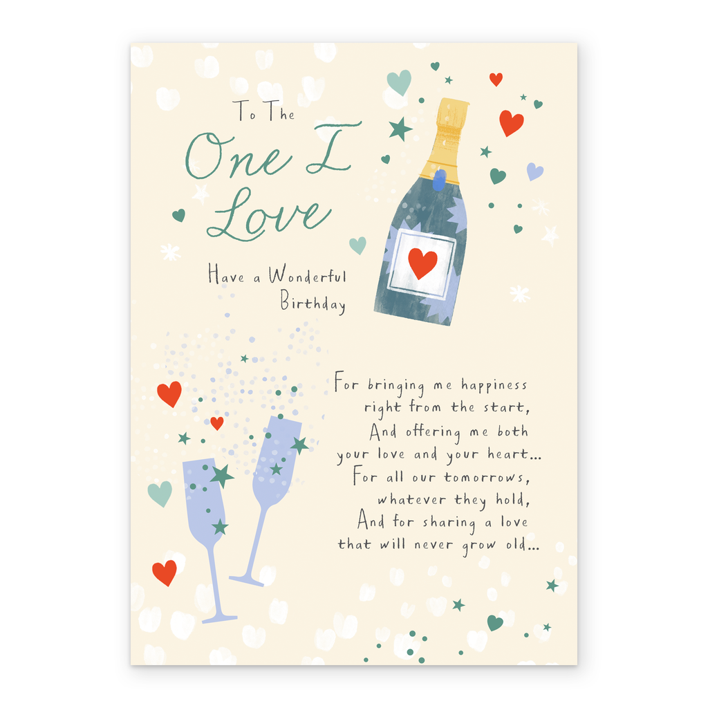 Printed on premium-quality board, this card features a champagne bottle and glasses with hearts, with the message 'To the one I love. Have a wonderful birthday. For bringing me happiness right from the start, And offering me both your love and your heart… For all our tomorrows, whatever they hold, And for sharing a love that will never grow old…', and comes complete with a co-ordinating white envelope.