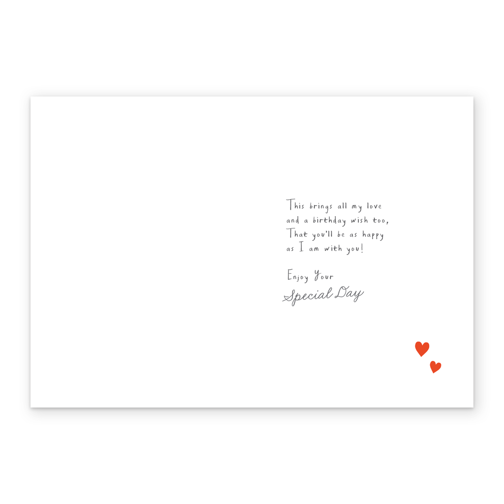 Message inside reads: This brings all my love and a birthday wish too, That you'll be as happy with as I am with you! Enjoy your special day