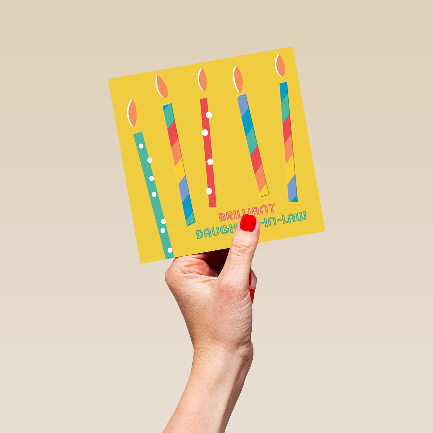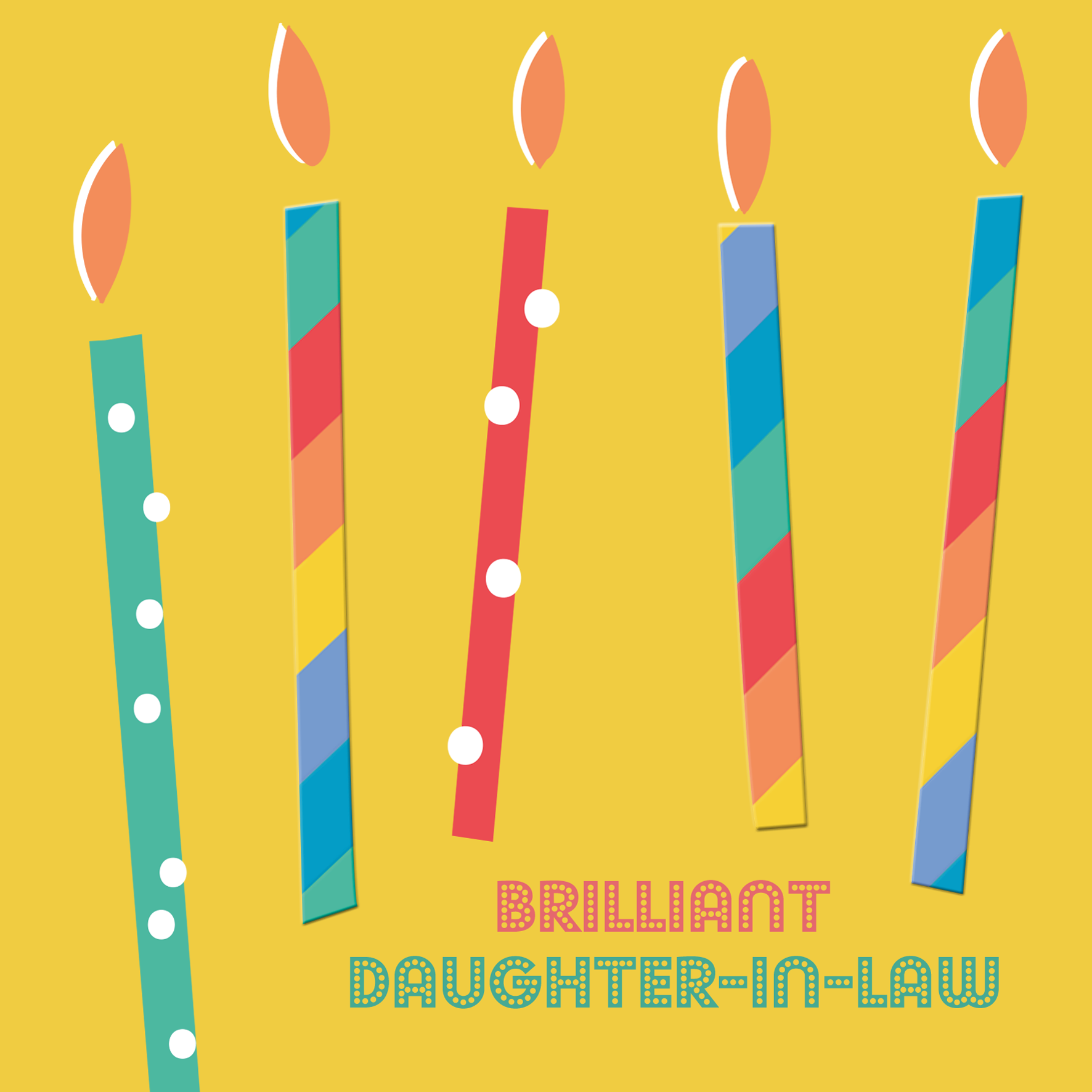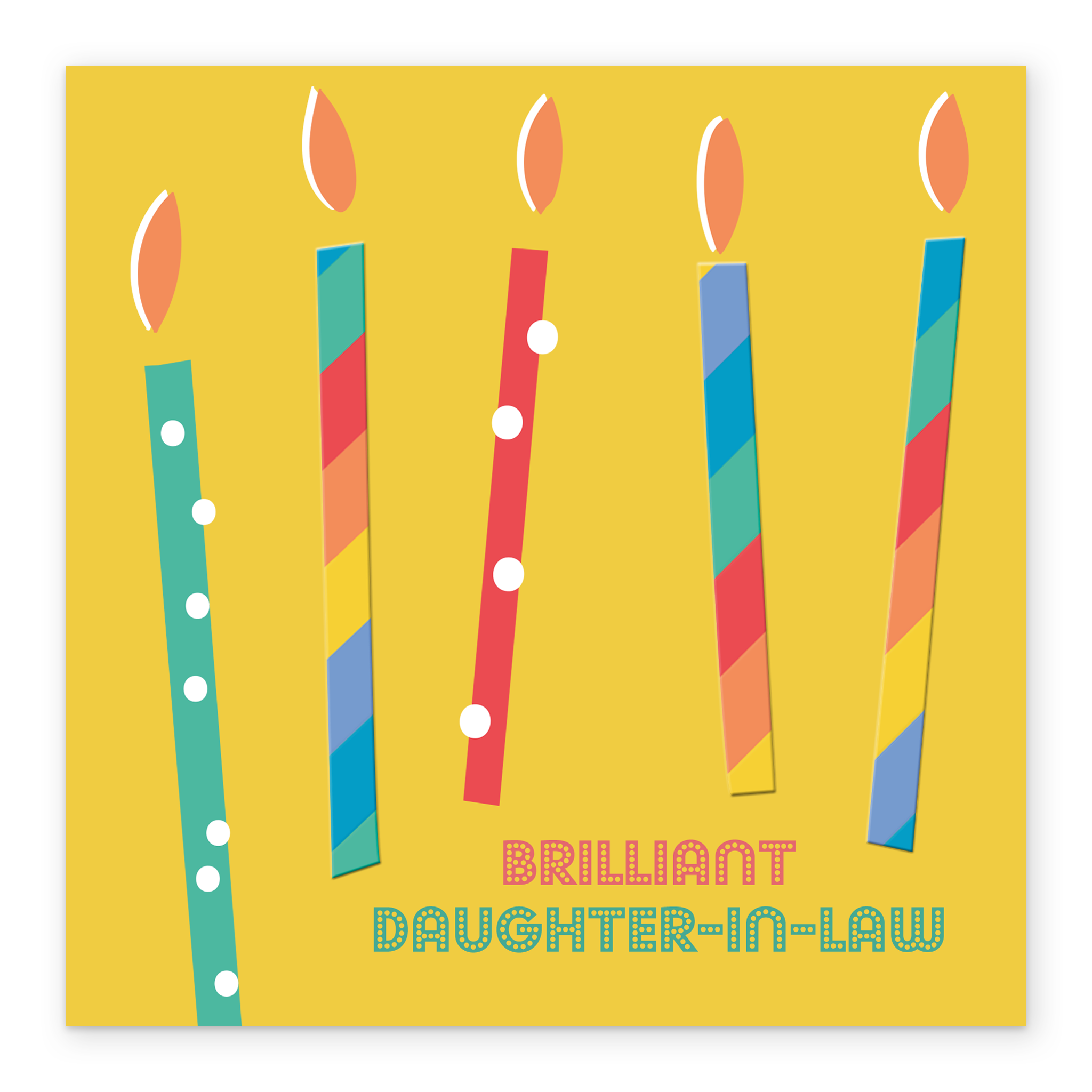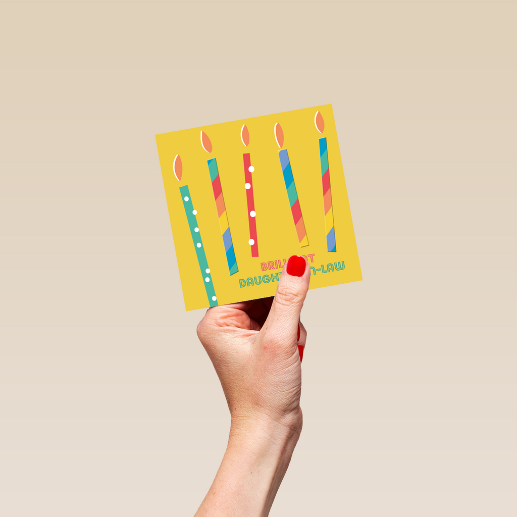 Printed on premium-quality board, this card features colourful and contemporary designed candles, with the message 'Brilliant Daughter-In-Law', space to personalise your message, and comes complete with a co-ordinating white envelope.
