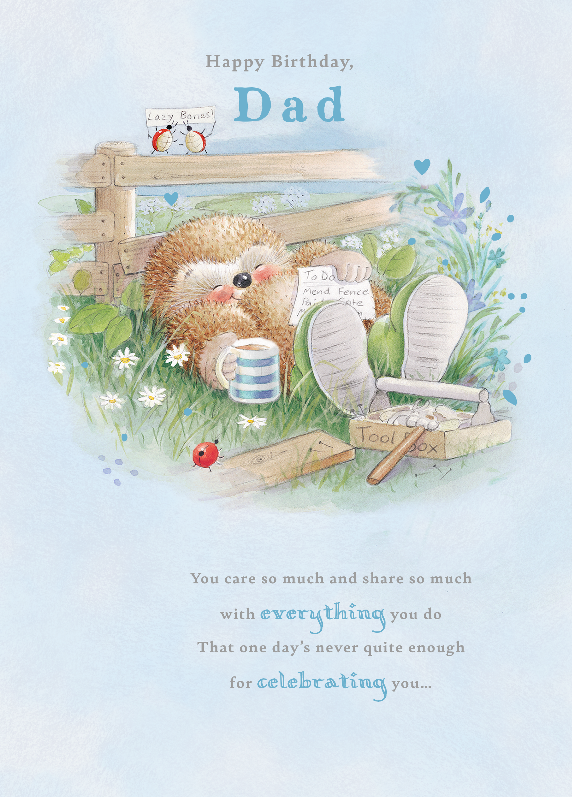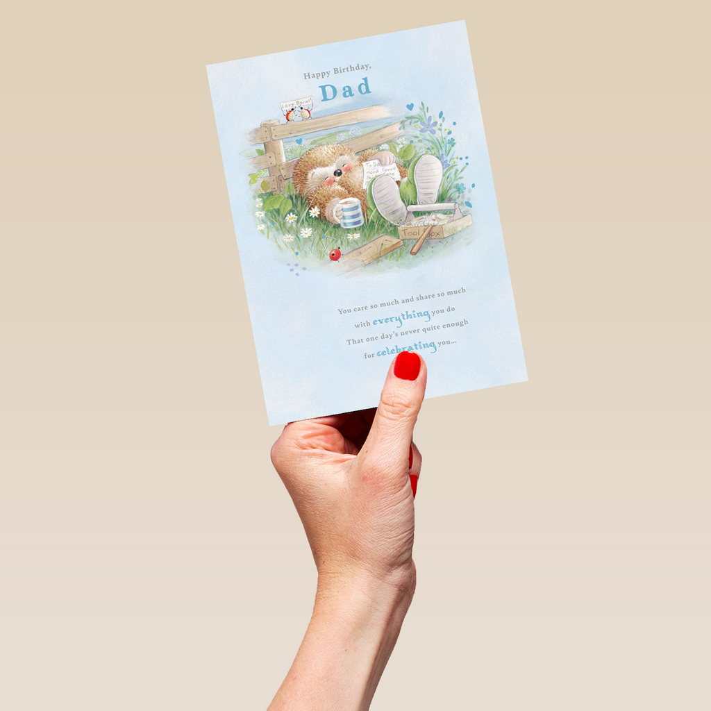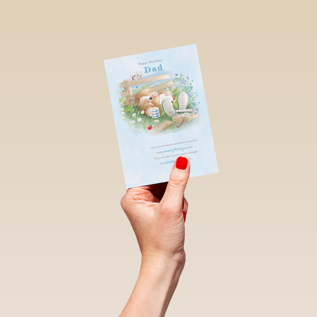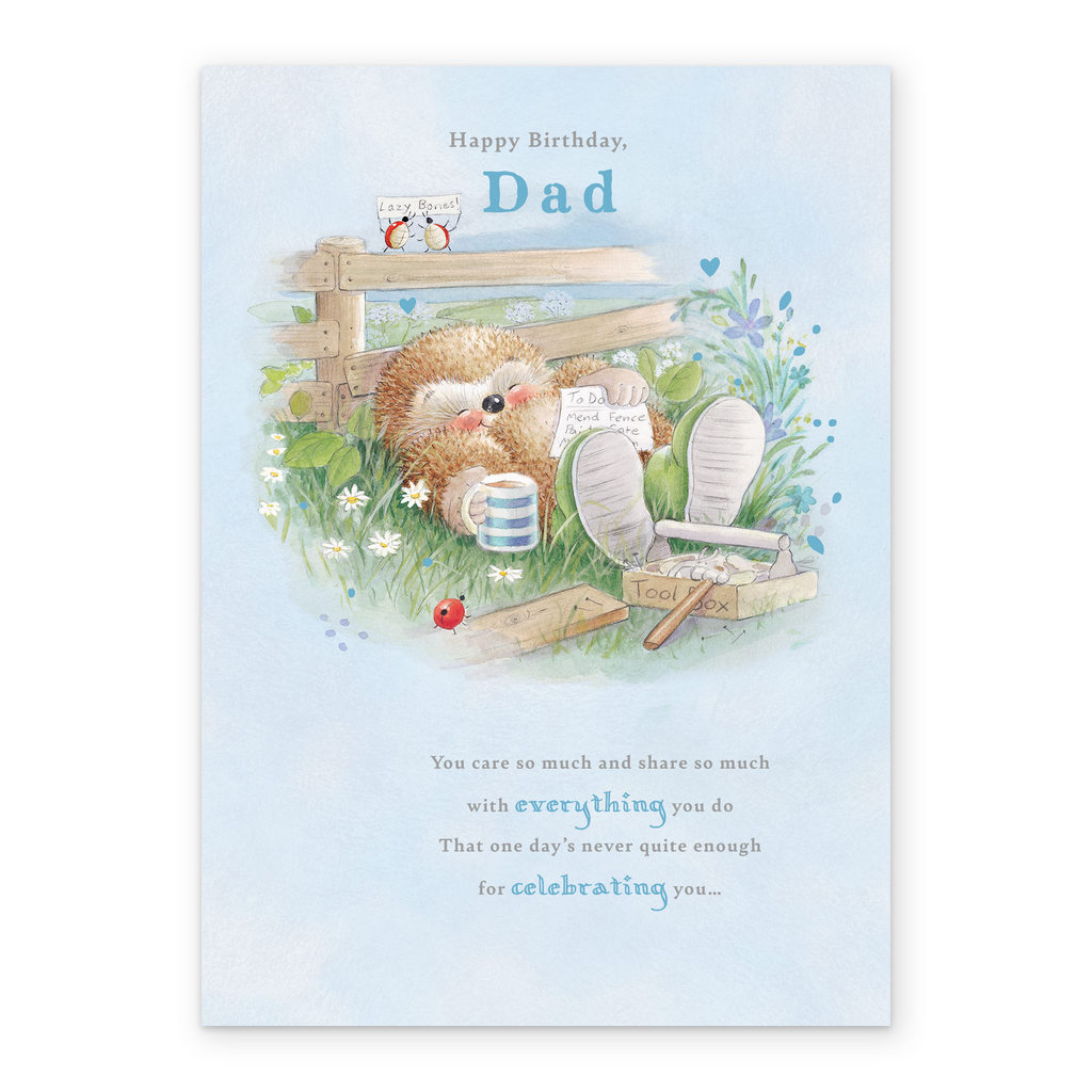 Printed on premium-quality board, this card features an adorable hedgehog from Country Companions relaxing in a field, with the message 'Happy birthday, Dad. You care so much and share so much with everything you do, that one day's never quite enough for celebrating you…', space to personalise a name, and comes complete with a co-ordinating white envelope.