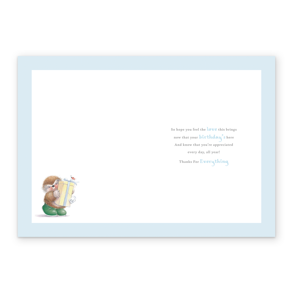 Message inside reads: So hope you feel the love this brings now that your birthday's here and know that you're appreciated every day, all year! Thanks for everything