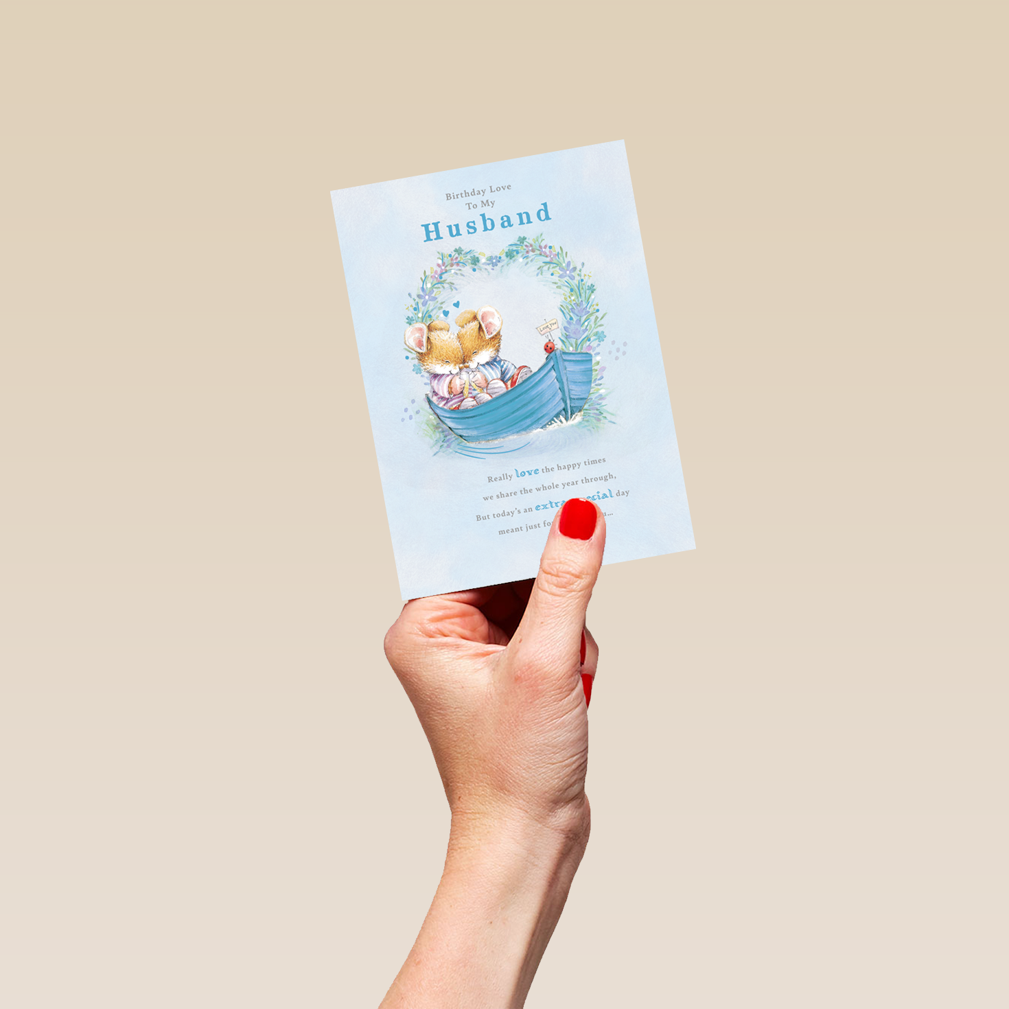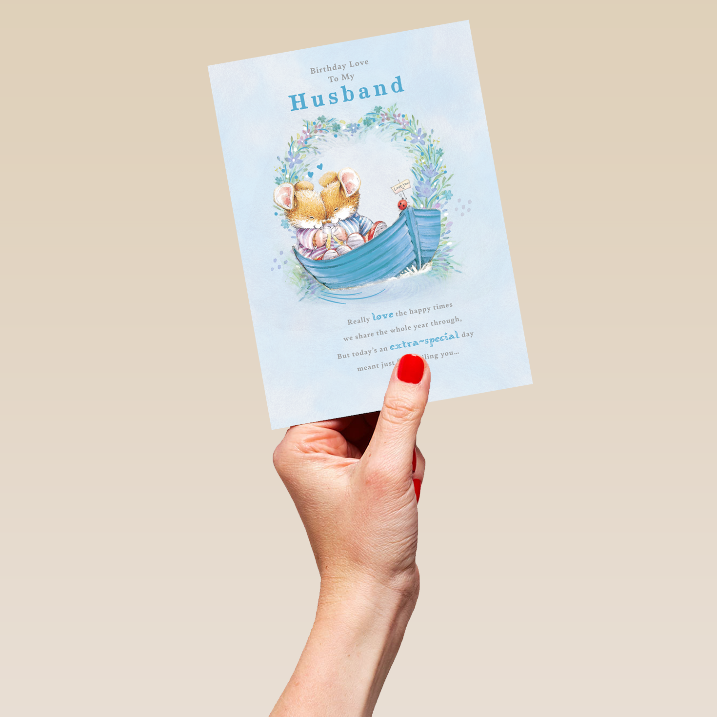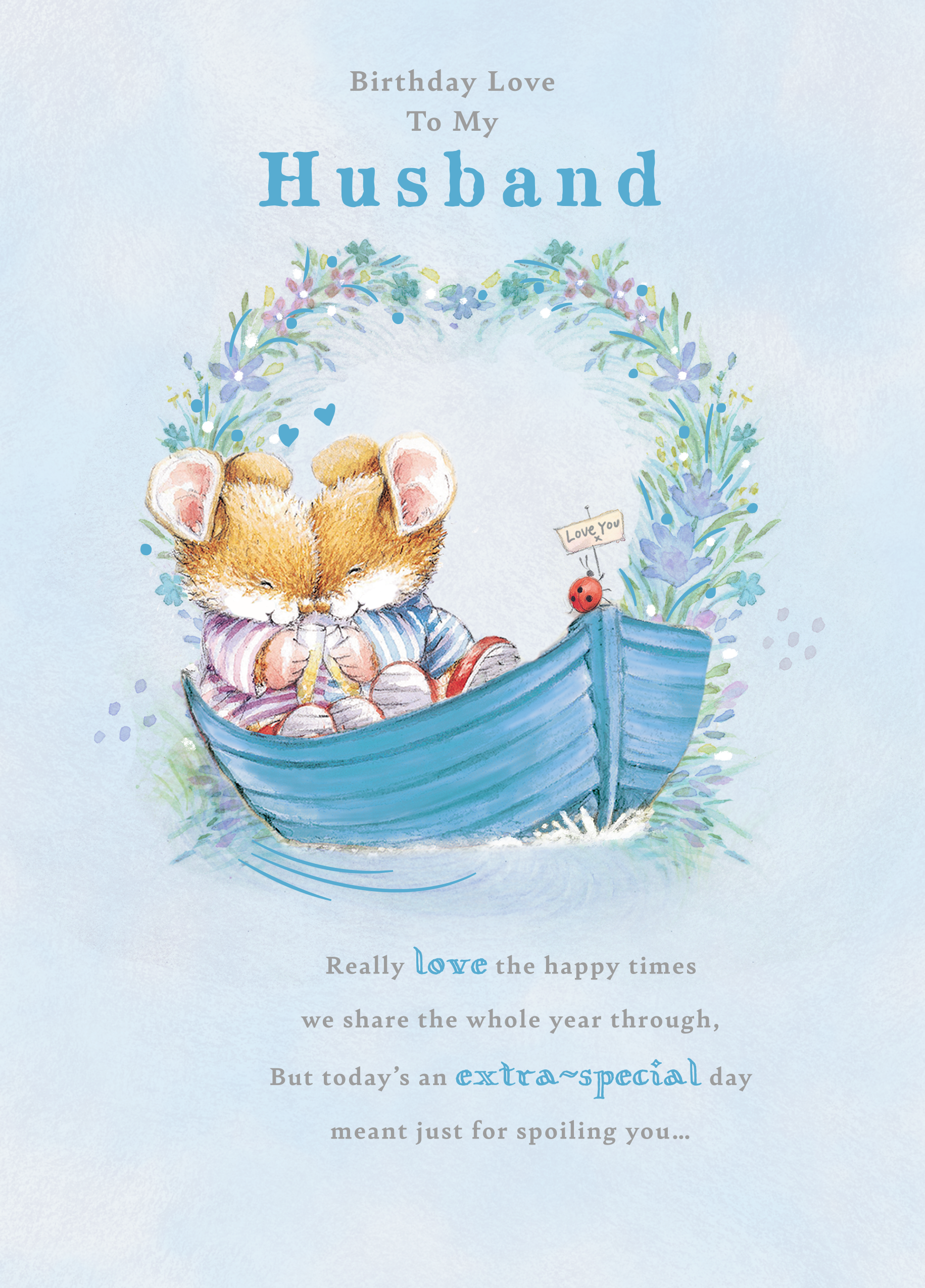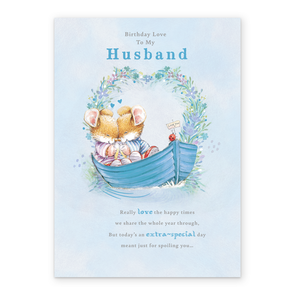 Printed on premium-quality board, this card features two sweet mice from Country Companions cuddling in a boat, with the message 'Birthday love to my husband. Really love the happy times we share the whole year through, but today's an extra-special day meant just for spoiling you…', space to personalise a name, and comes complete with a co-ordinating white envelope.