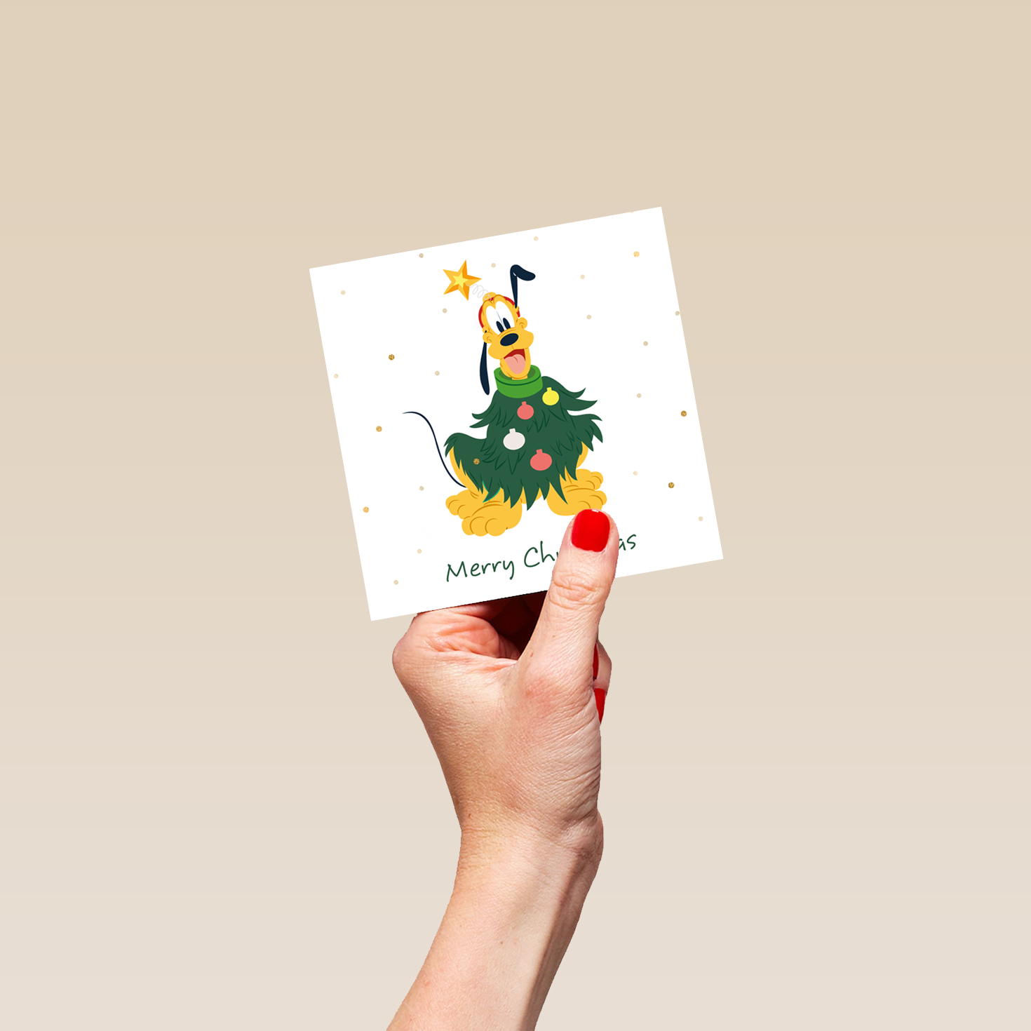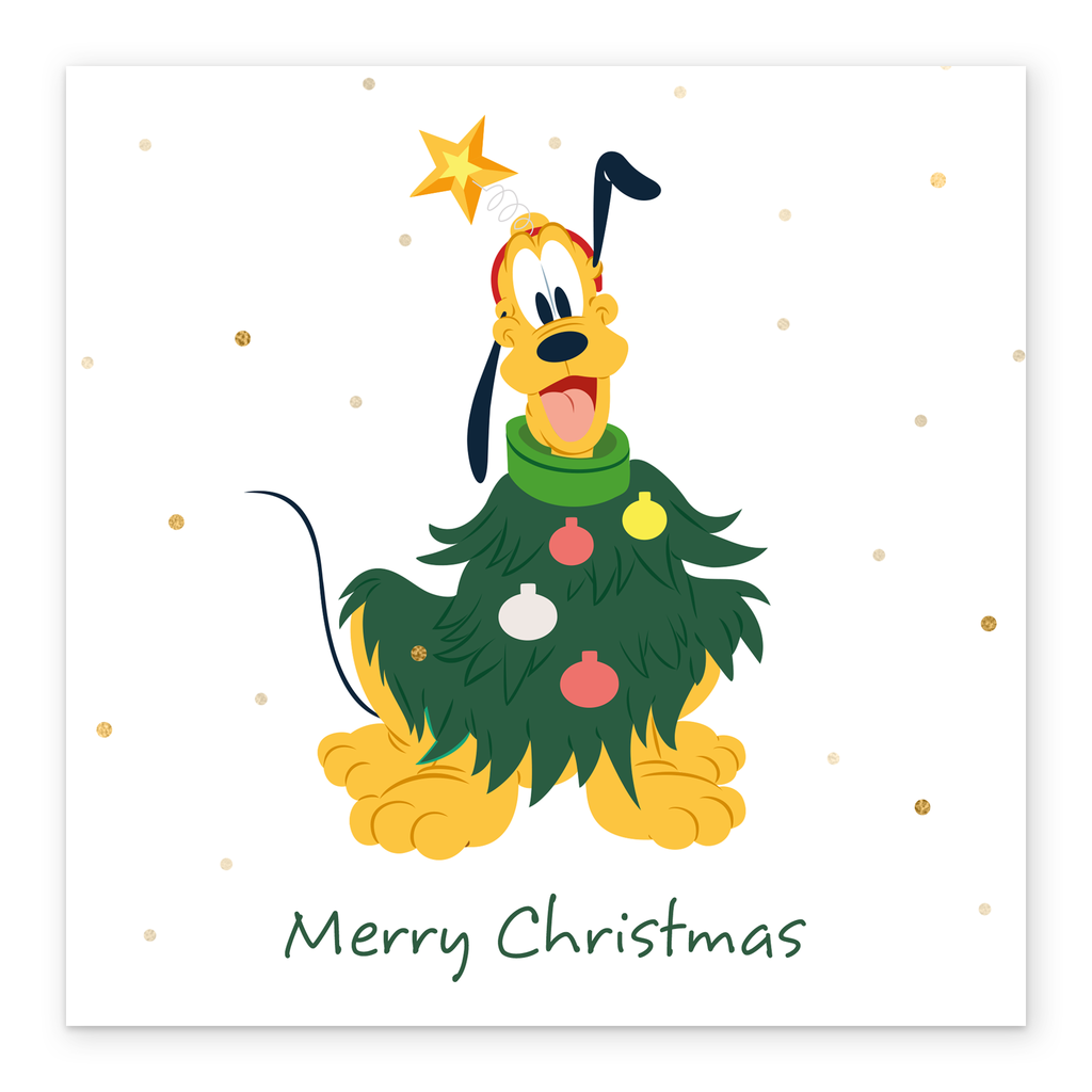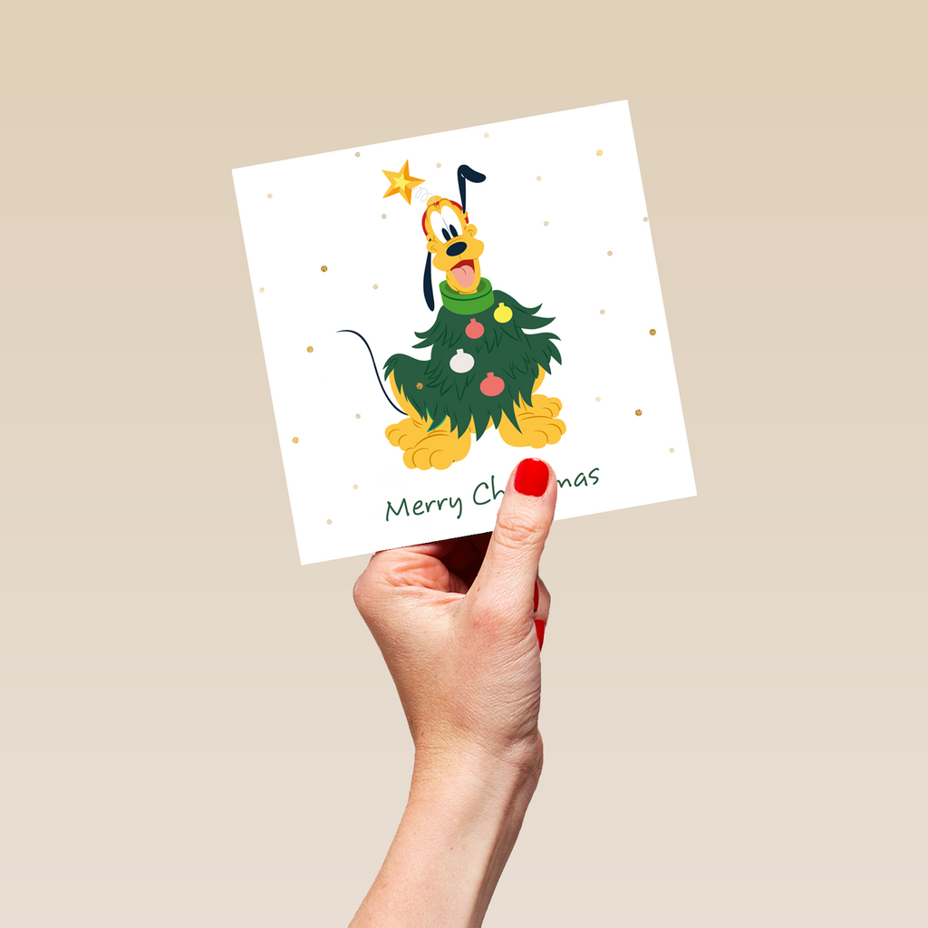 Printed on premium-quality board, this card features an adorable Pluto dressed as a Christmas tree with a star on his head, with the message 'Merry Christmas', space to personalise a name, and comes complete with a co-ordinating white envelope.