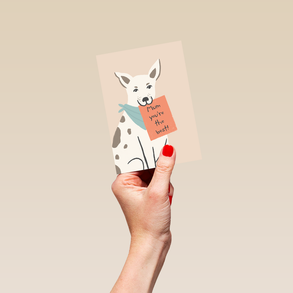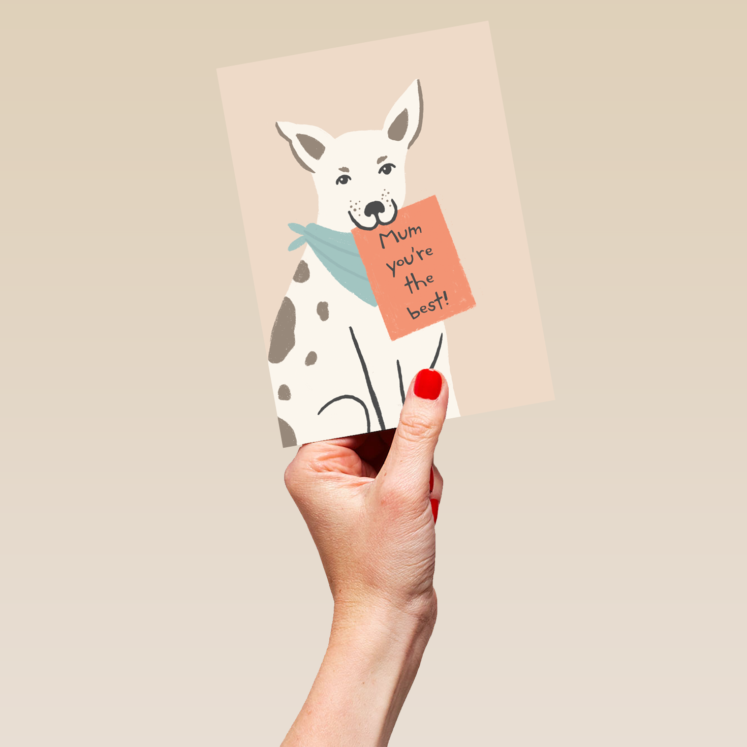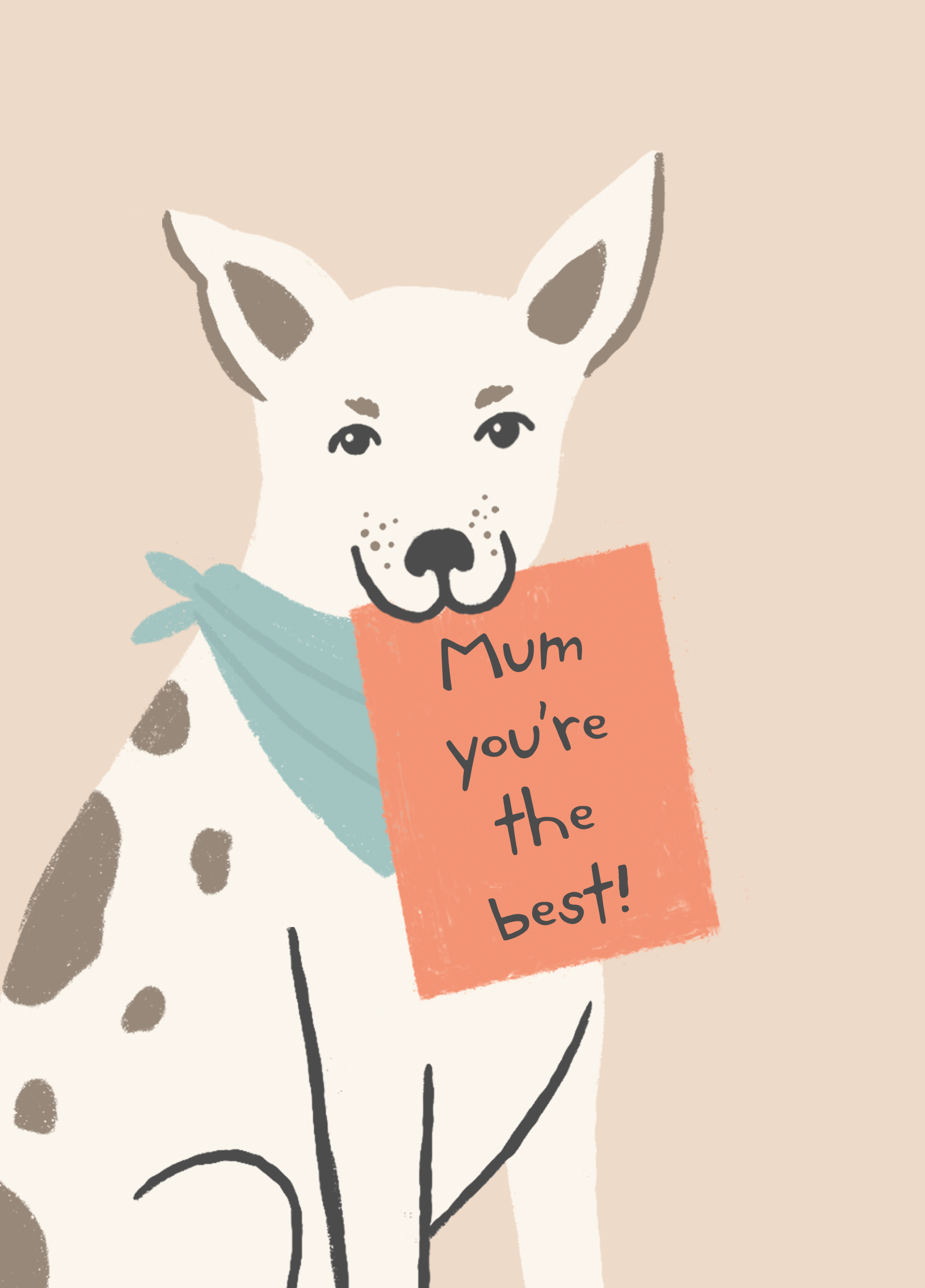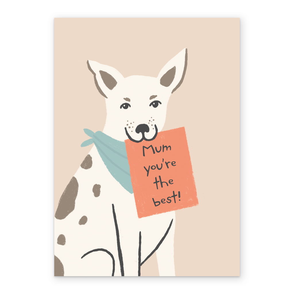 Printed on premium-quality board, this card features a cute dog with bandana illustration, with the message 'Mum you're the best!', space to personalise your message, and comes complete with a co-ordinating white envelope.