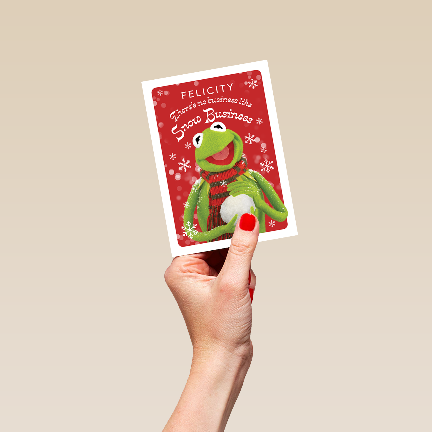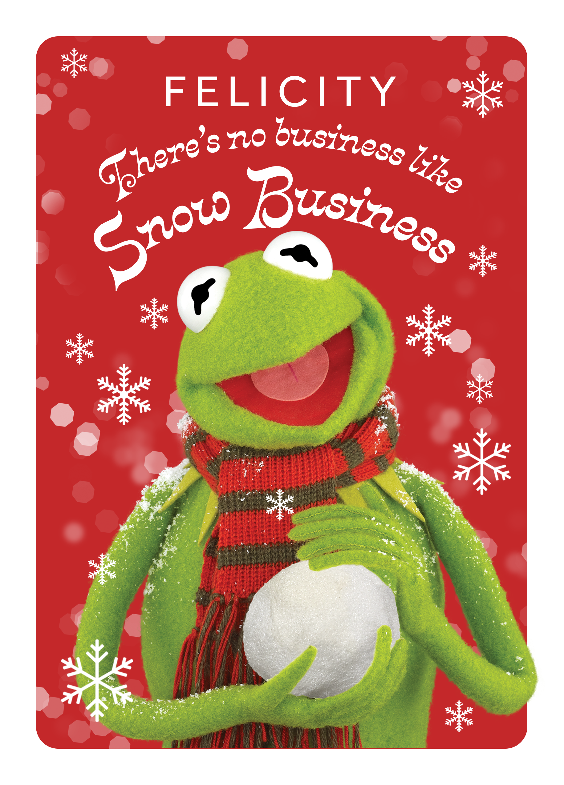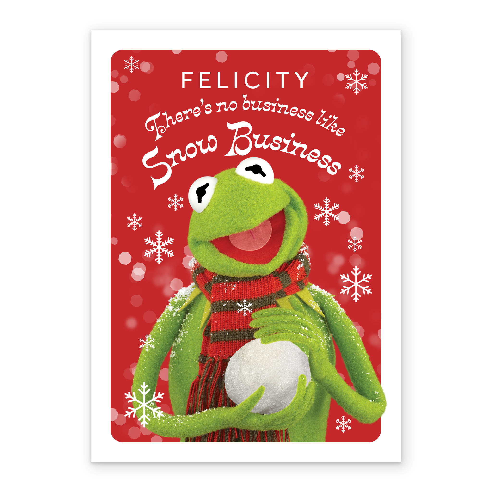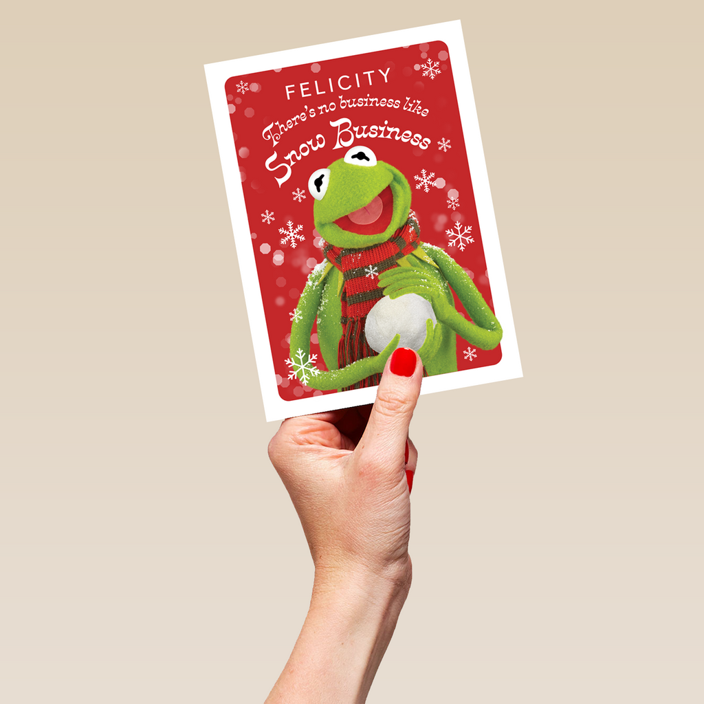 Printed on premium-quality board, this card features Kermit the frog holding a snowball with a festive background, with the message 'There's no business like Snow Business', space to personalise a name, and comes complete with a co-ordinating white envelope.