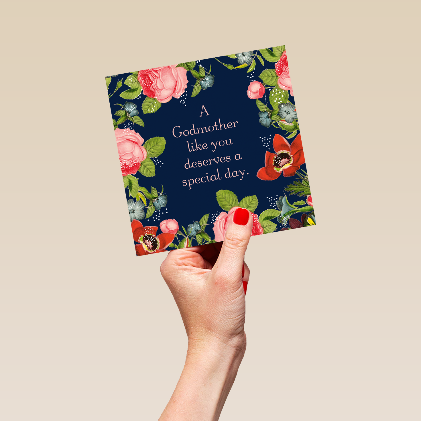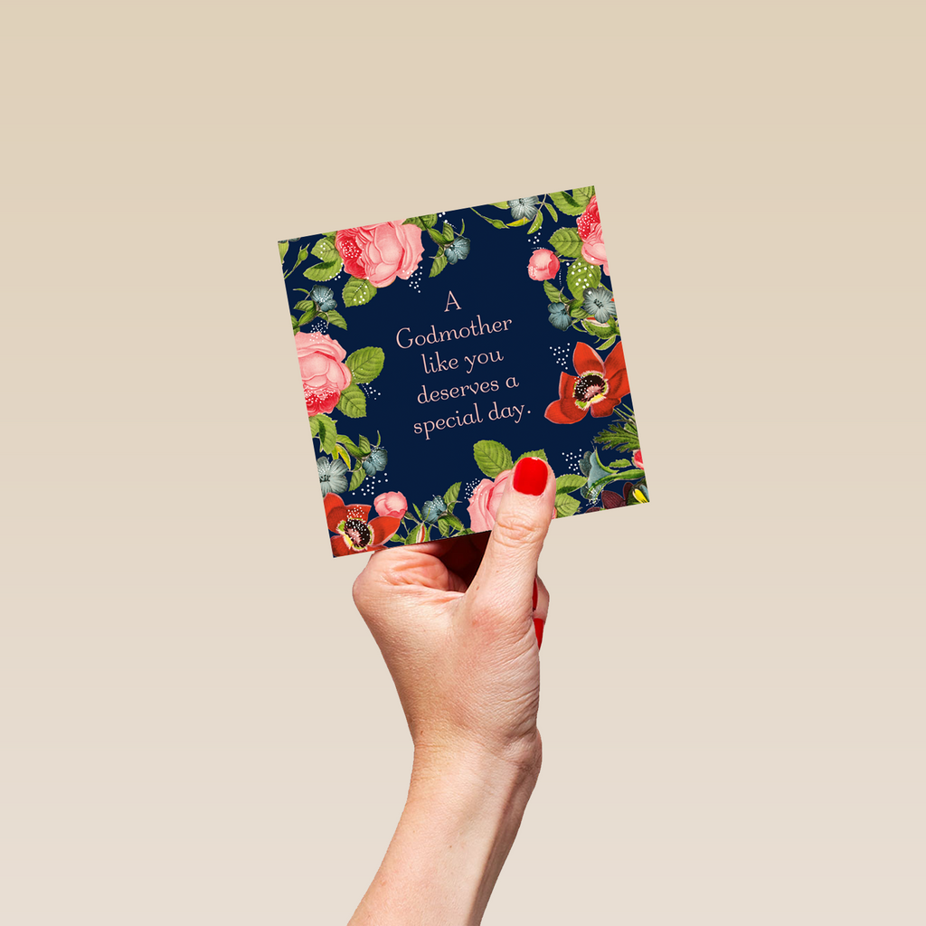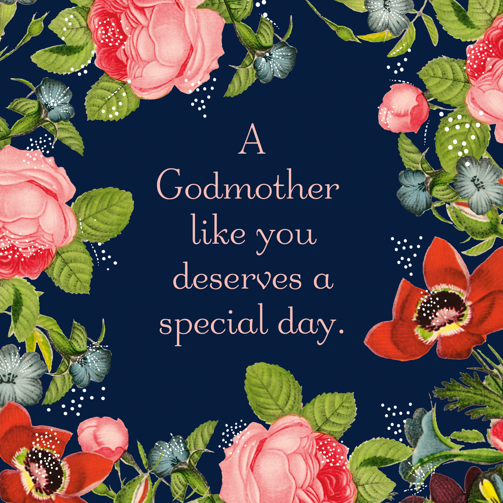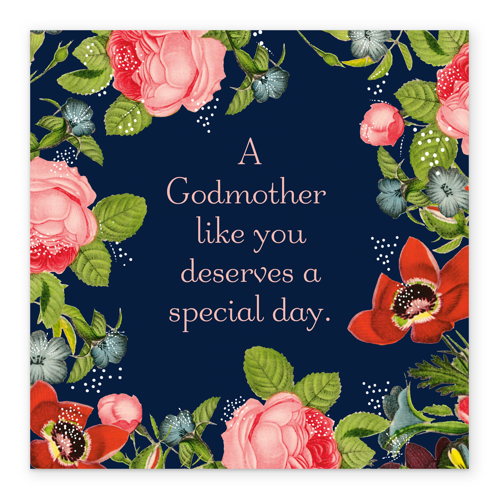 Printed on premium-quality board, this card features a vintage floral design on dark blue background, with the message 'A Godmother like you deserves a special day.', space to personalise your message, and comes complete with a co-ordinating white envelope.