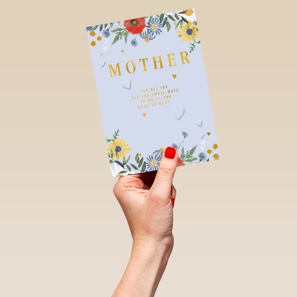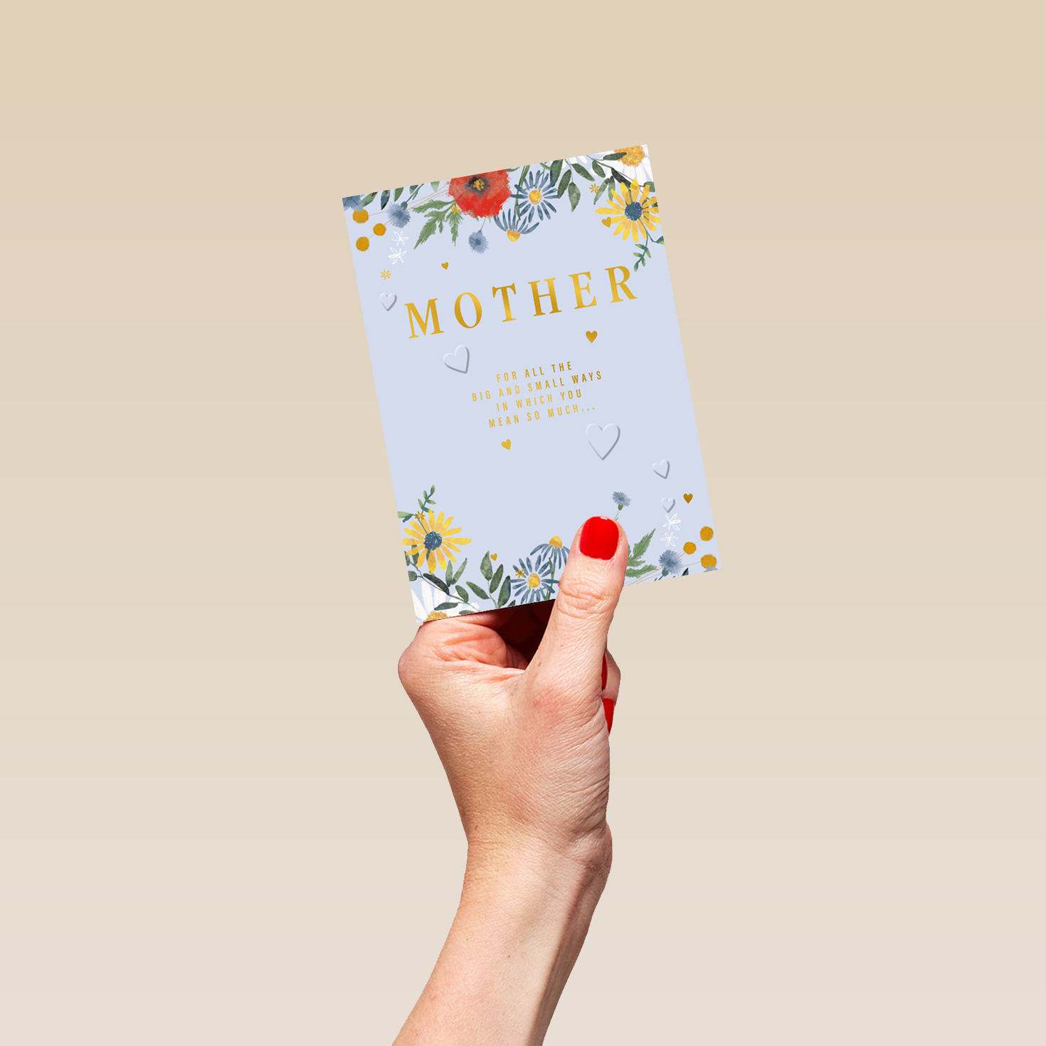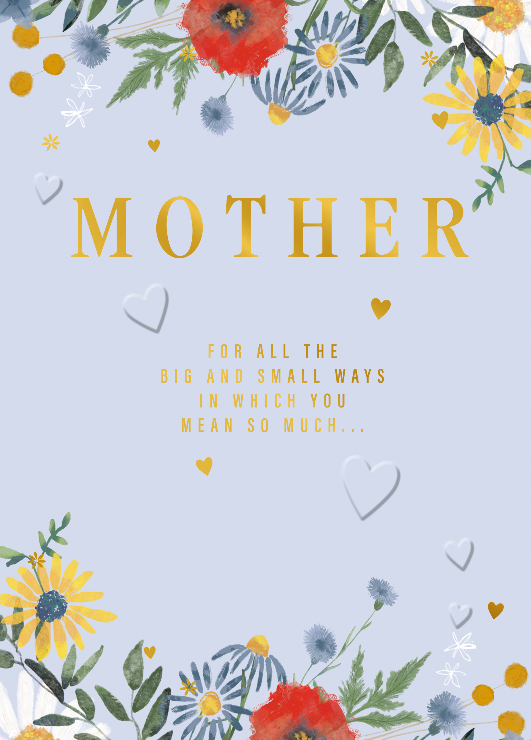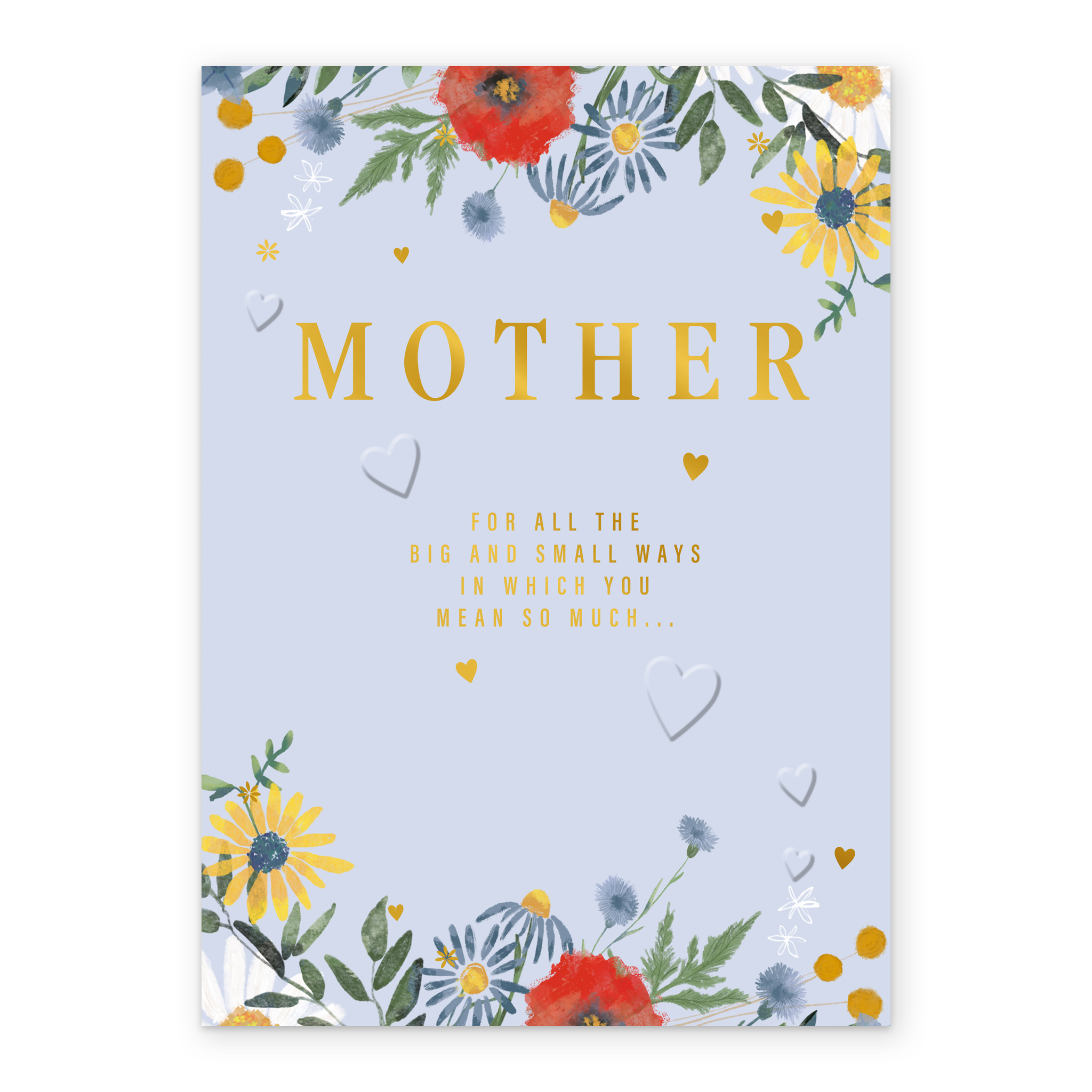 Printed on premium-quality board, this card features classic florals on a lilac background, with the message 'Mother, For all the big and small ways in which you mean so much…', and comes complete with a co-ordinating white envelope.