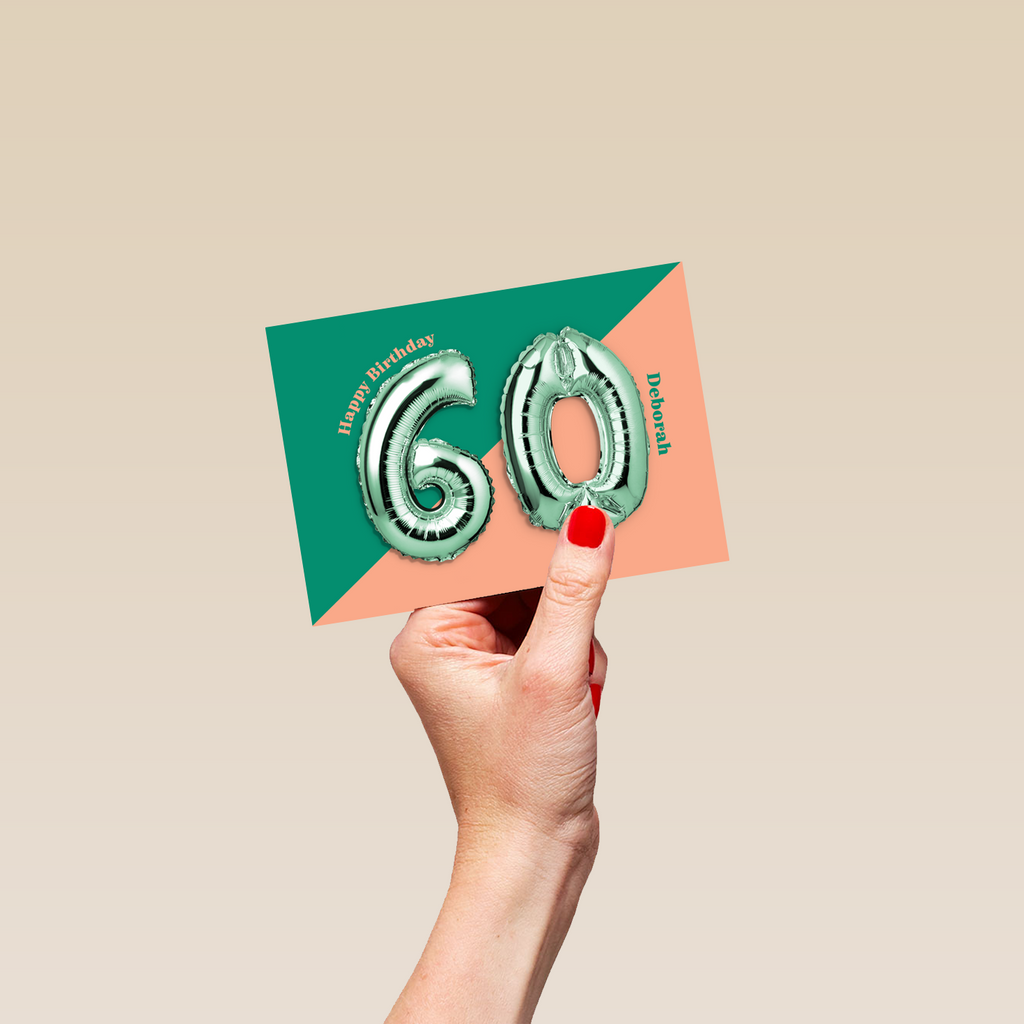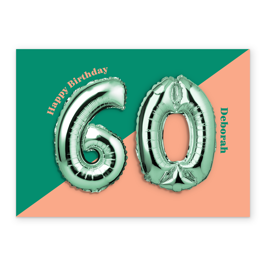 Printed on premium-quality board, this card features a foil balloon of the number 60 on a two tone colourful background, with the message '60, Happy Birthday', space to personalise a name, and comes complete with a co-ordinating white envelope.