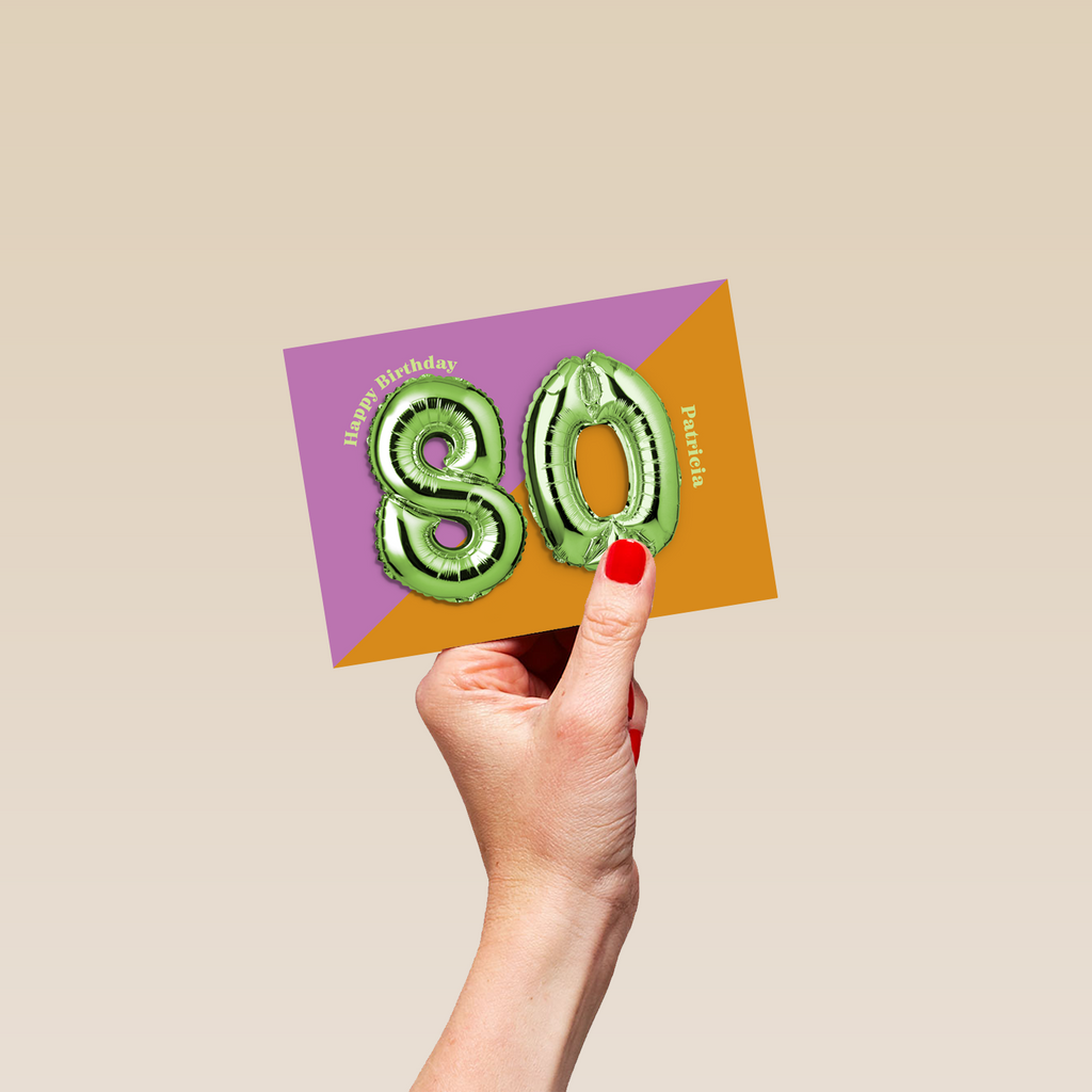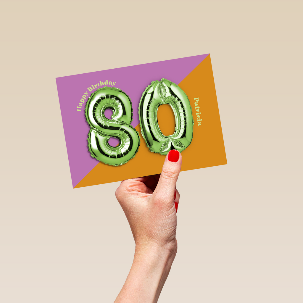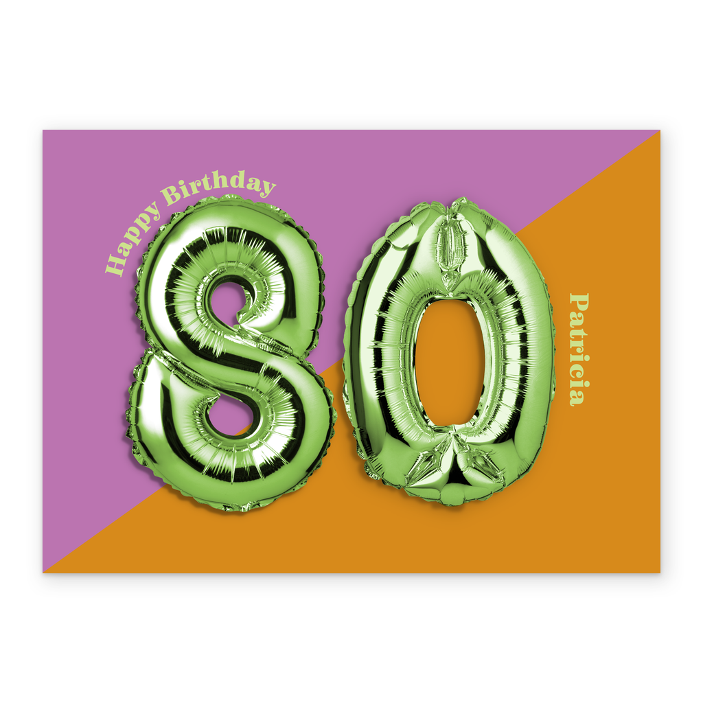 Printed on premium-quality board, this card features a foil balloon of the number 80 on a two tone colourful background, with the message '80, Happy Birthday', space to personalise a name, and comes complete with a co-ordinating white envelope.