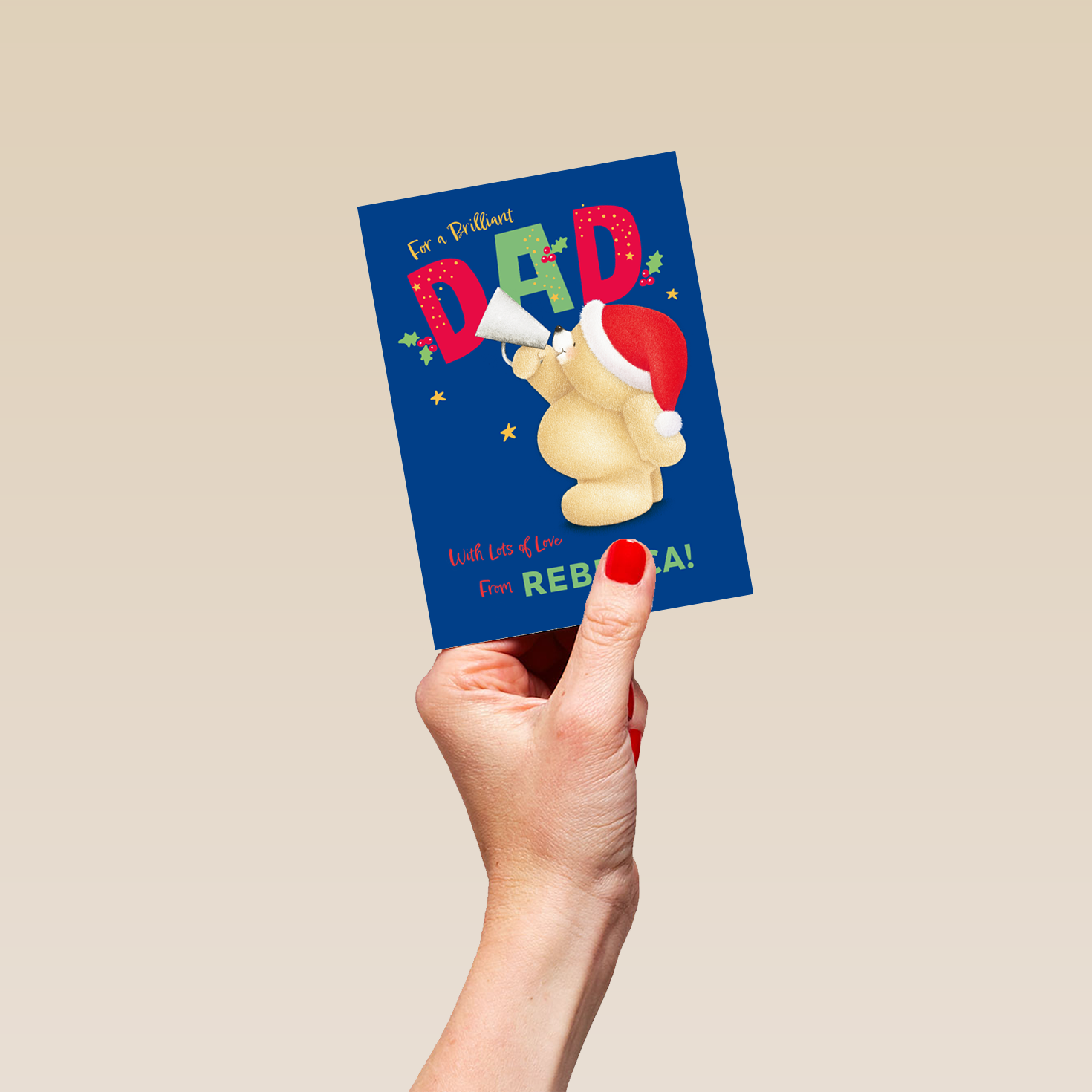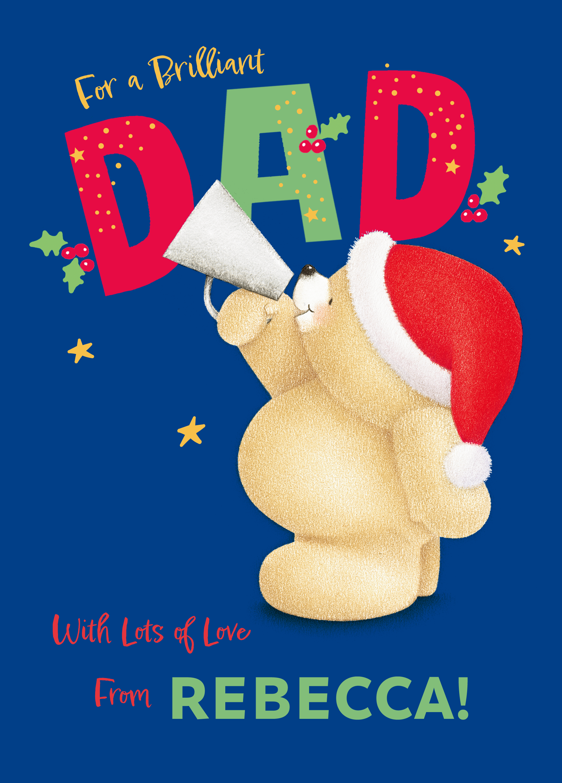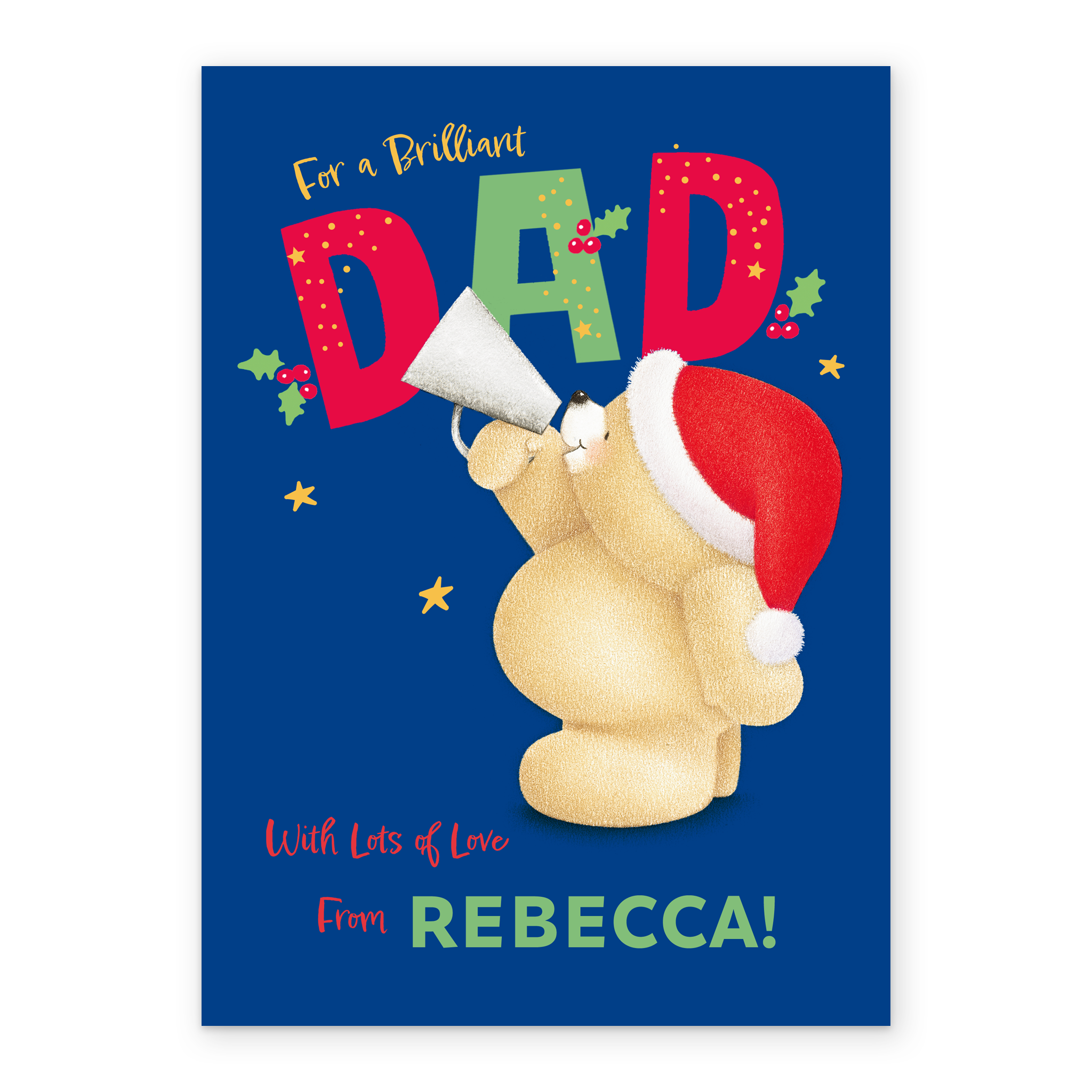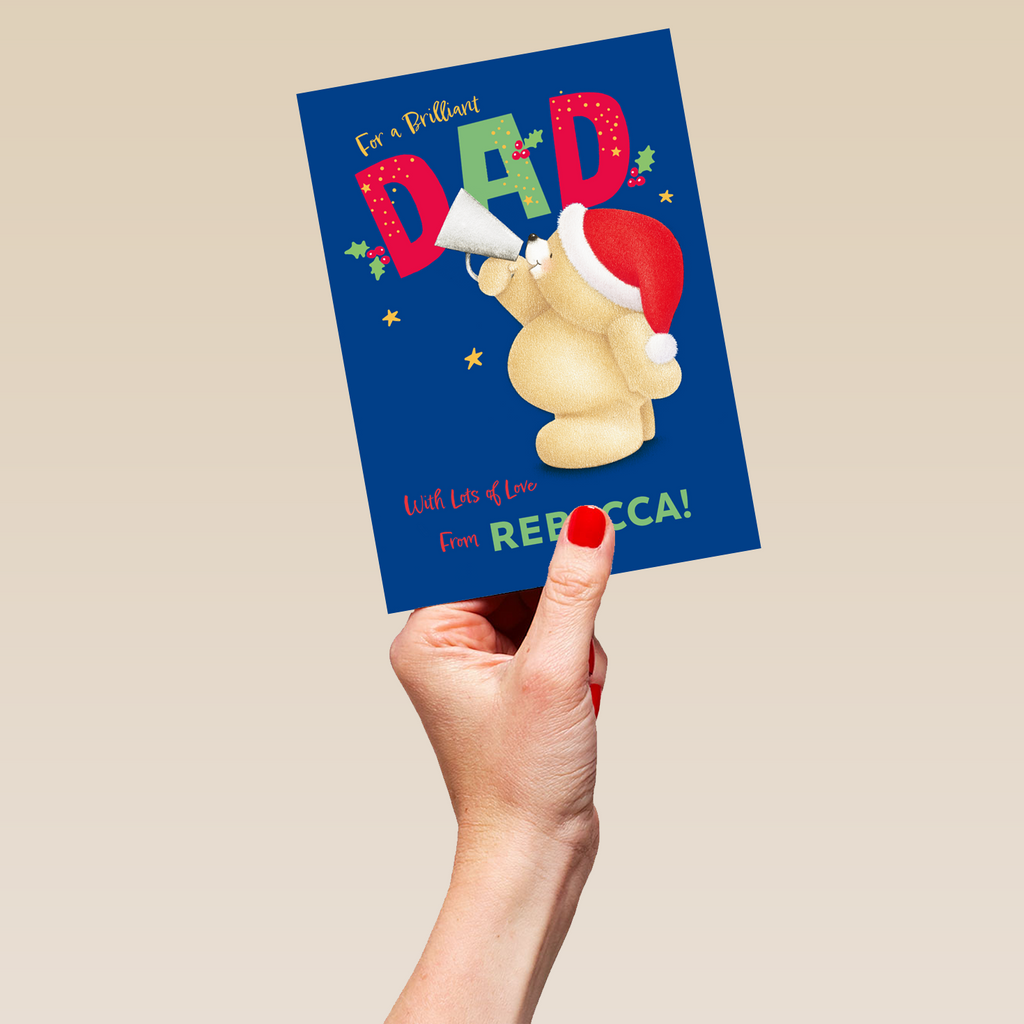 Printed on premium-quality board, this card features Hallmark's Forever Friends bear in a Santa hat holding a paper megaphone, with the message 'For a brilliant dad. With lots of love from [Name]!', space to personalise a name, and comes complete with a co-ordinating white envelope.