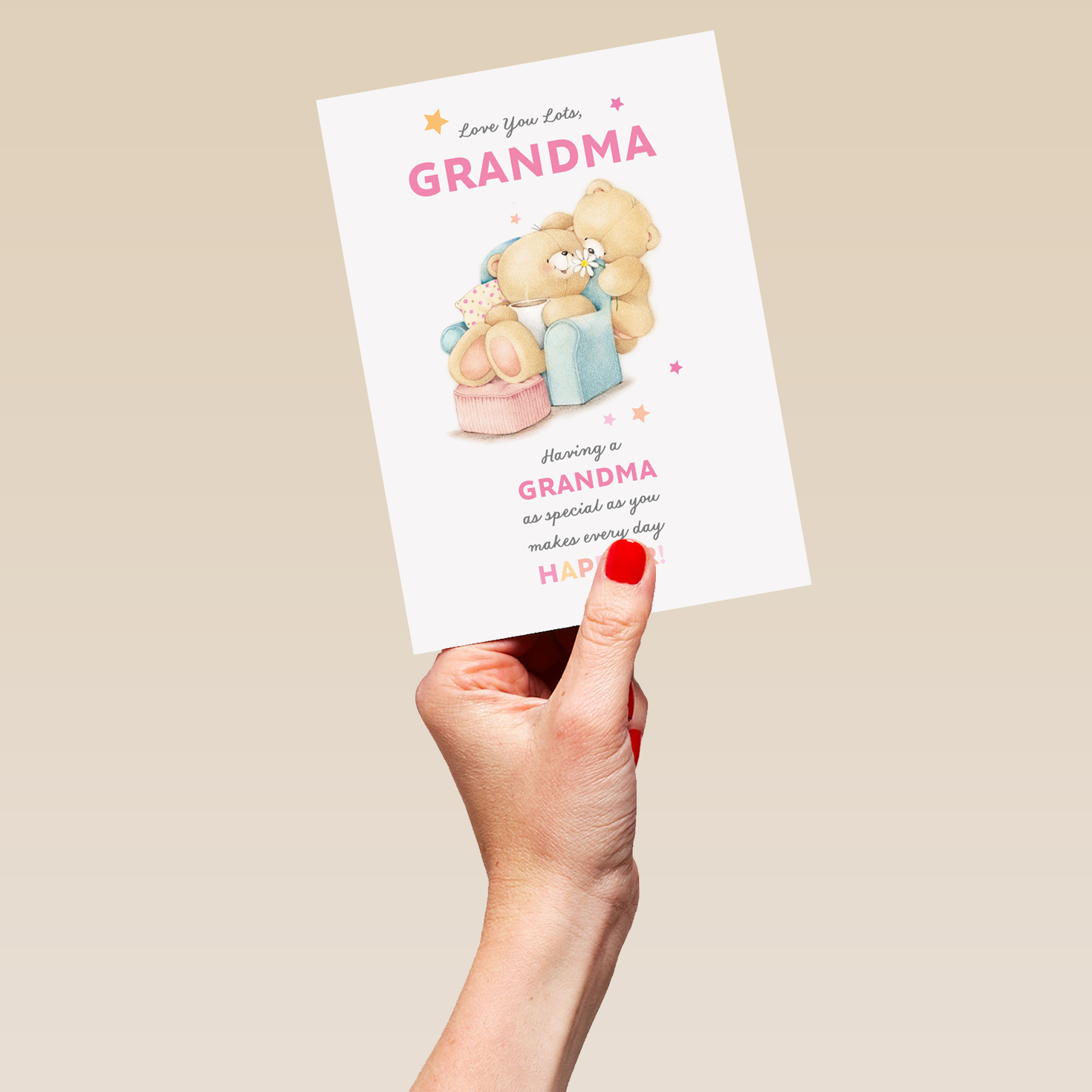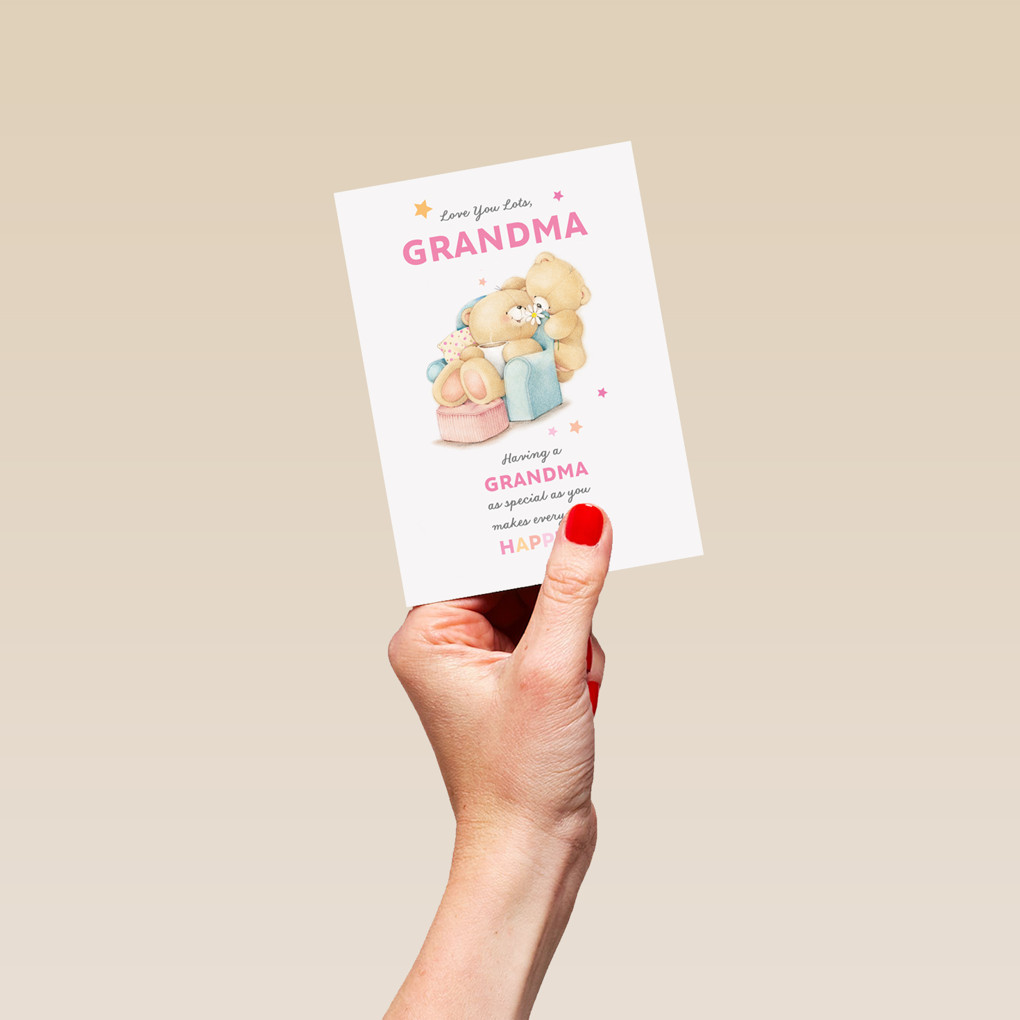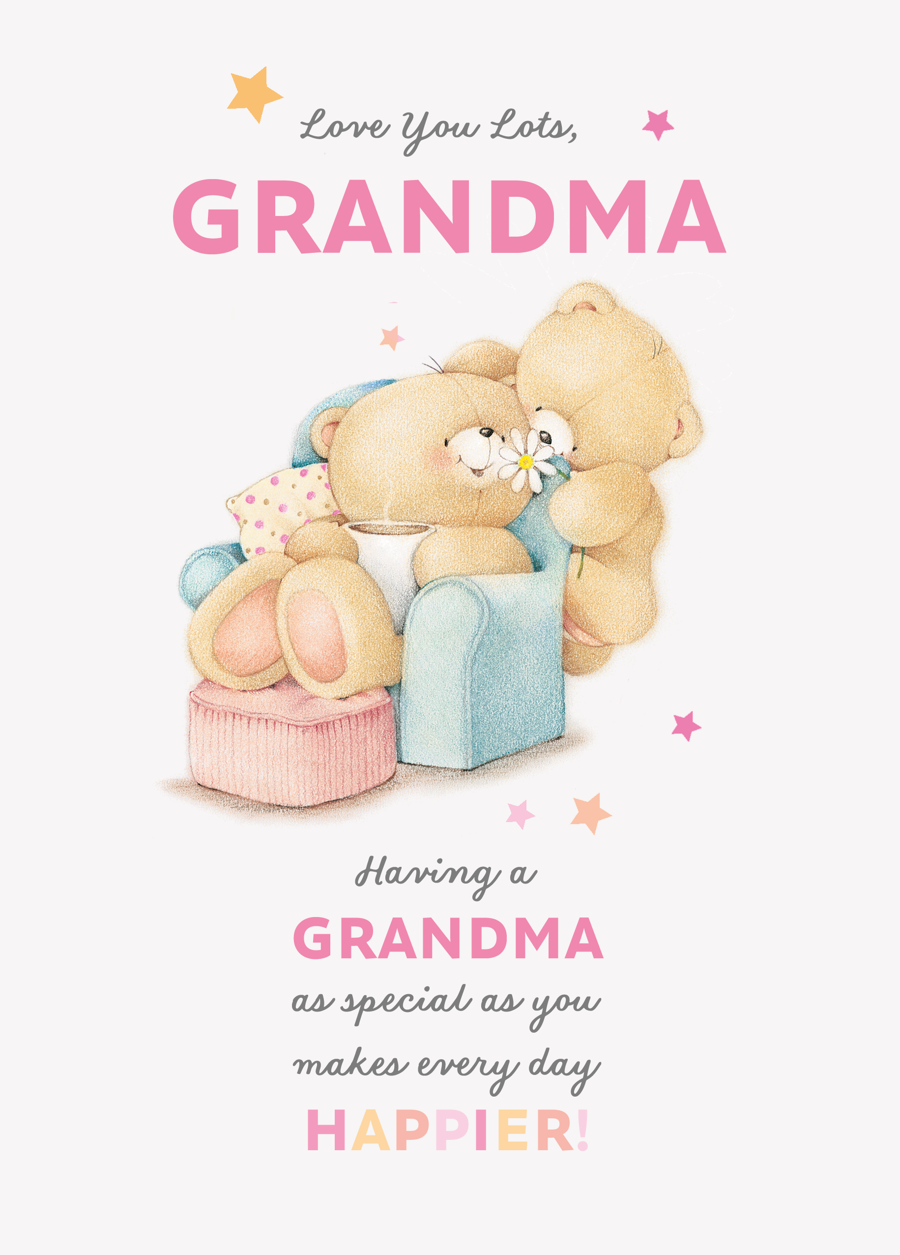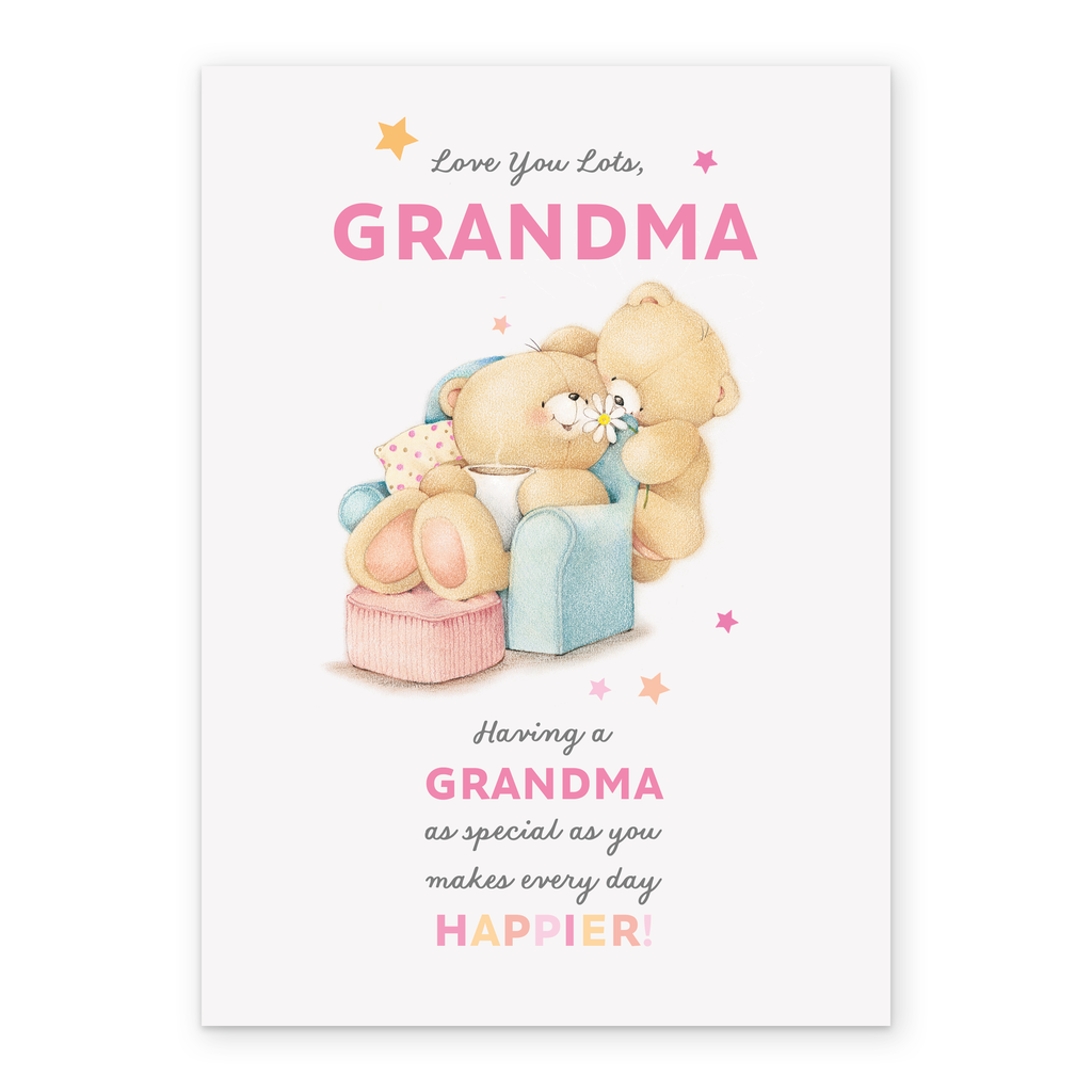 Printed on premium-quality board, this card features the Forever Friends, with the message 'Love you lots grandma. Having a grandma as special as you makes everyday happier!', space to personalise a name, and comes complete with a co-ordinating white envelope.