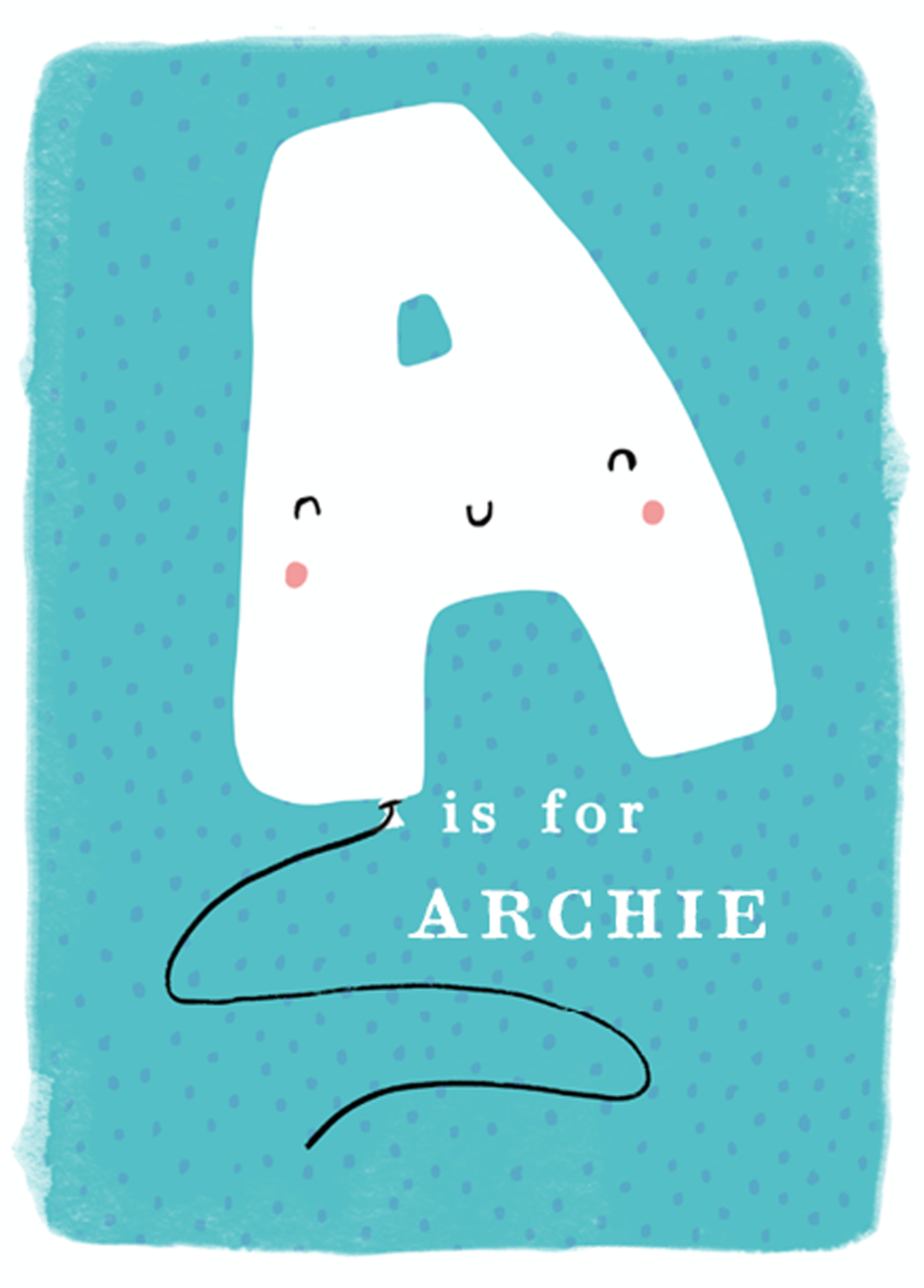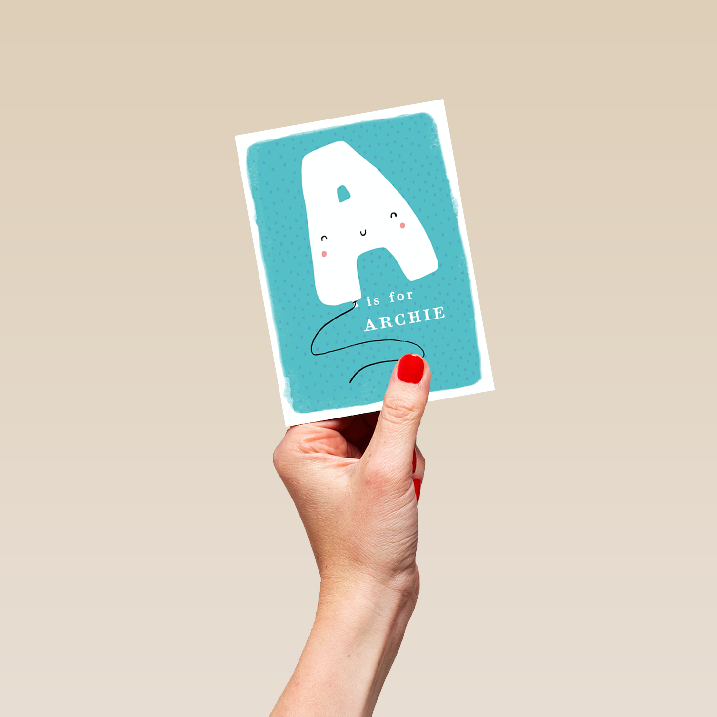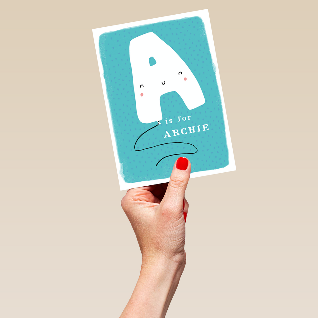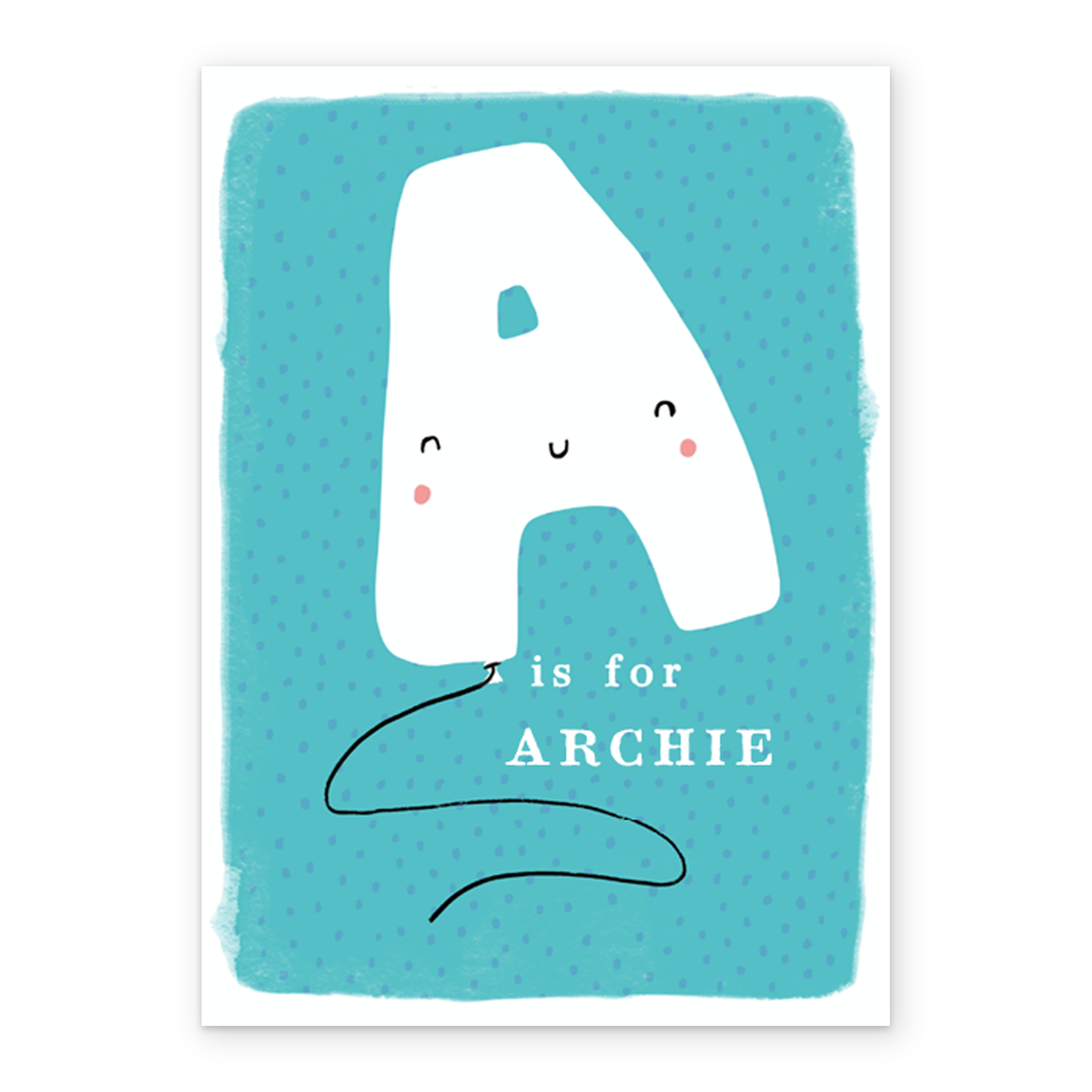 Printed on premium-quality board, this card features a fun smiley face balloon letter A on a blue dotted turquoise background, space to personalise a name, and comes complete with a co-ordinating white envelope.