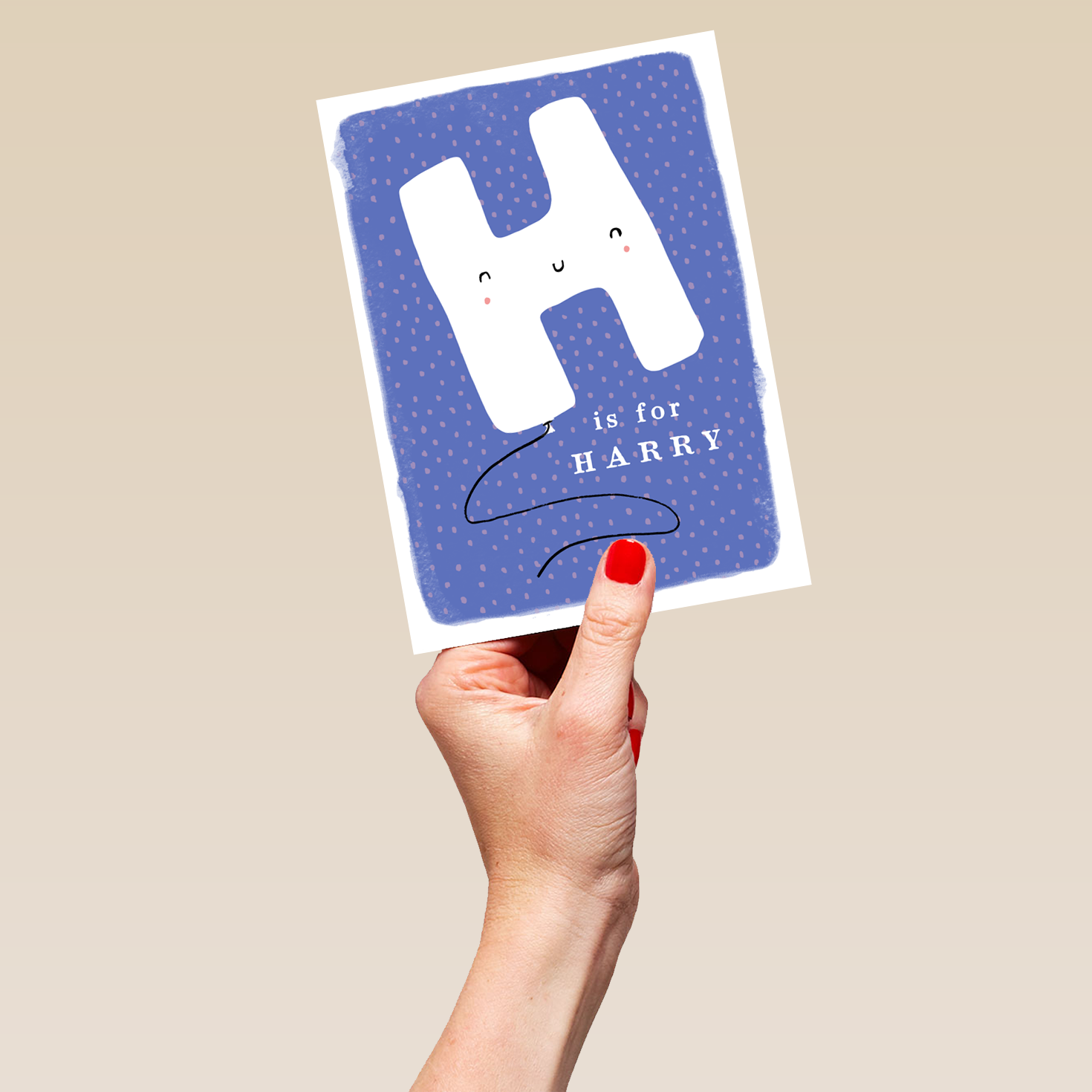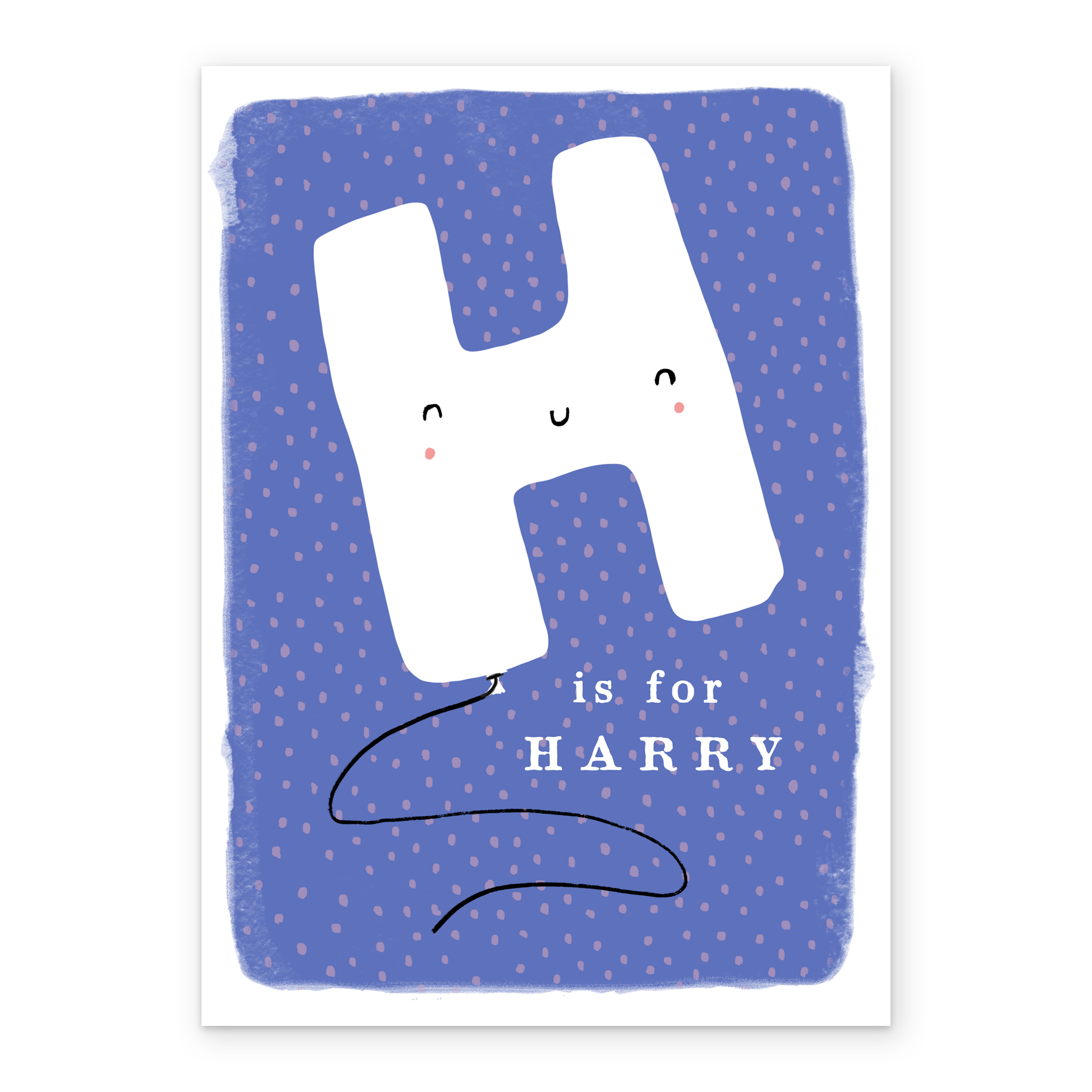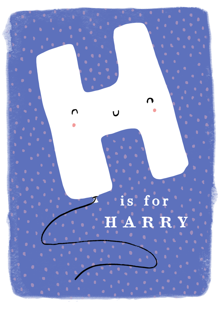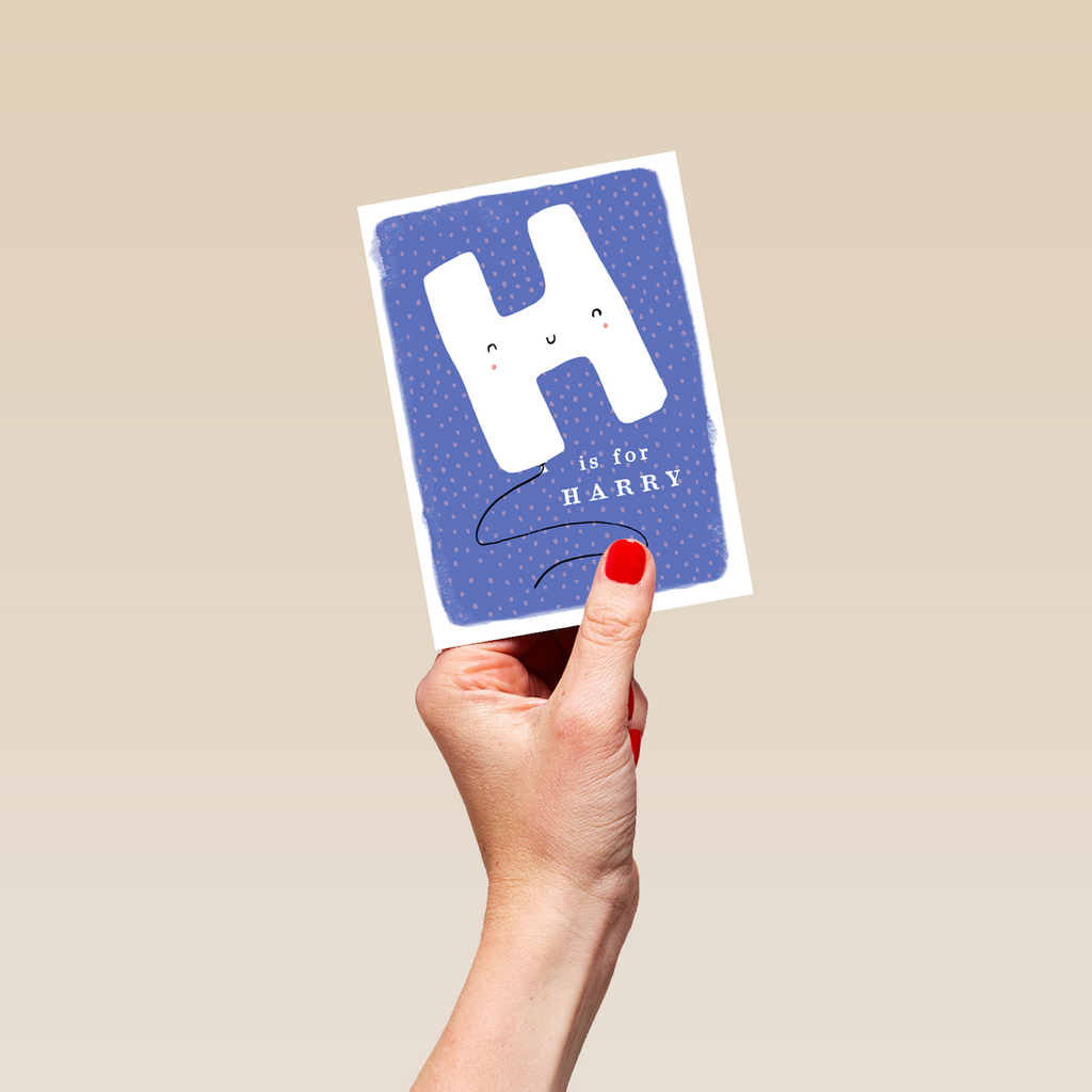 Printed on premium-quality board, this card features a fun smiley face balloon letter H on a pink dotted blue background, space to personalise a name, and comes complete with a co-ordinating white envelope.