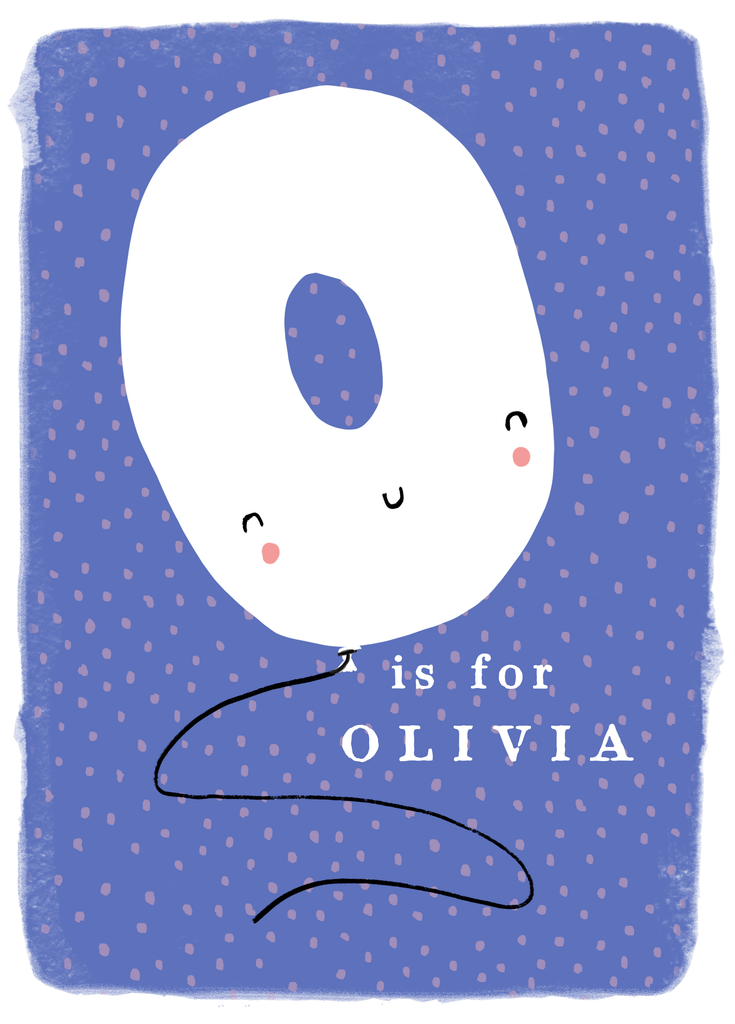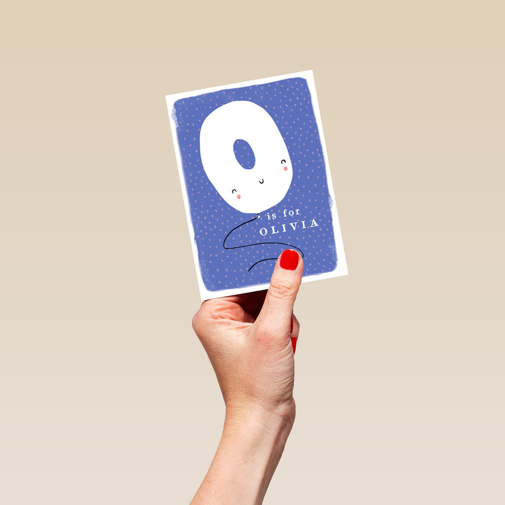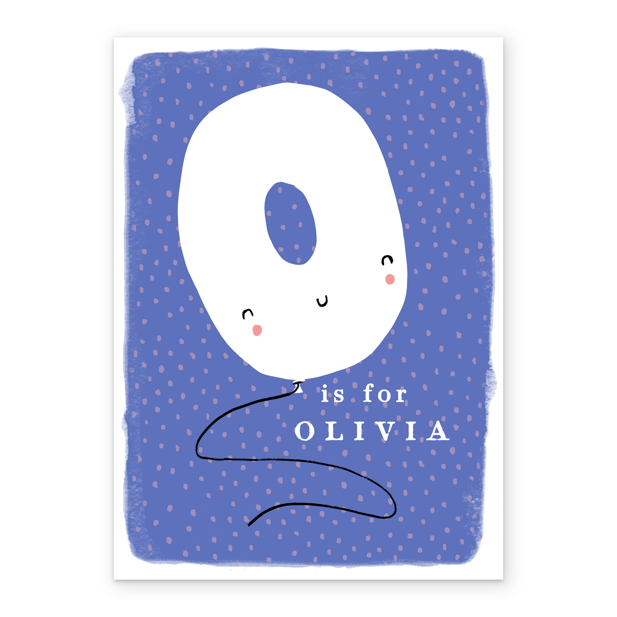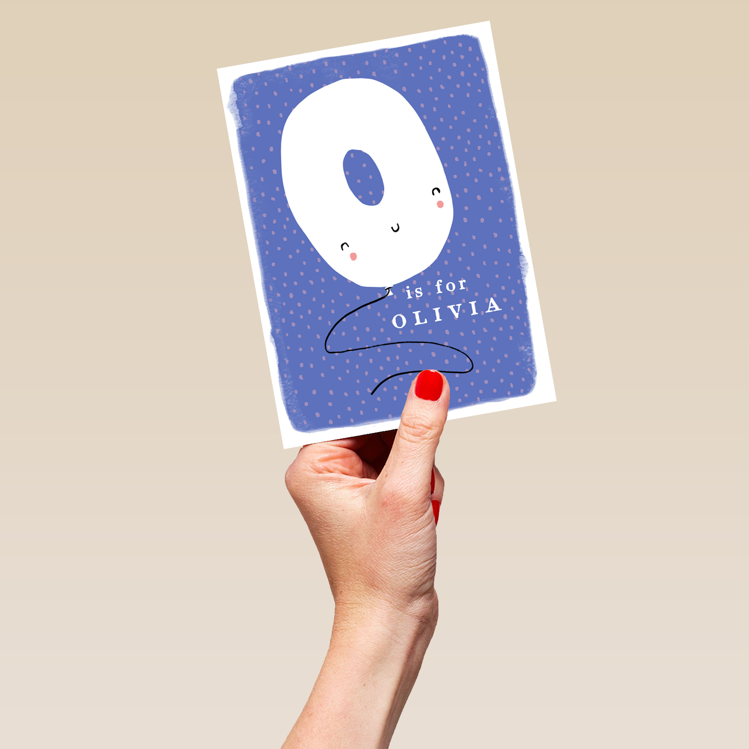 Printed on premium-quality board, this card features a fun smiley face balloon letter O on a pink dotted blue background, space to personalise a name, and comes complete with a co-ordinating white envelope.