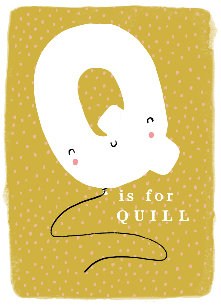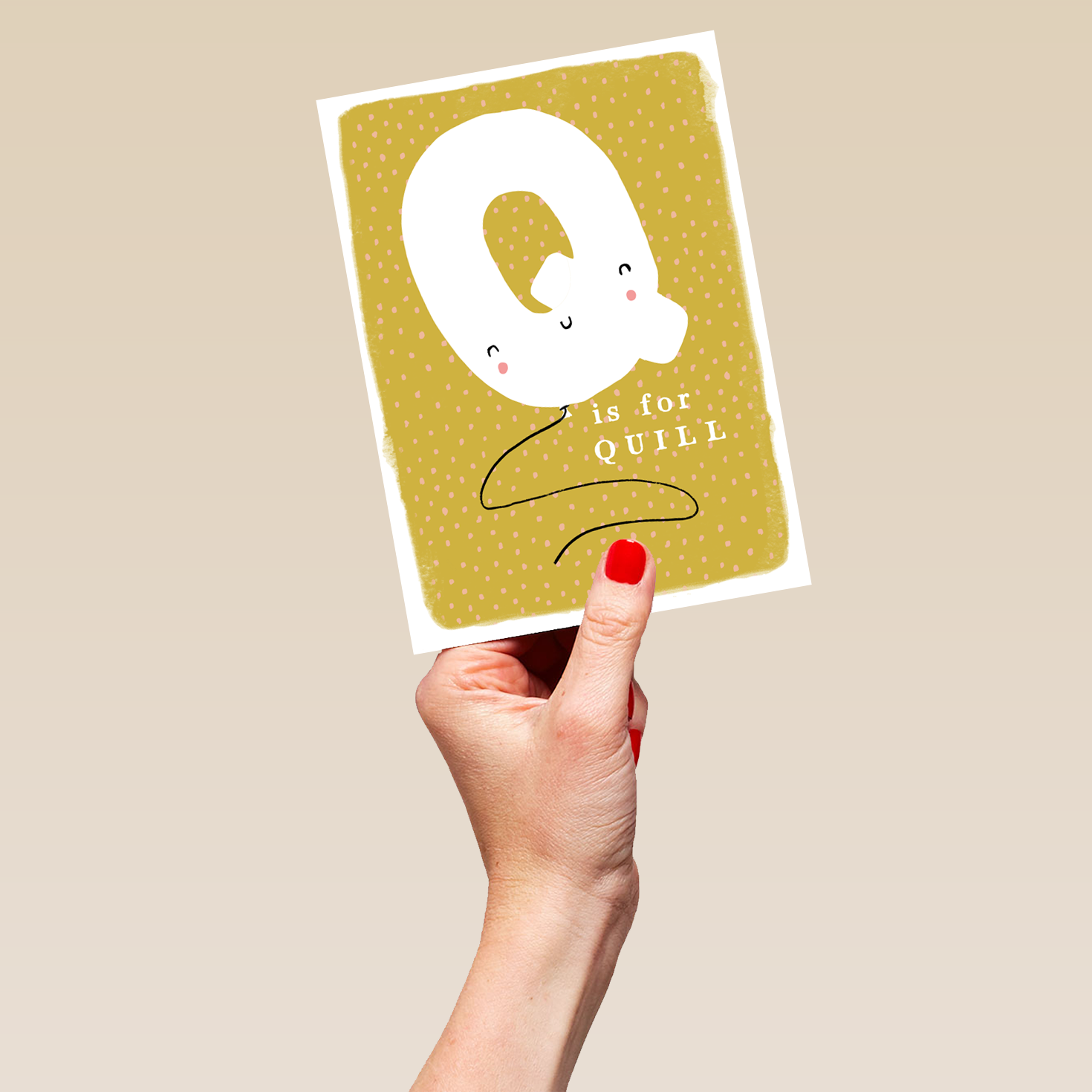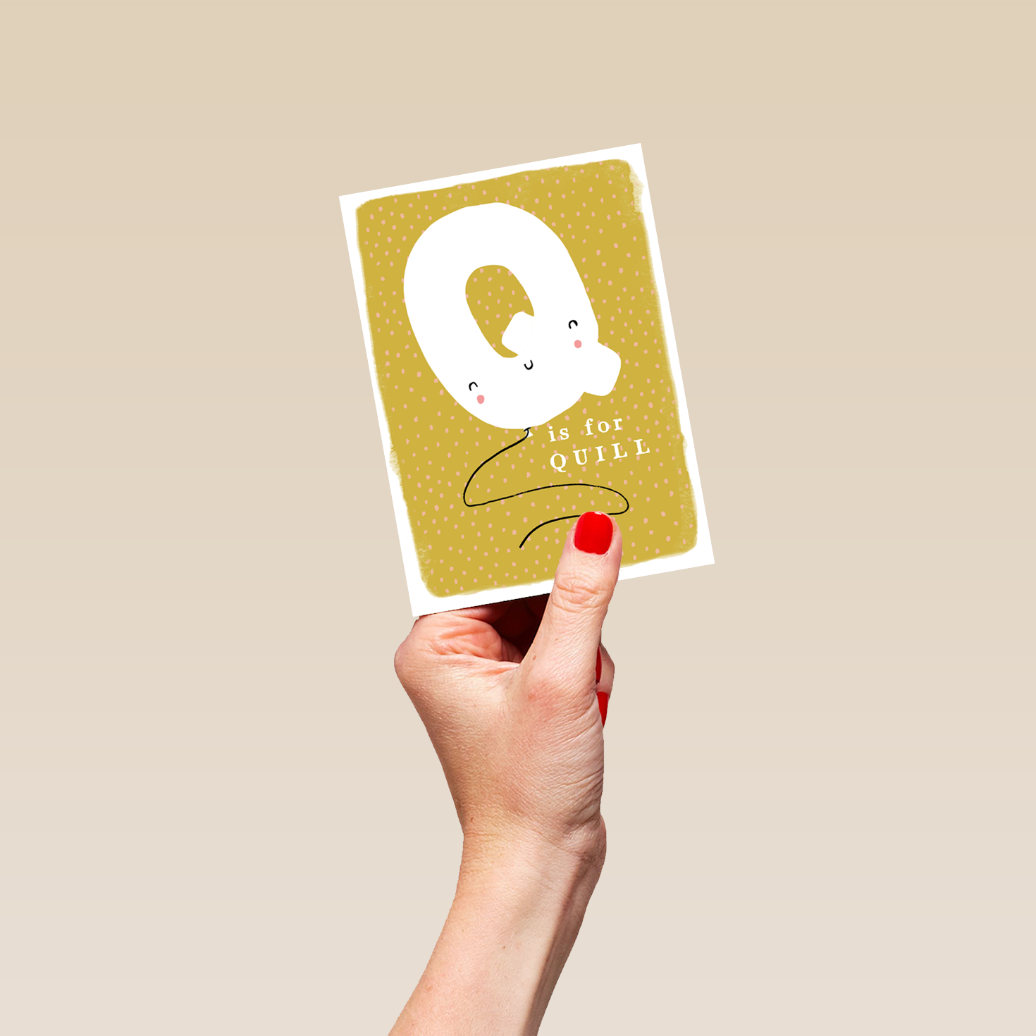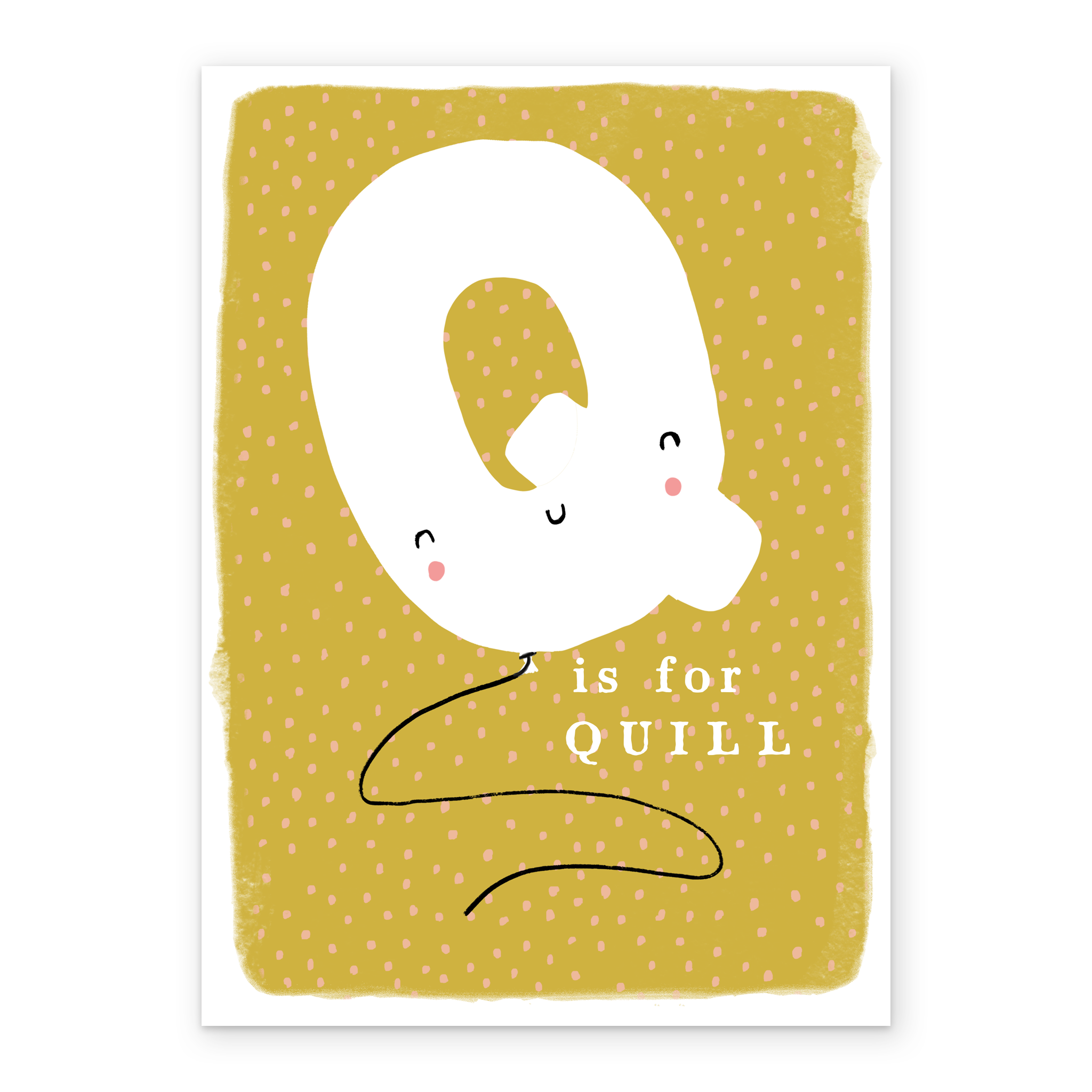 Printed on premium-quality board, this card features a fun smiley face balloon letter Q on a pink dotted yellow background, space to personalise a name, and comes complete with a co-ordinating white envelope.