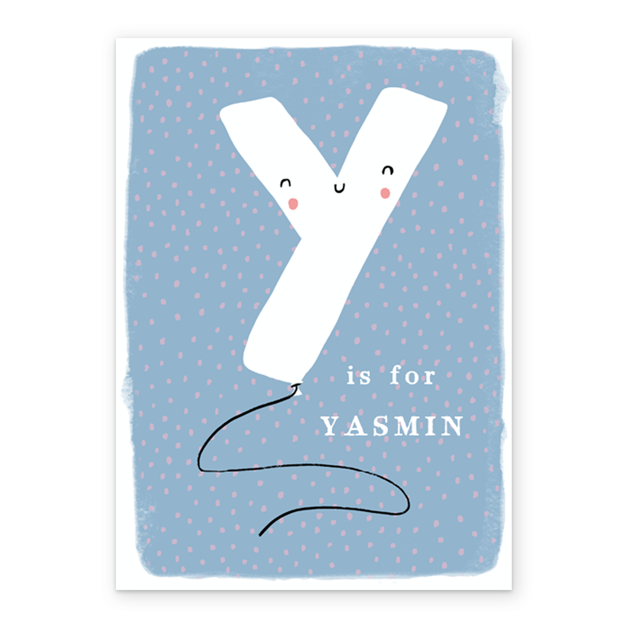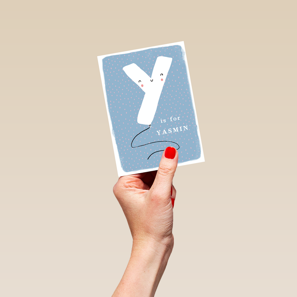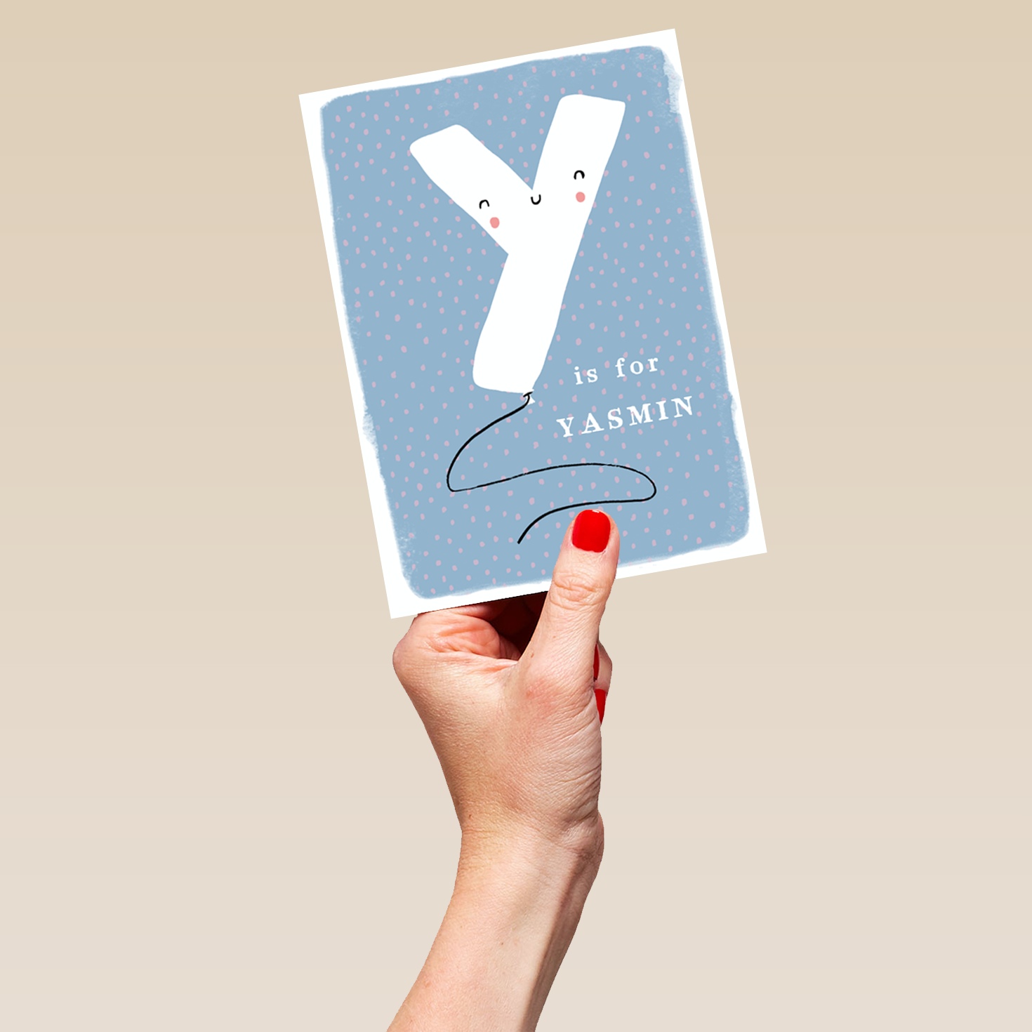 Printed on premium-quality board, this card features a fun smiley face balloon letter Y on a pink dotted light blue background, space to personalise a name, and comes complete with a co-ordinating white envelope.
