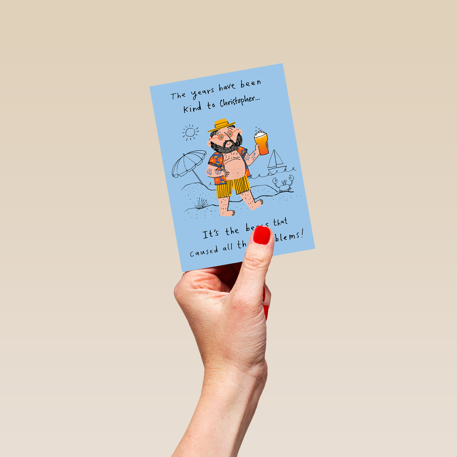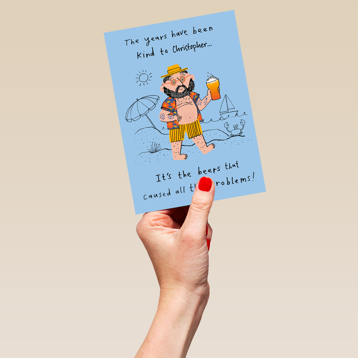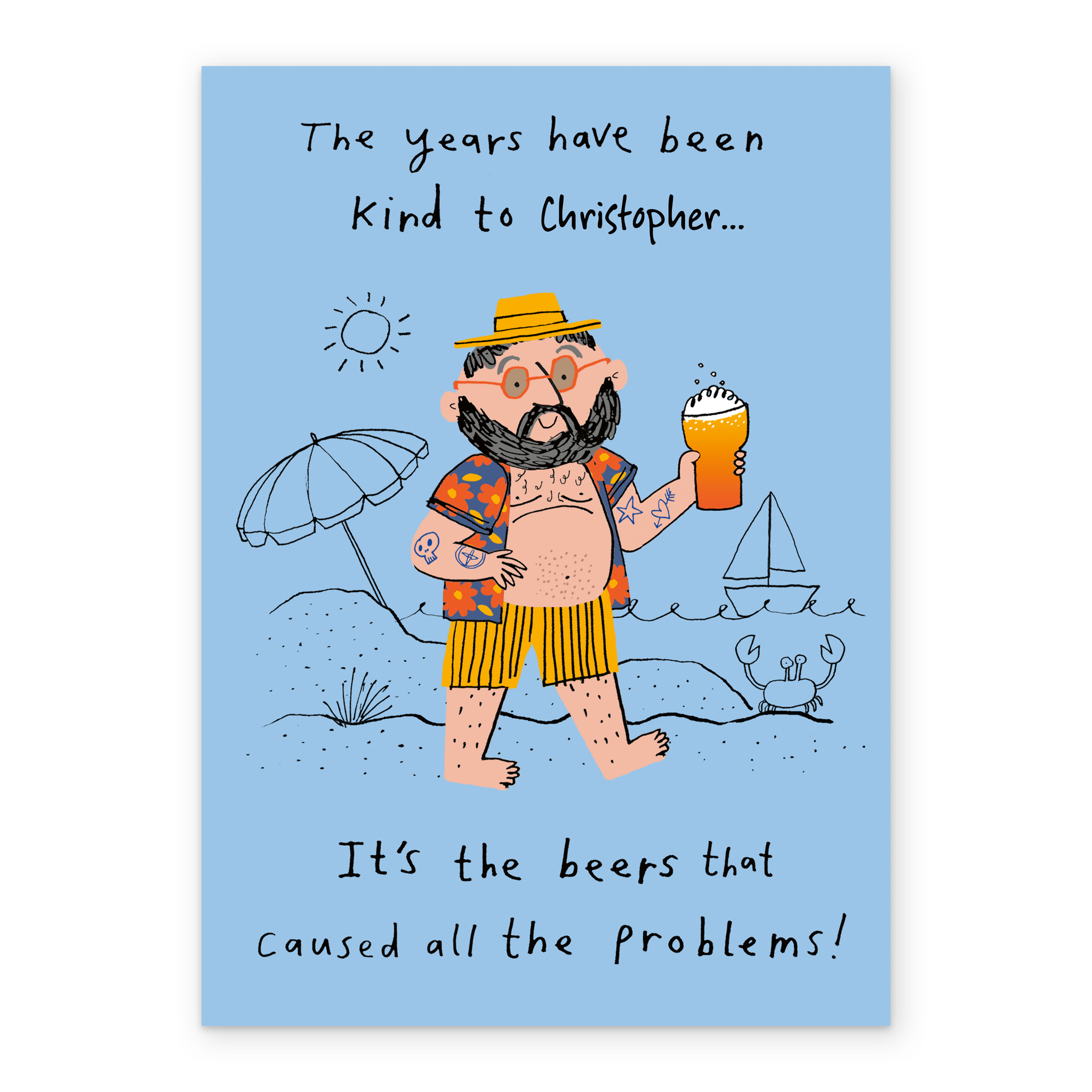 Printed on premium-quality board, this card features an illustration of a happy man on a beach carrying a beer, with the message 'The years have been kind to [Name]… It's the beers that caused all the problems!', space to personalise a name, and comes complete with a co-ordinating white envelope.