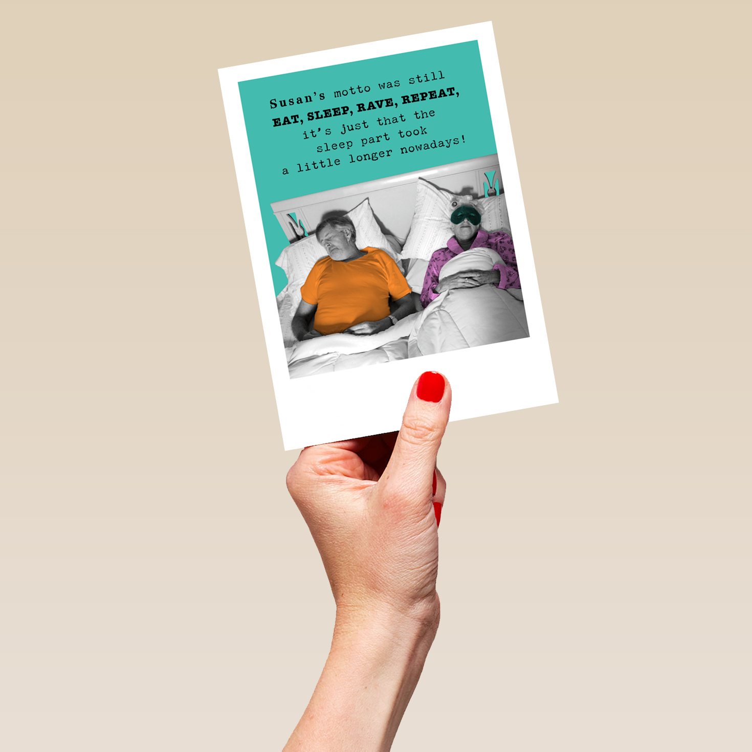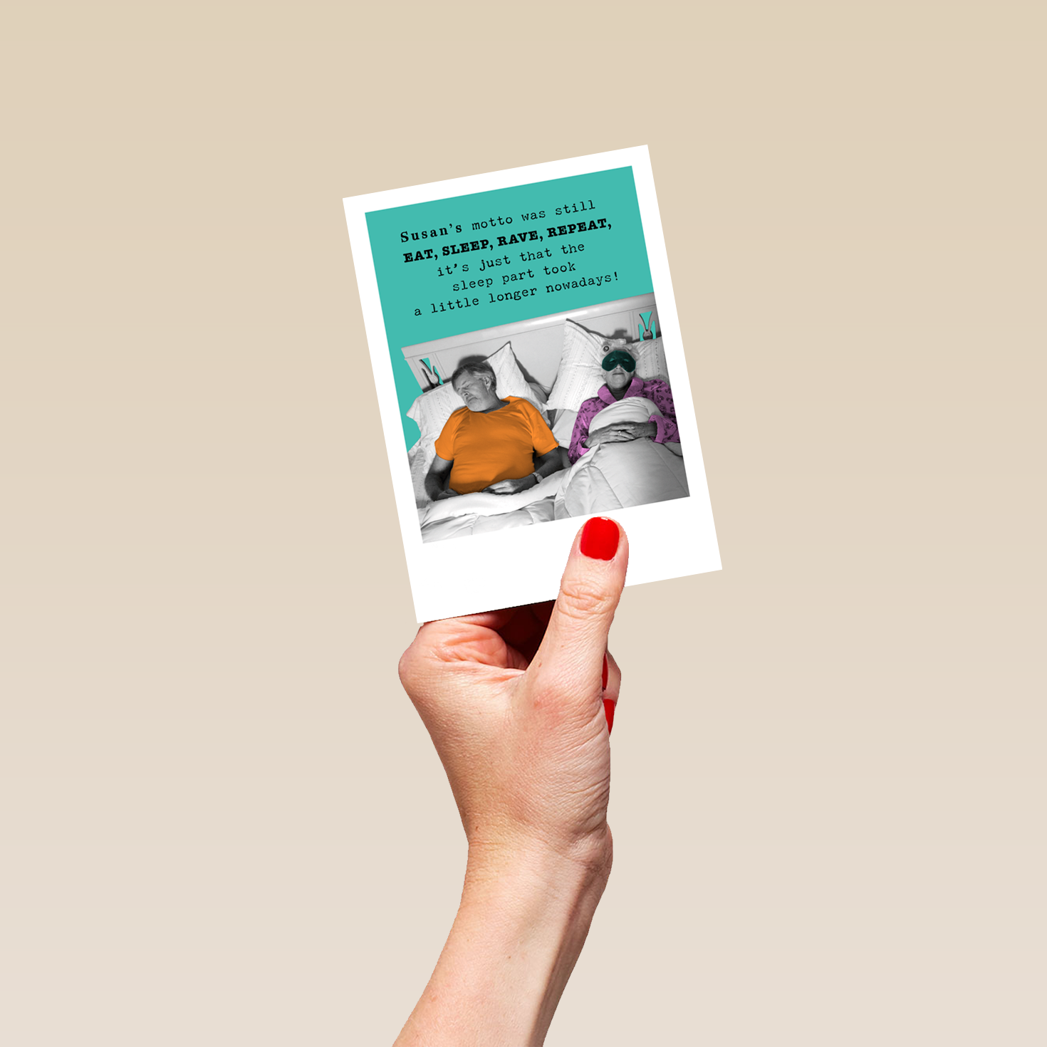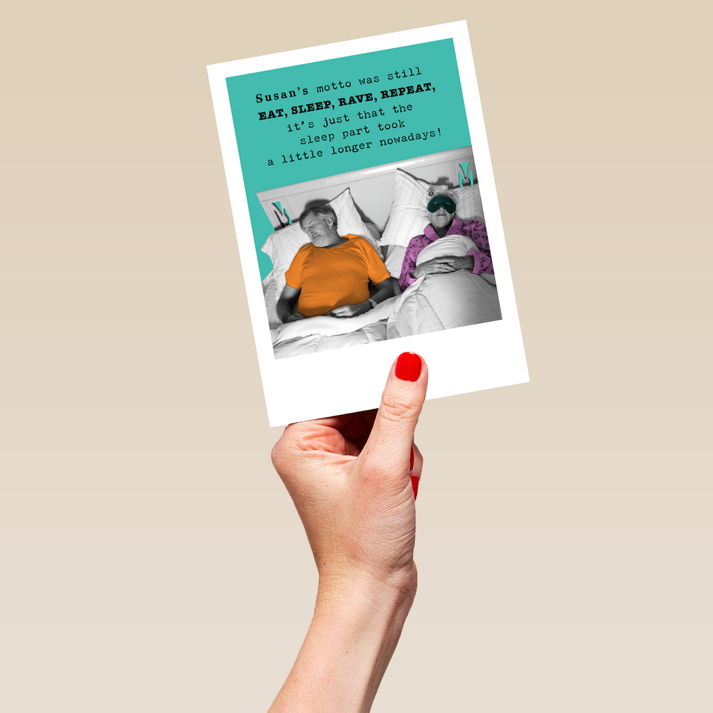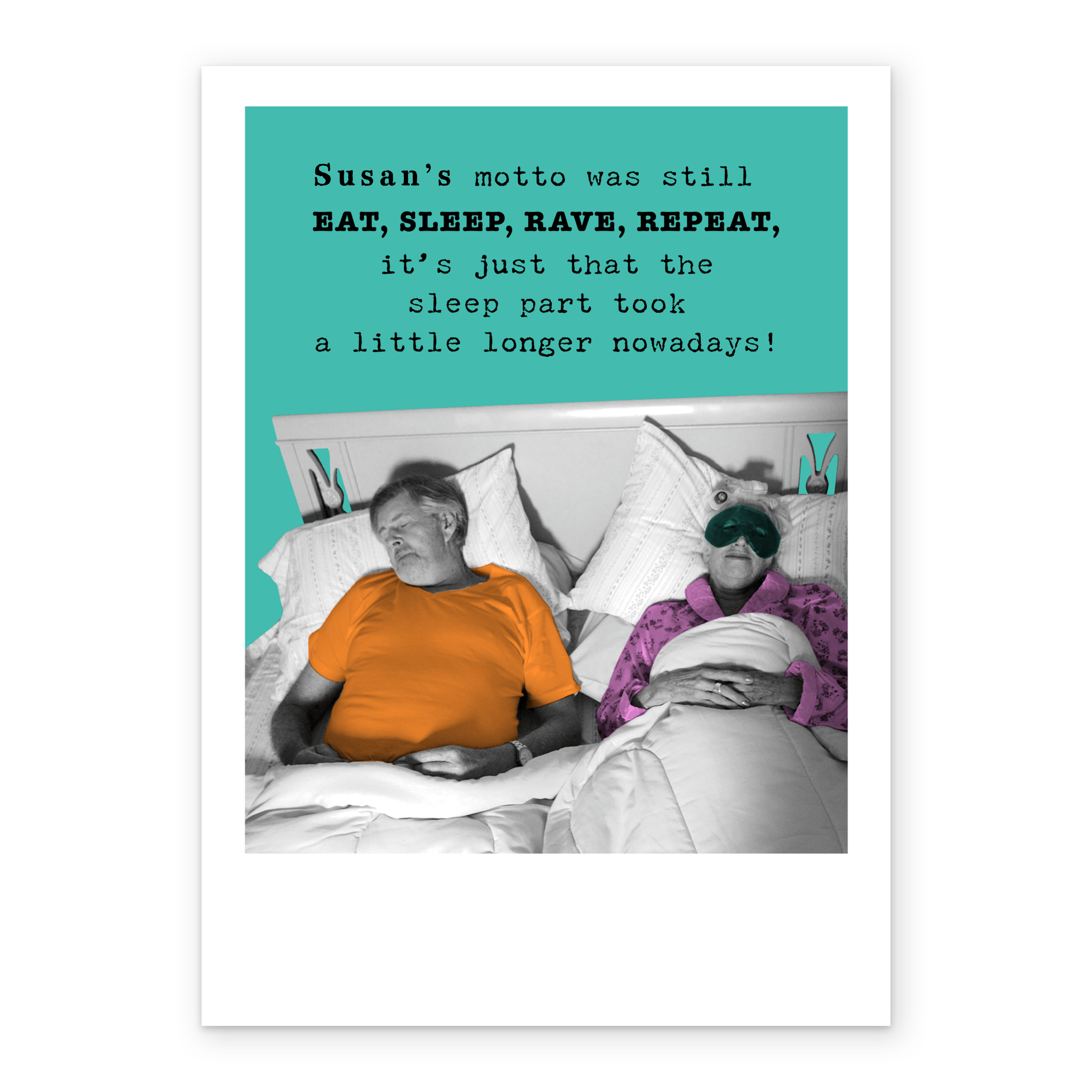 Printed on premium-quality board, this card features a photographic image of a couple in bed with the woman wearing a sleep mask, on a blue background, with the message '[Name]'s motto was still EAT, SLEEP, RAVE, REPEAT, it's just that the sleep part took a little longer nowadays!', space to personalise a name, and comes complete with a co-ordinating white envelope.