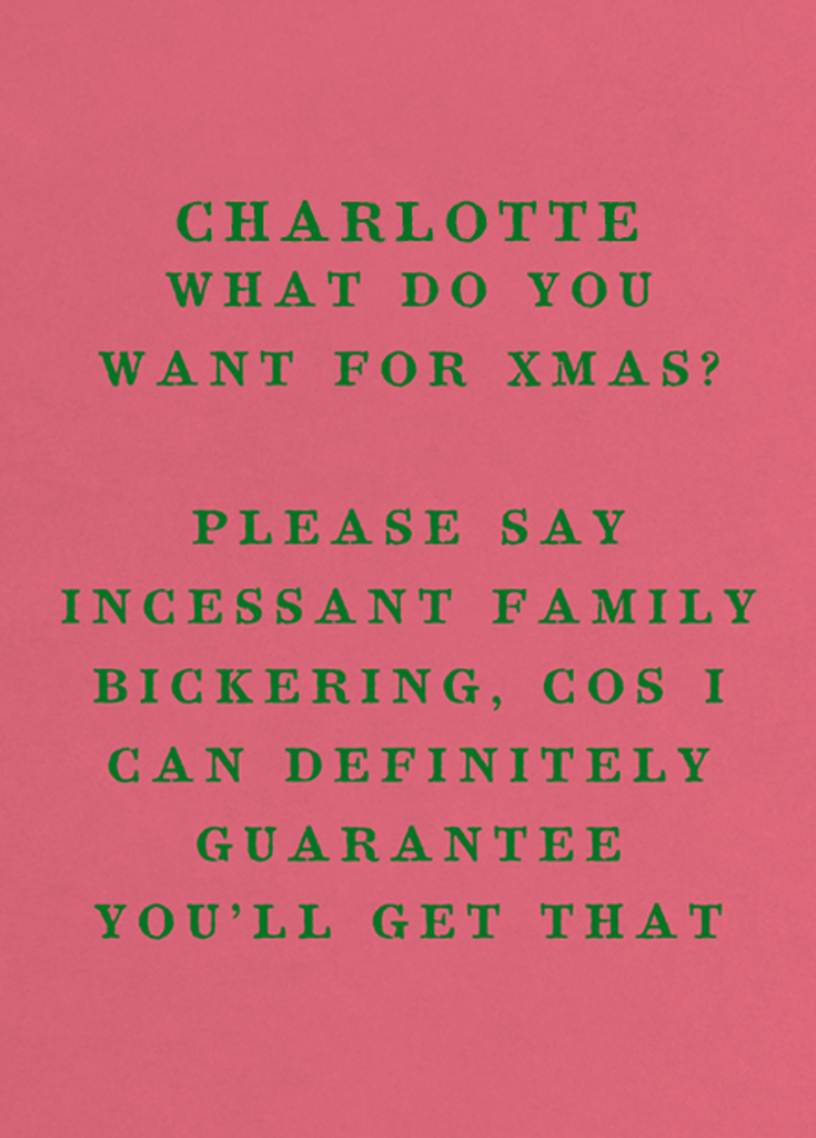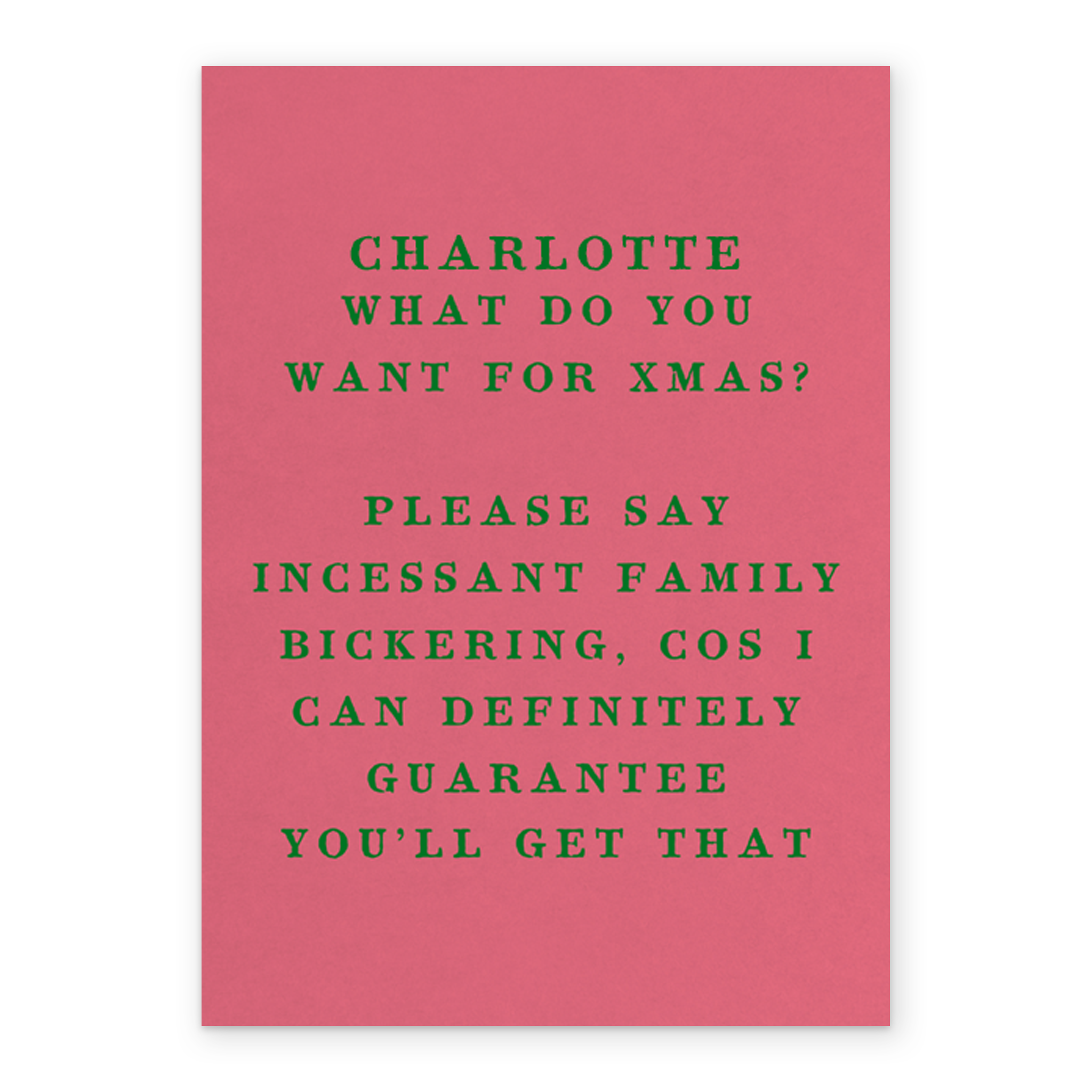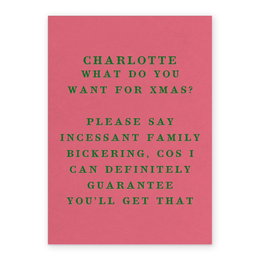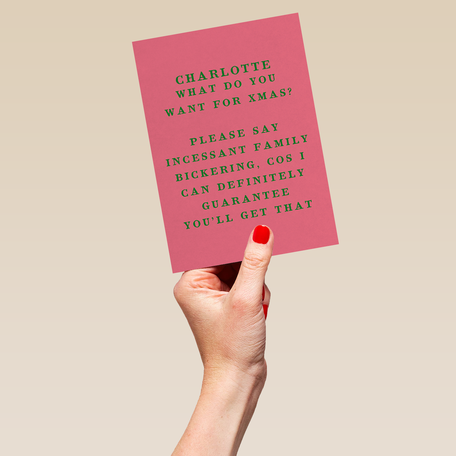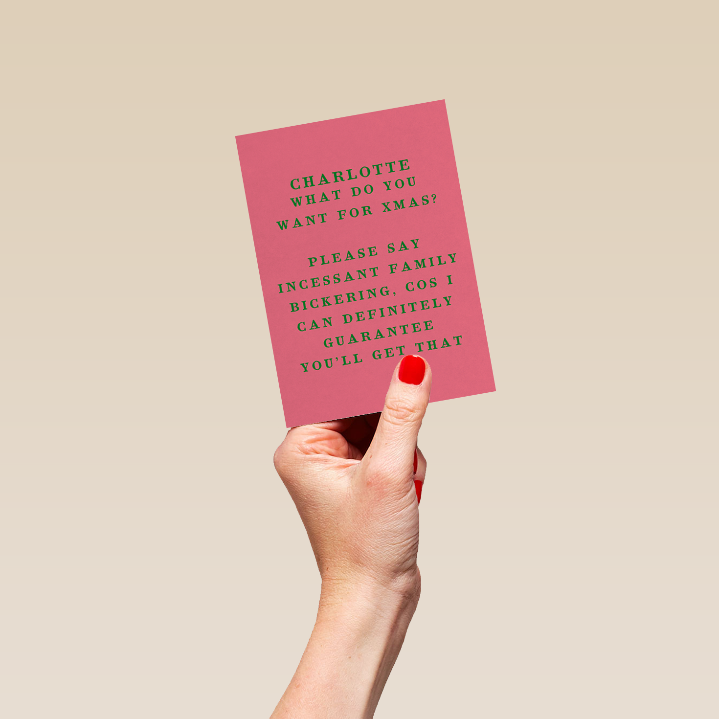 Printed on premium-quality board, this card features space to personalise a name and the hilarious message 'What Do You Want For Xmas? Please Say Incessant Family Bickering, Cos I Can Definitely Guarantee You'll Get That', and comes complete with a co-ordinating white envelope.