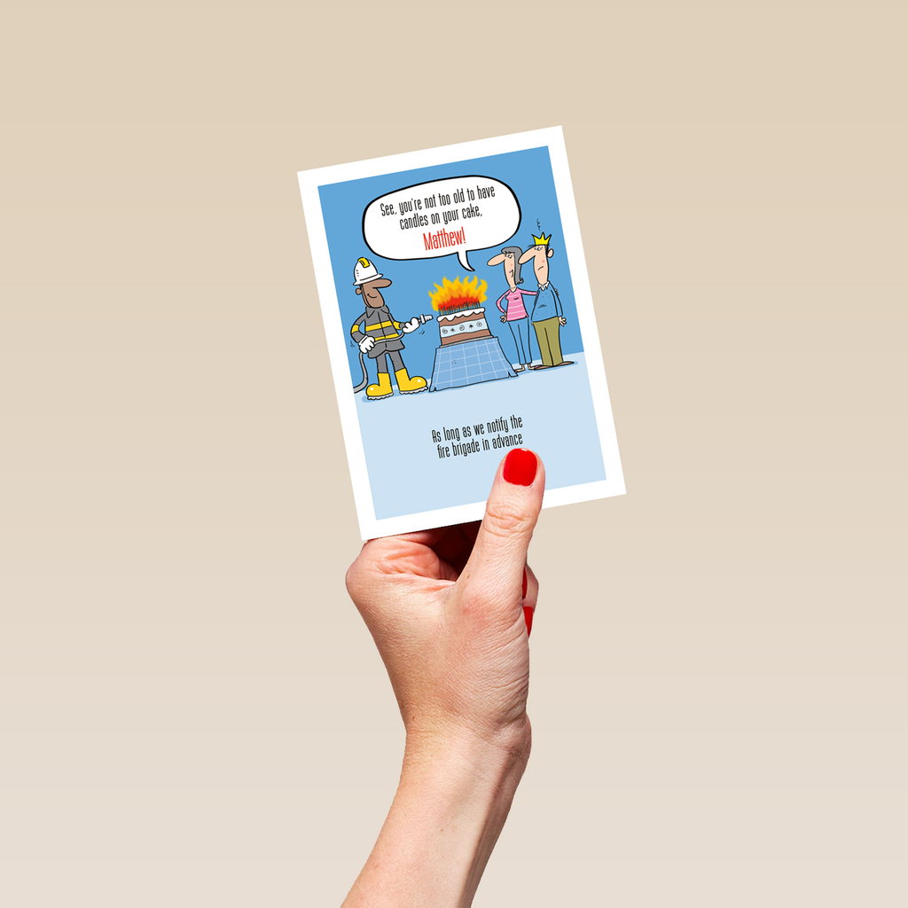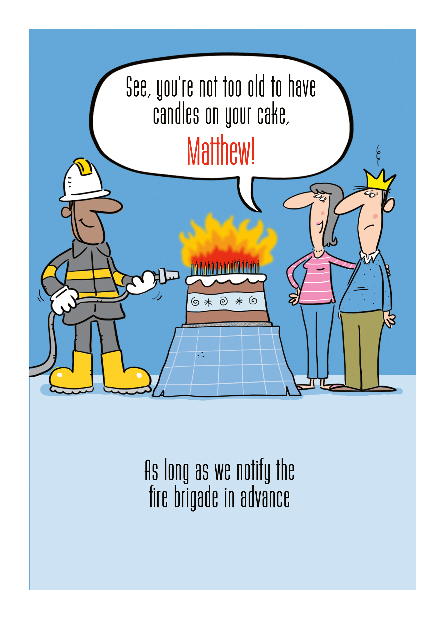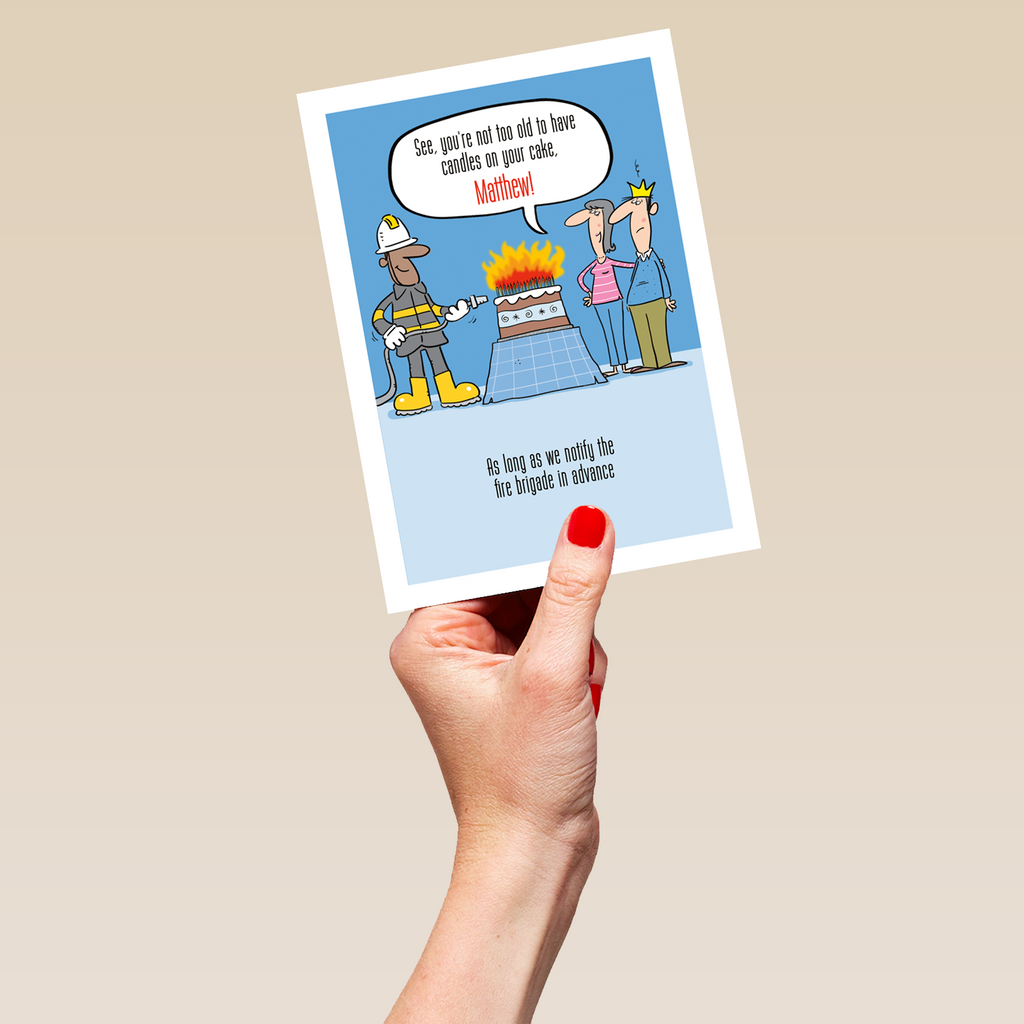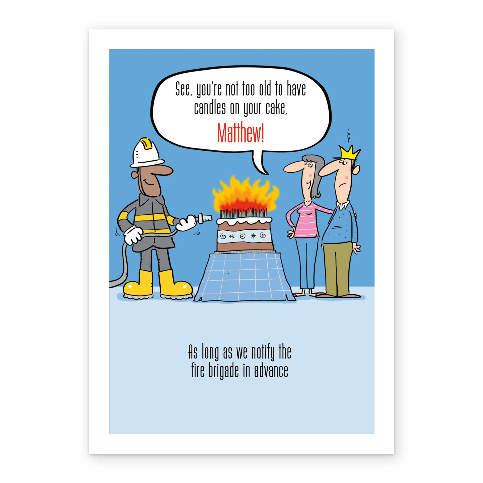 Printed on premium-quality board, this card features a funny illustration of a fireman putting the candles out on a birthday cake, with the message 'See, you're not too old to have candles on your cake, [Name]! As long as we notify the fire brigade in advance', space to personalise a name, and comes complete with a co-ordinating white envelope.