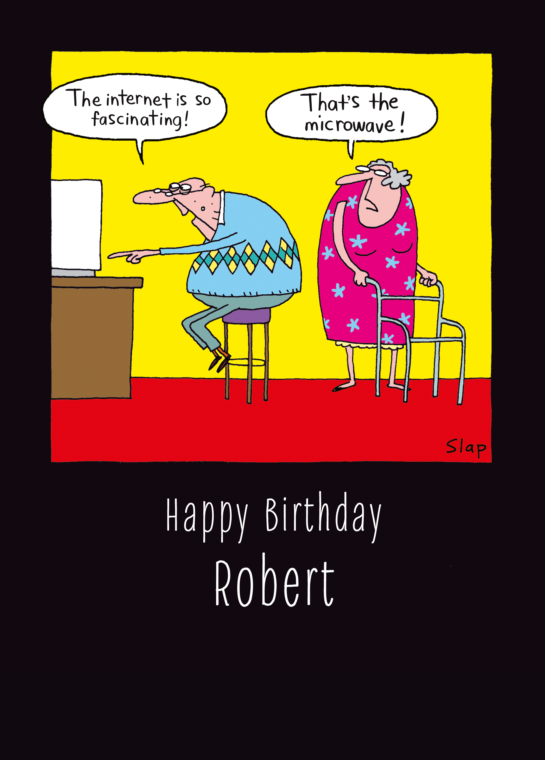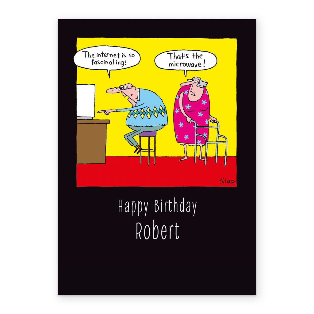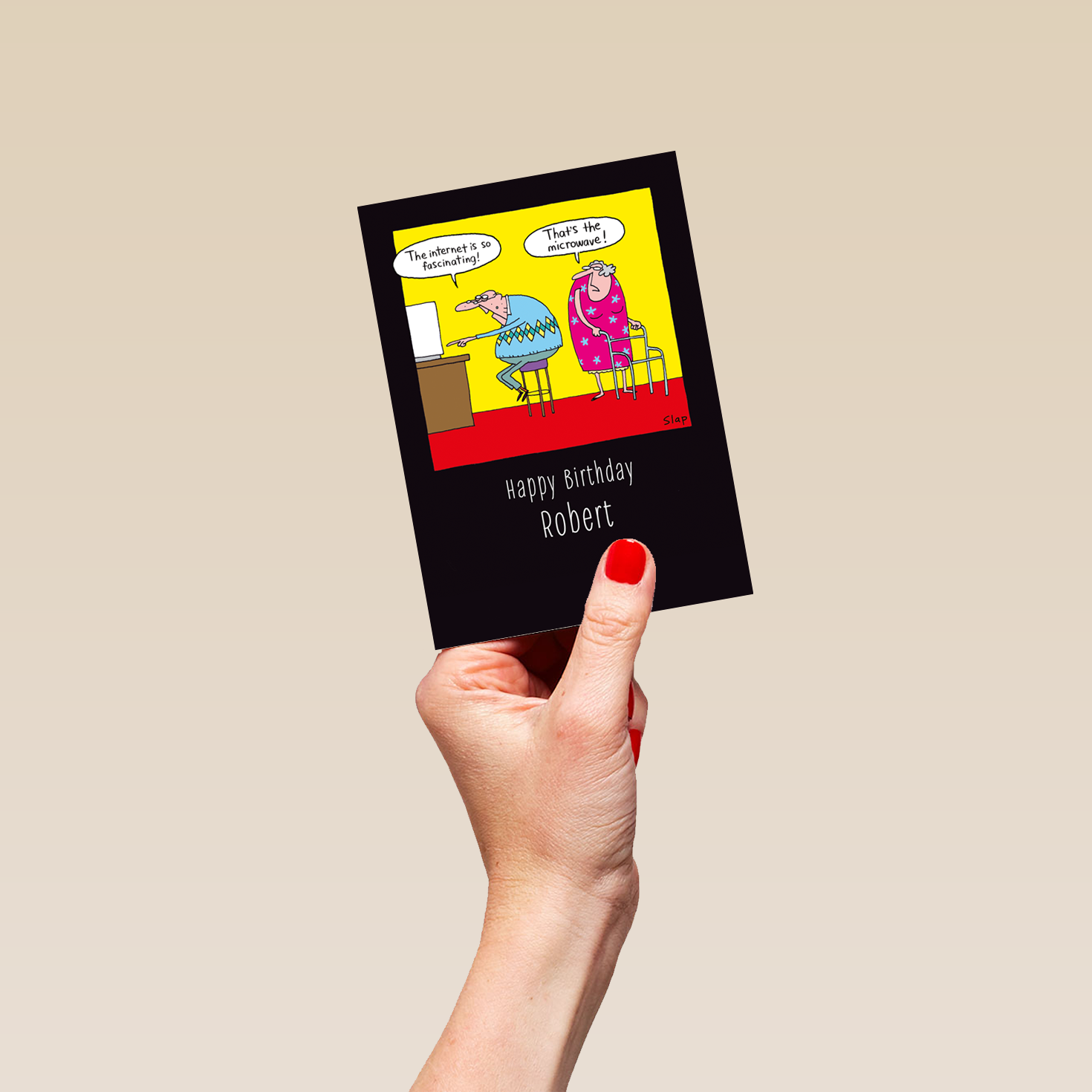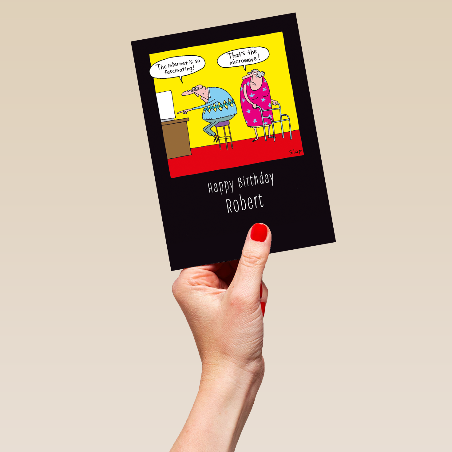 Printed on premium-quality board, this card features a funny illustration of an elderly couple looking at a microwave, with the message 'Happy Birthday [Name]', space to personalise a name, and comes complete with a co-ordinating white envelope.