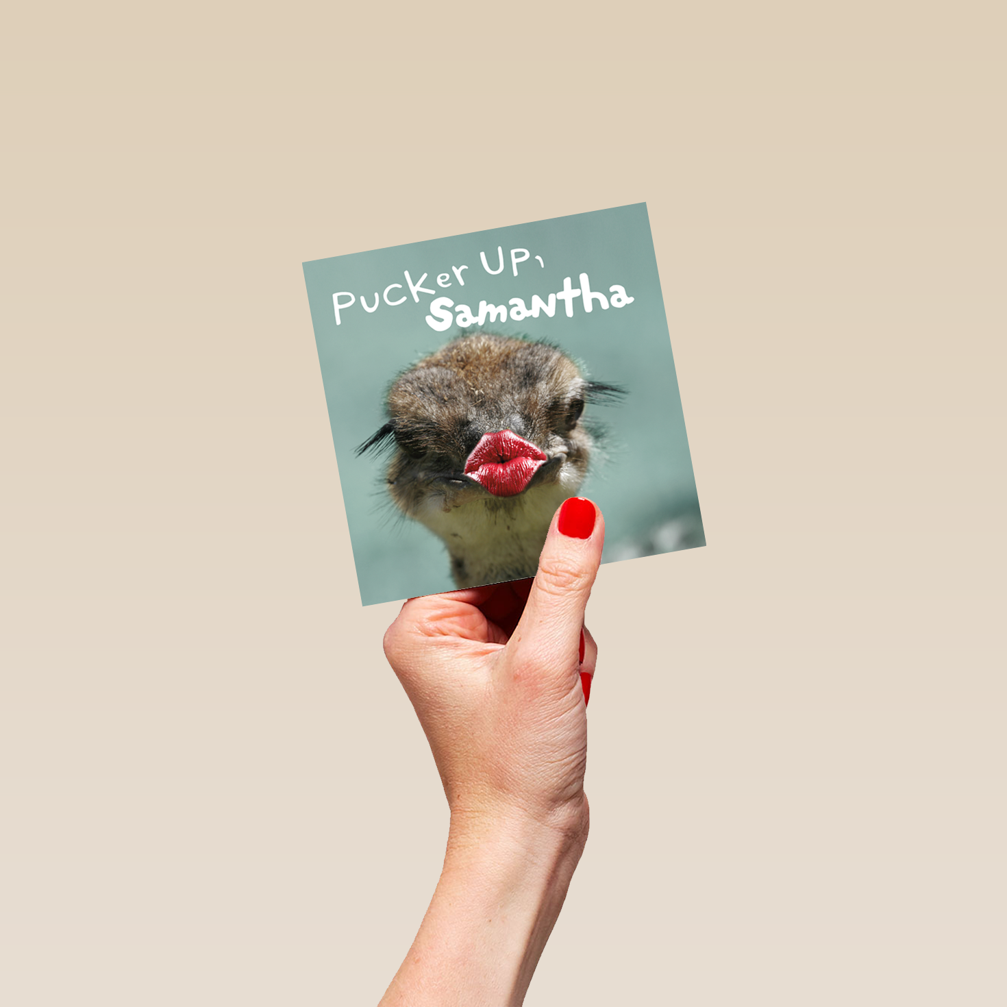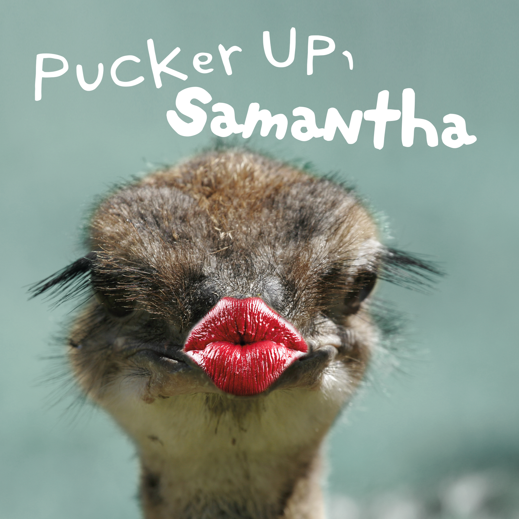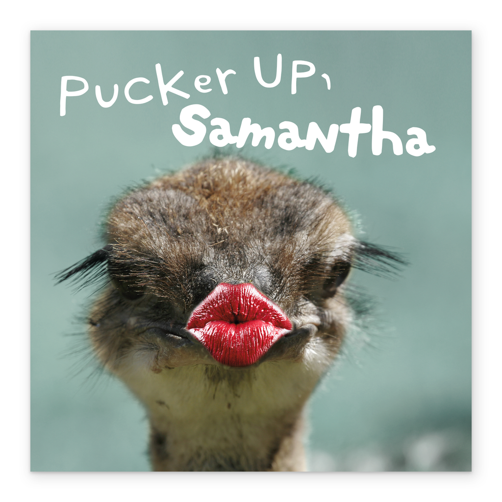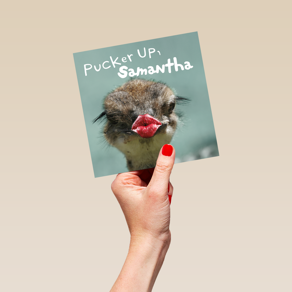 Printed on premium-quality board, this card features a funny photograph of a ostrich with puckered lips, with the message 'Pucker Up, [Name]!', space to personalise a name, and comes complete with a co-ordinating white envelope.