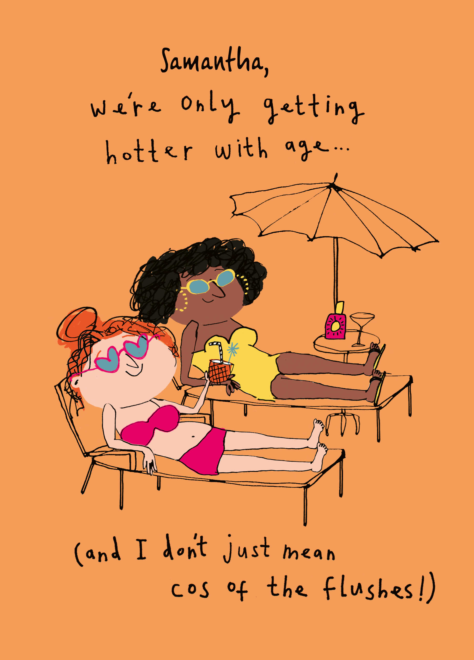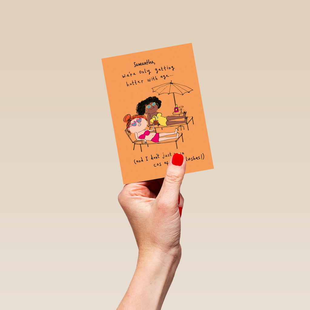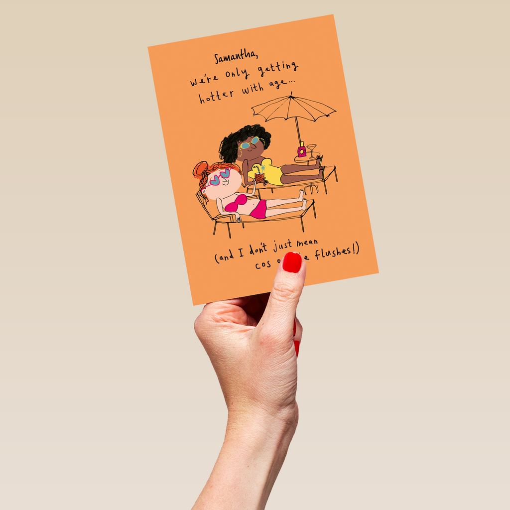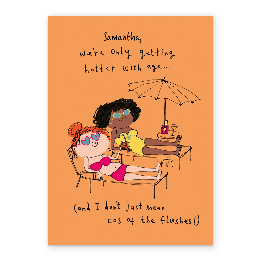 Printed on premium-quality board, this card features an illustration of two happy women sunbathing, with the message '[Name], we're only getting hotter with age… (and I don't just mean cos of the flushes!)', space to personalise a name, and comes complete with a co-ordinating white envelope.