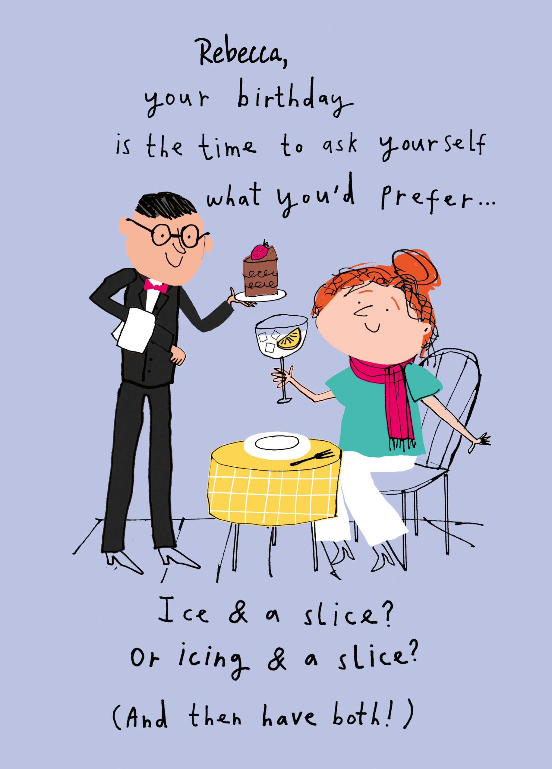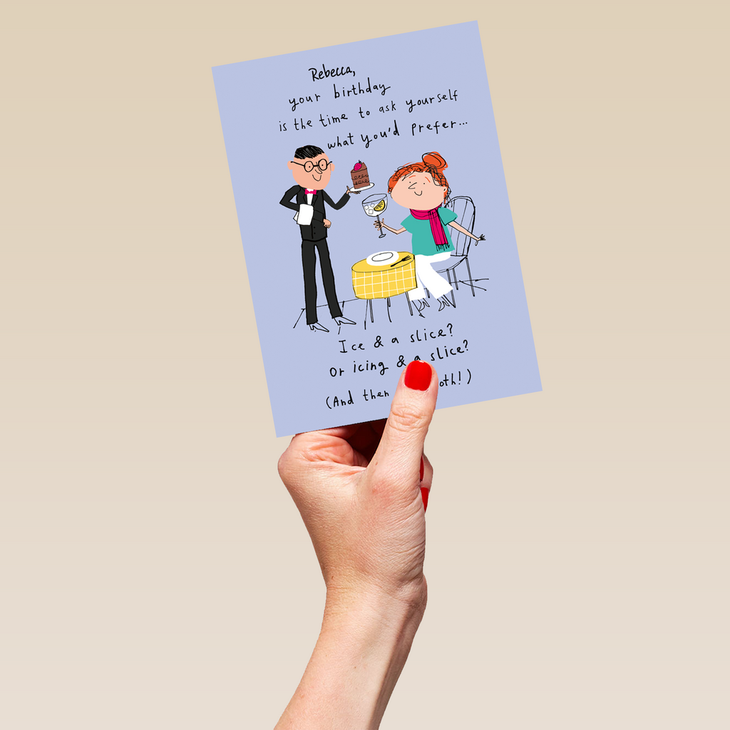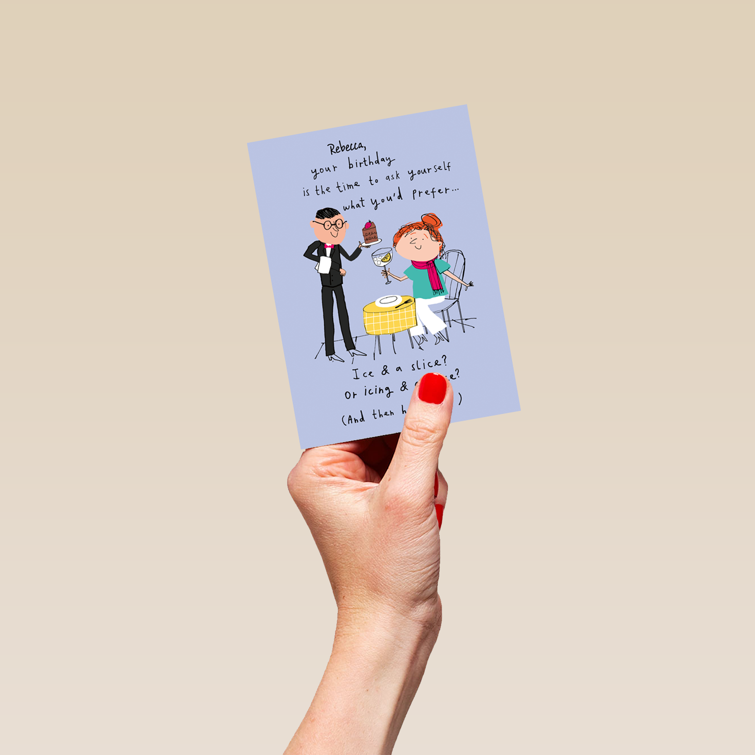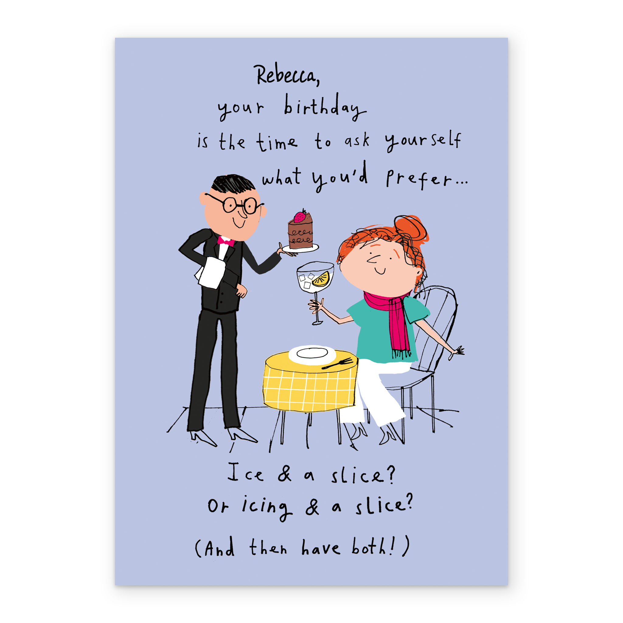 Printed on premium-quality board, this card features an illustration of a happy woman being served by a waiter in a restaurant setting, with the message '[Name], your birthday is the time to ask yourself what you'd prefer… Ice & a slice? Or icing & a slice? (And then have both!)', space to personalise a name, and comes complete with a co-ordinating white envelope.