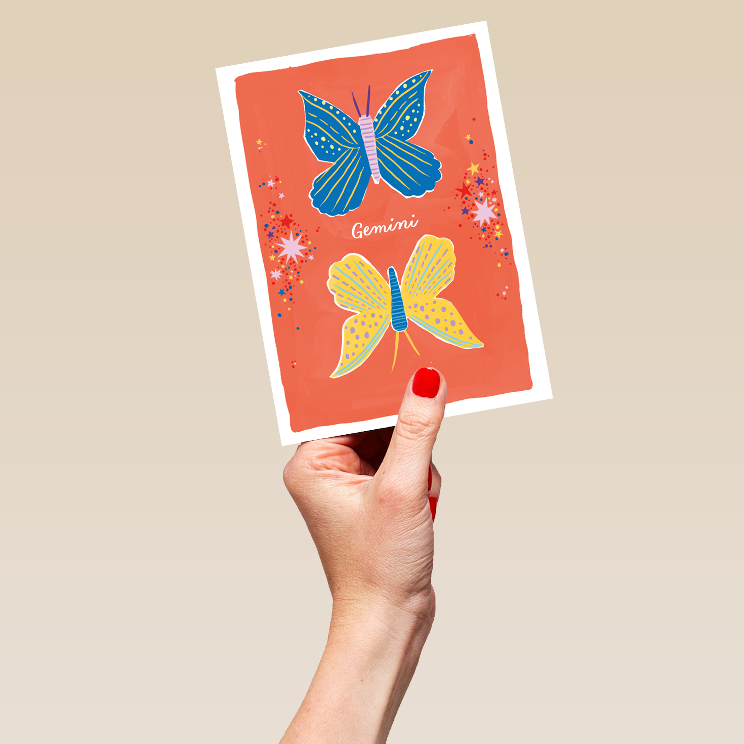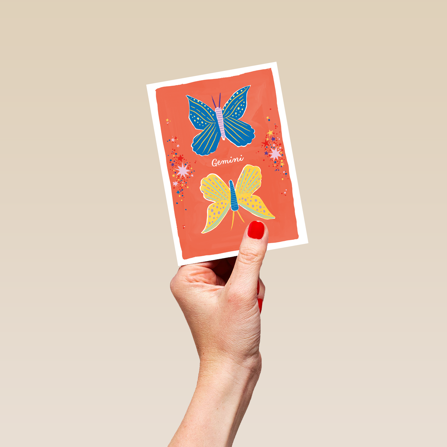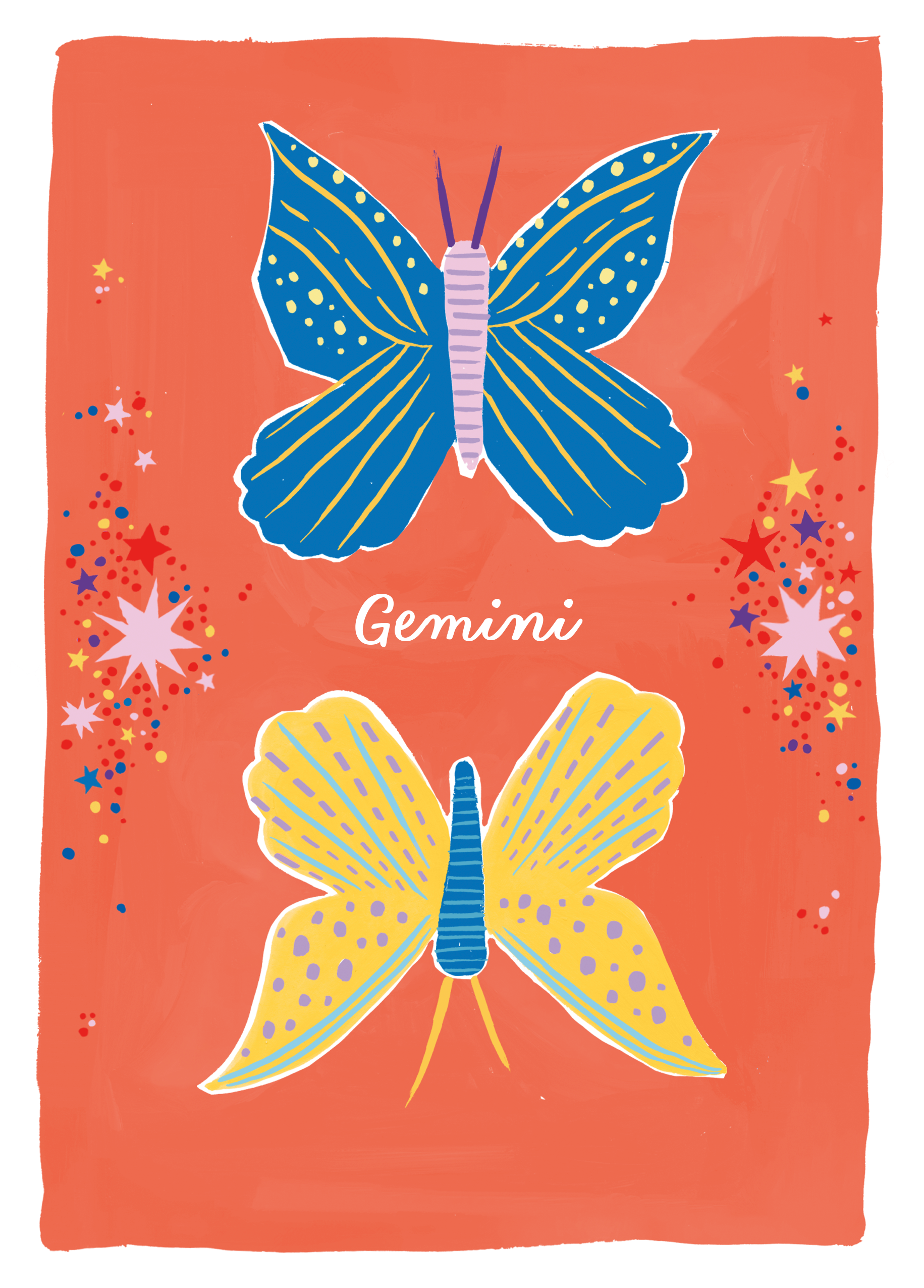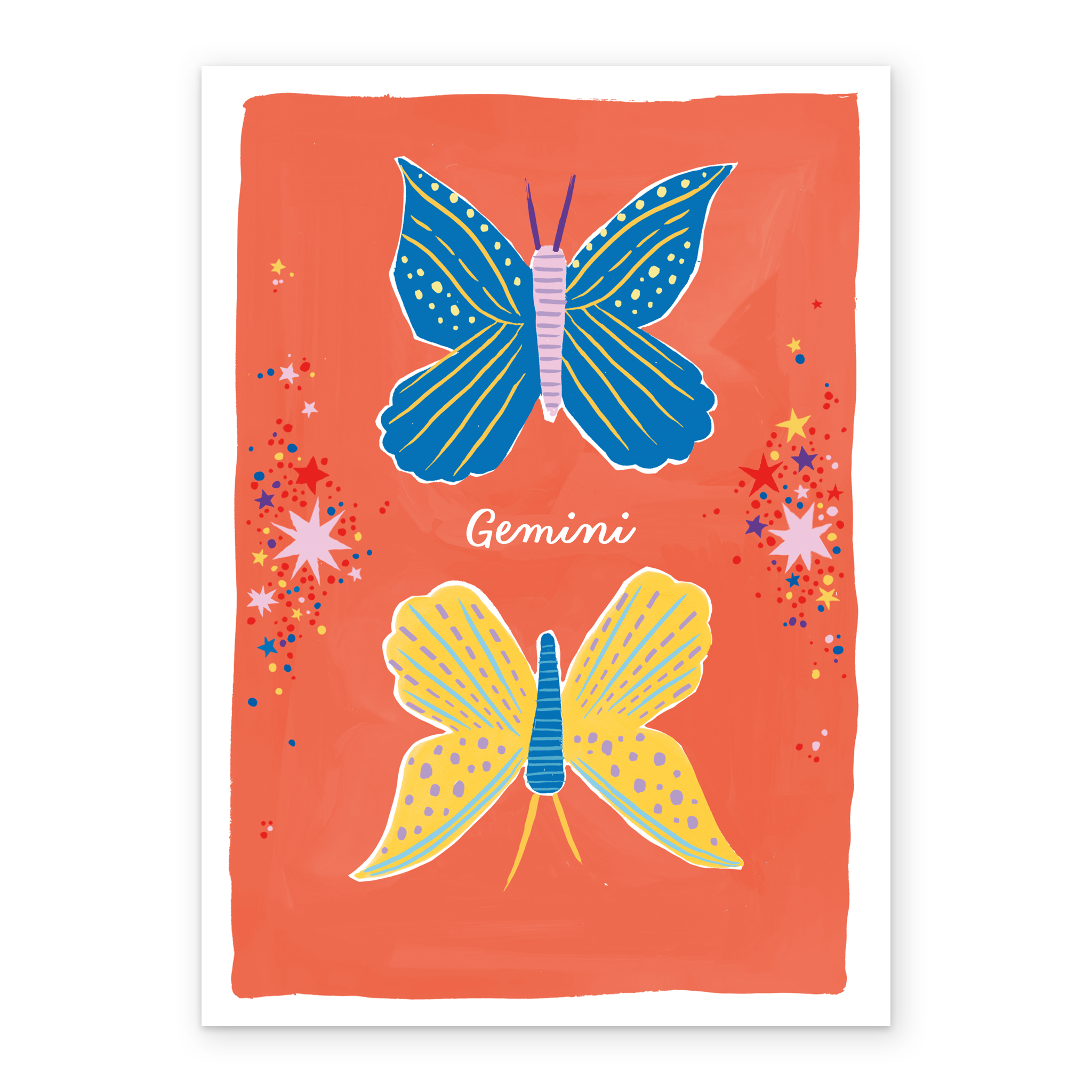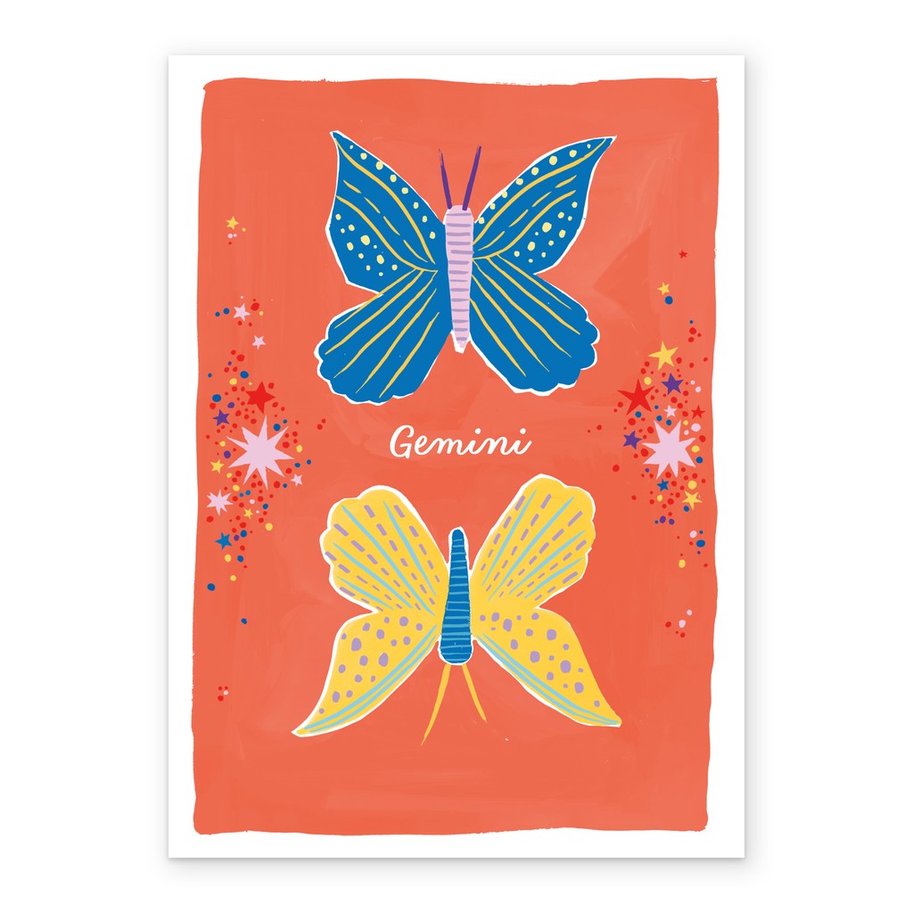 Printed on premium-quality board, this card features the star sign, Gemini, with an illustration of Twin butterflies, with the message 'Gemini', space to personalise your message, and comes complete with a co-ordinating white envelope.