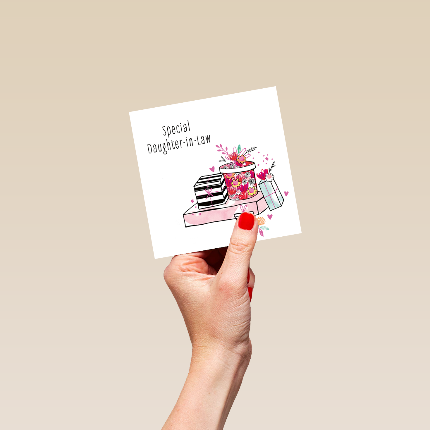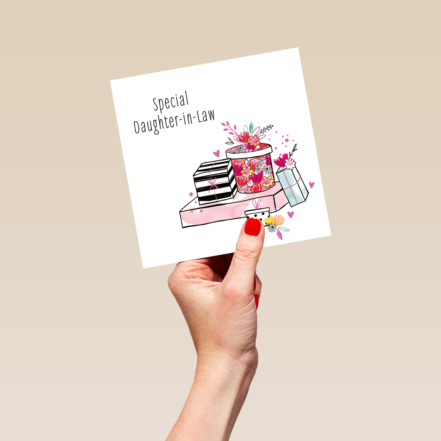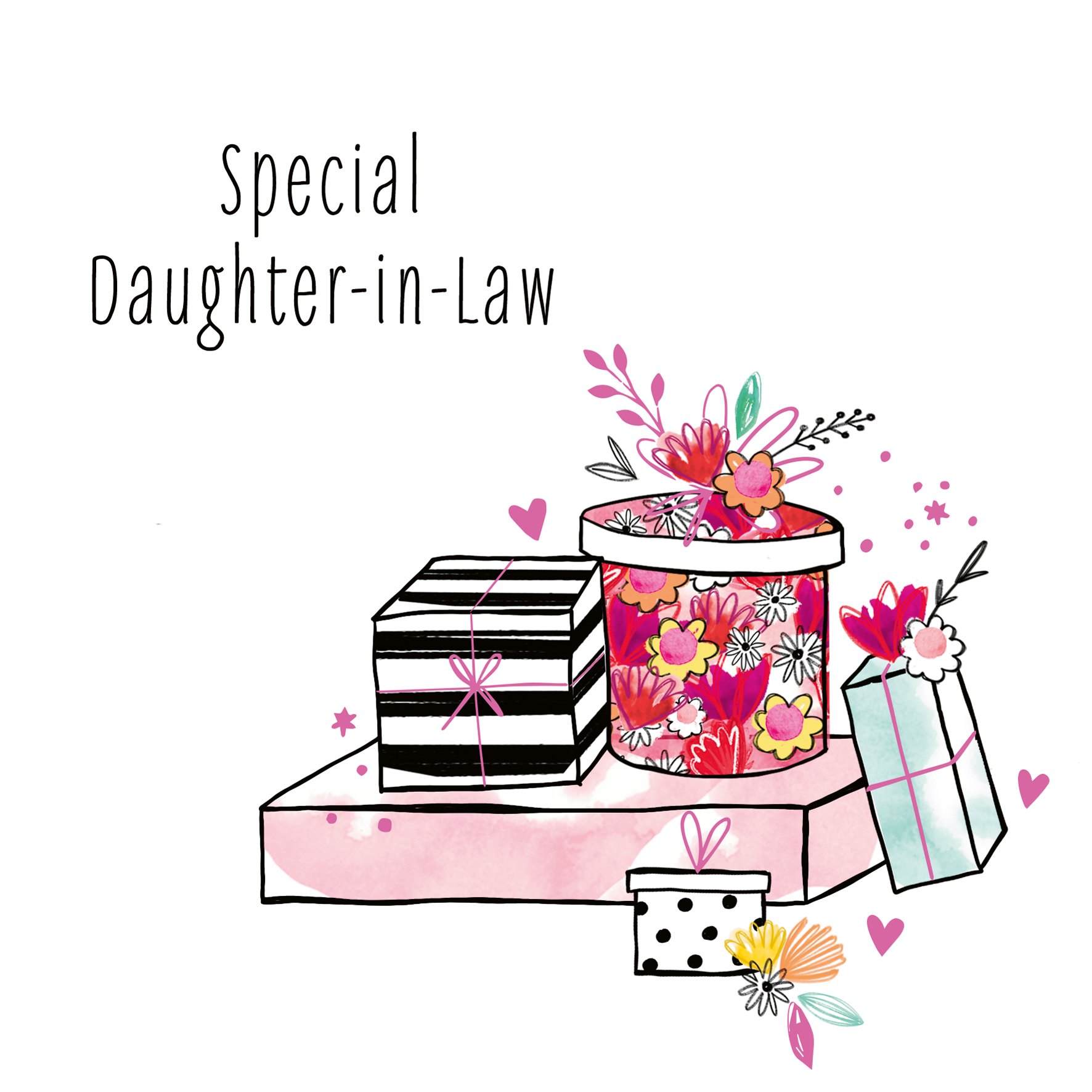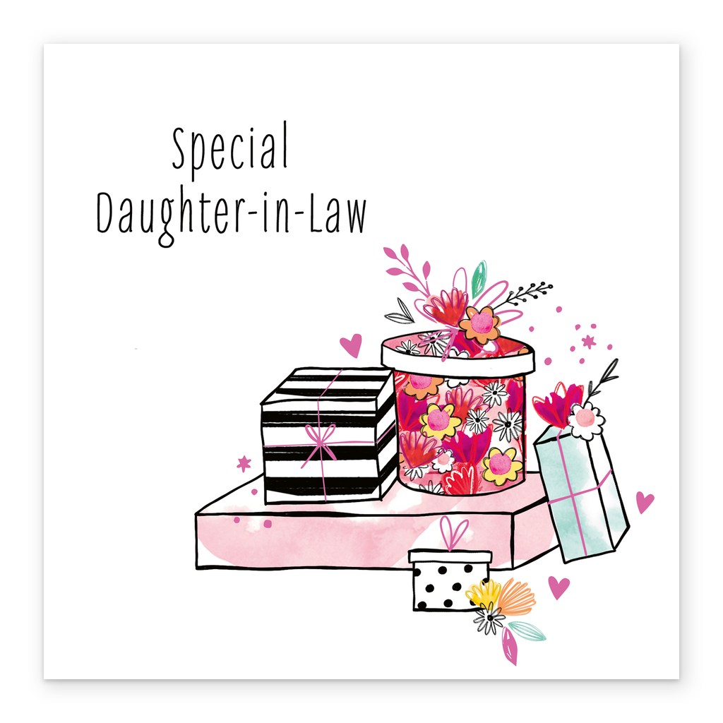 Printed on premium-quality board, this card features illustrated colourful gifts, with the message 'Special Daughter-in-Law', space to personalise your message, and comes complete with a co-ordinating white envelope.