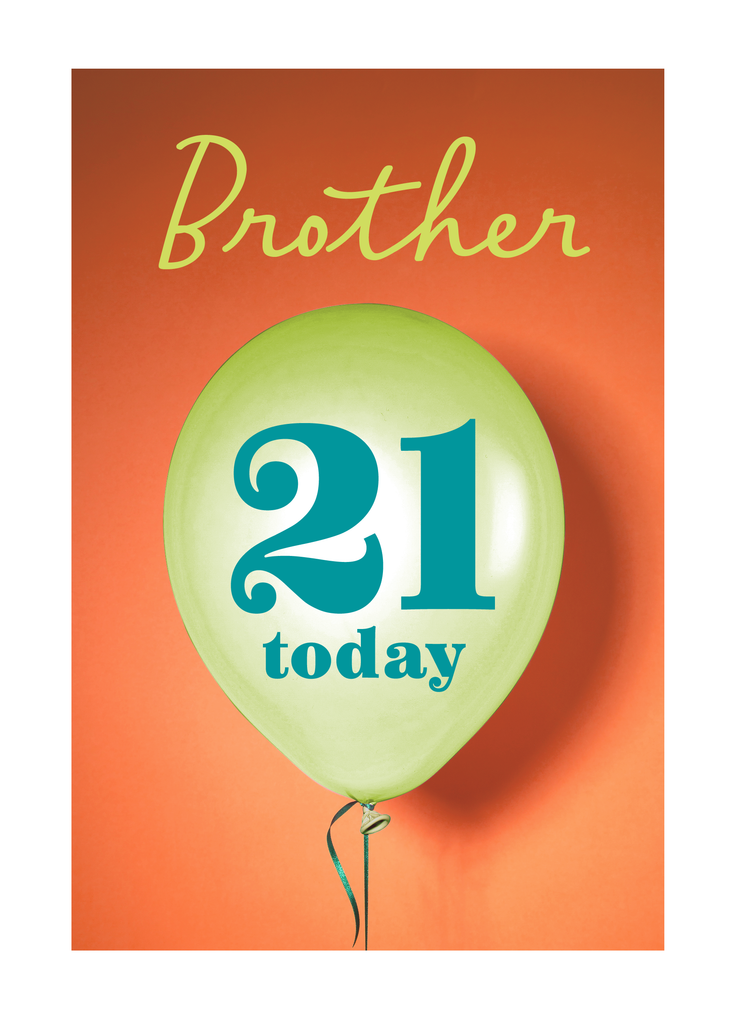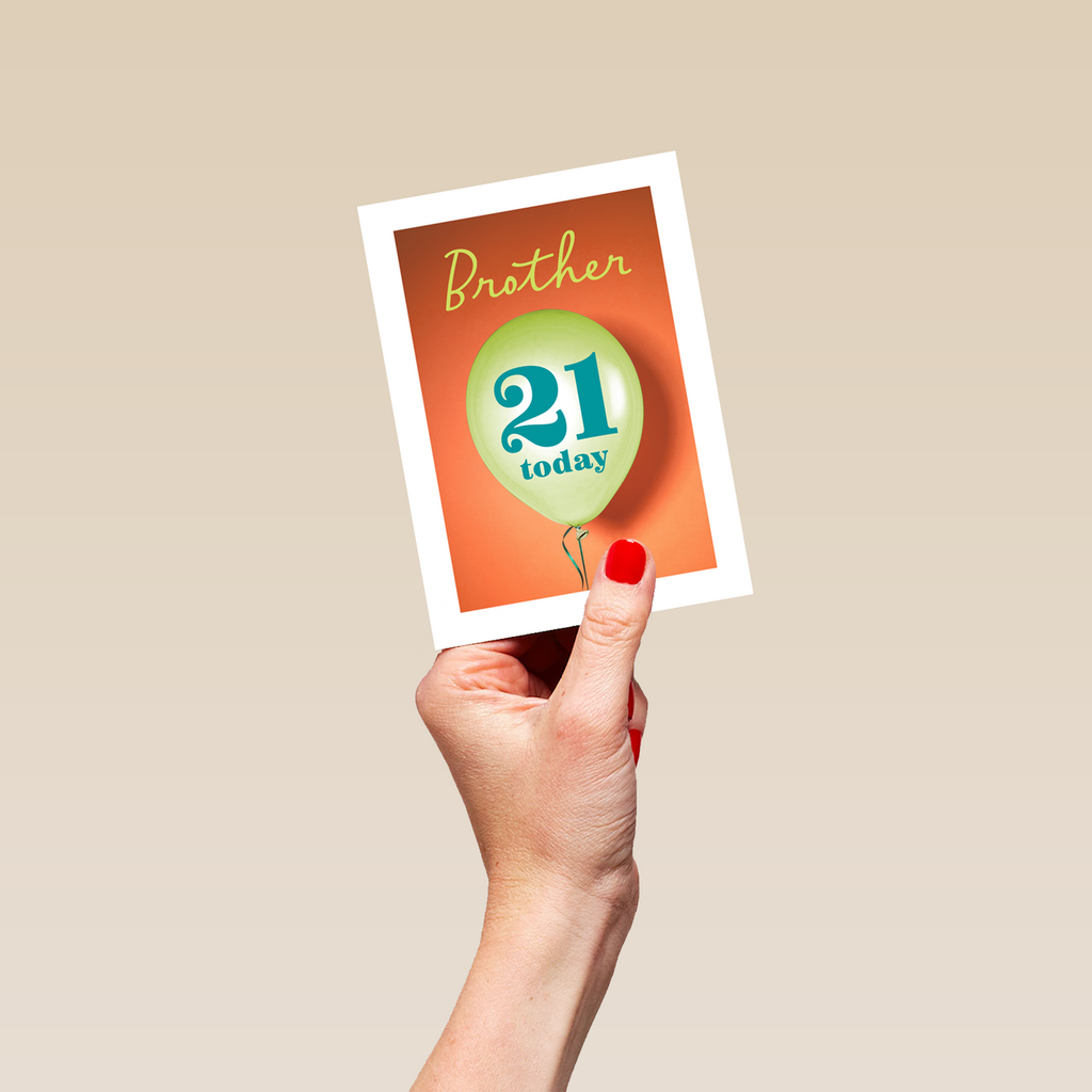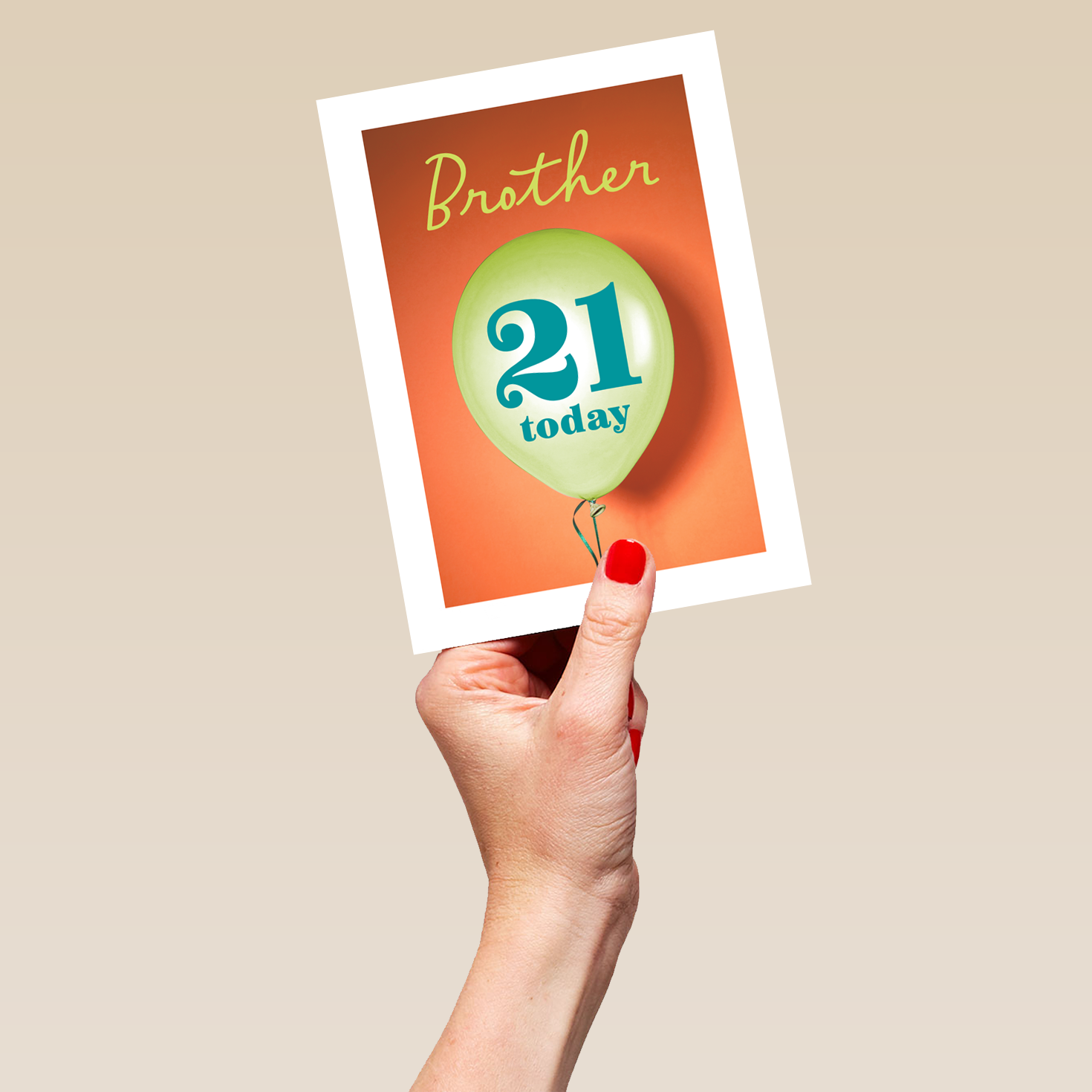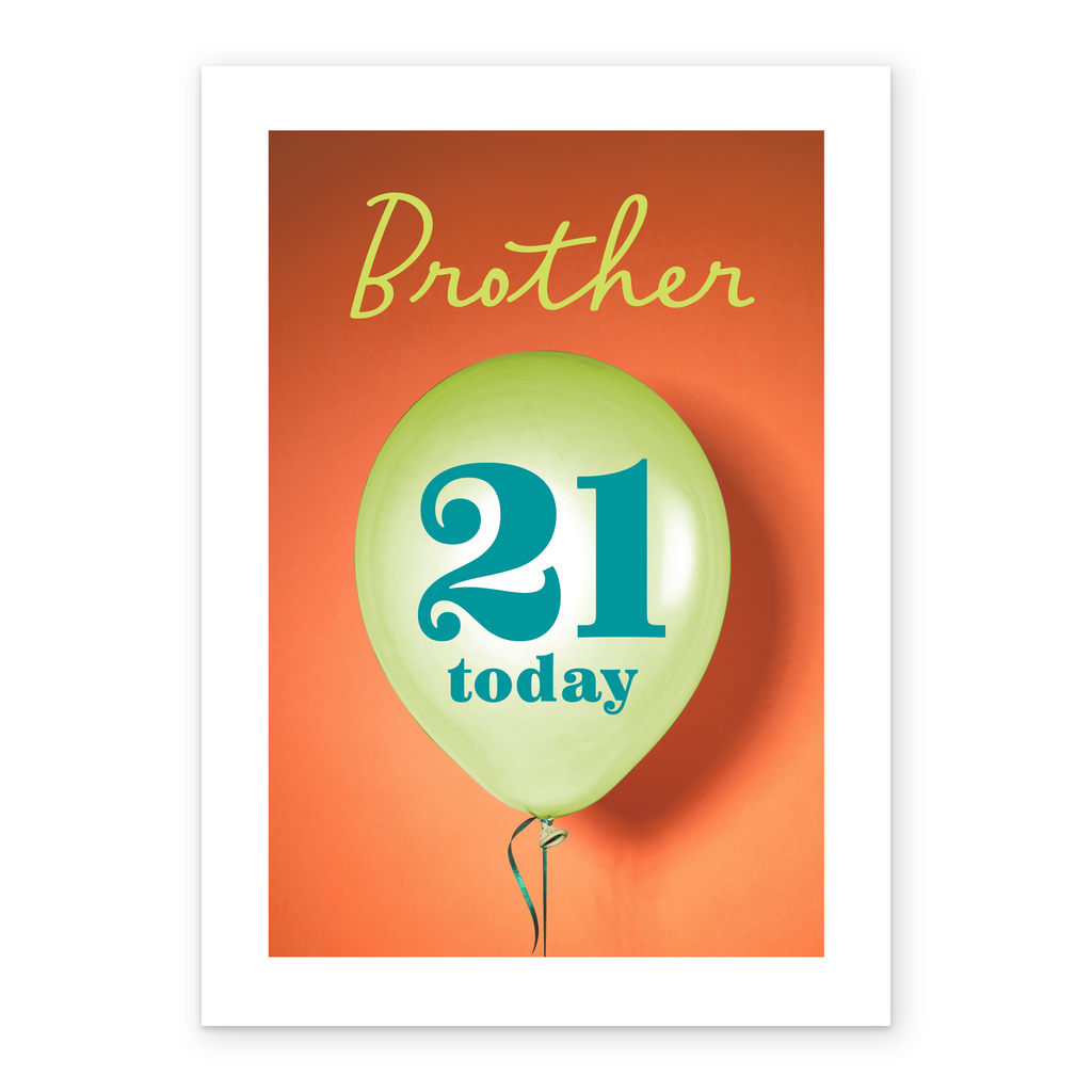 Printed on premium-quality board, this card features a floating 21 birthday balloon on a colourful background, with the message 'Brother, 21 Today', space to personalise a name, and comes complete with a co-ordinating white envelope.