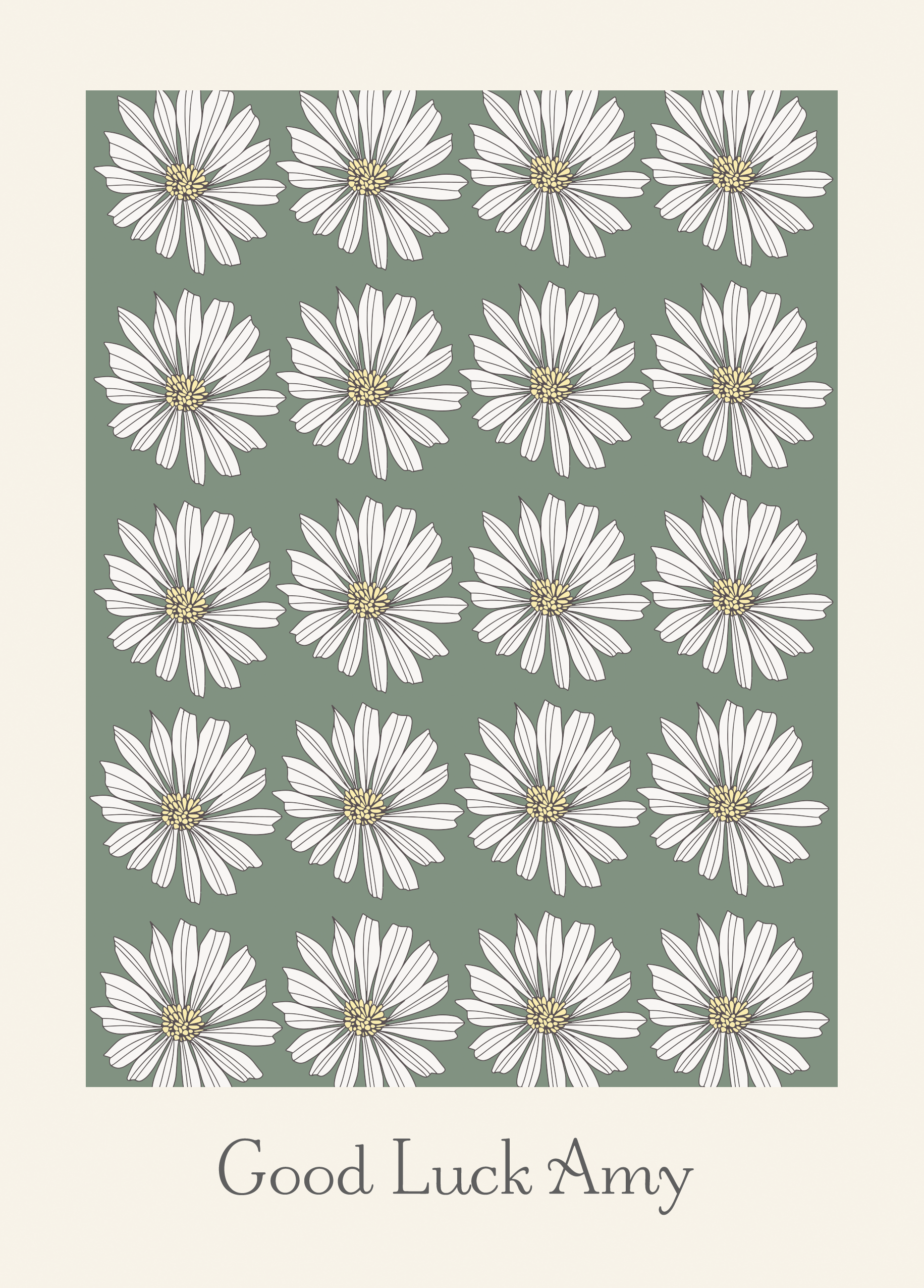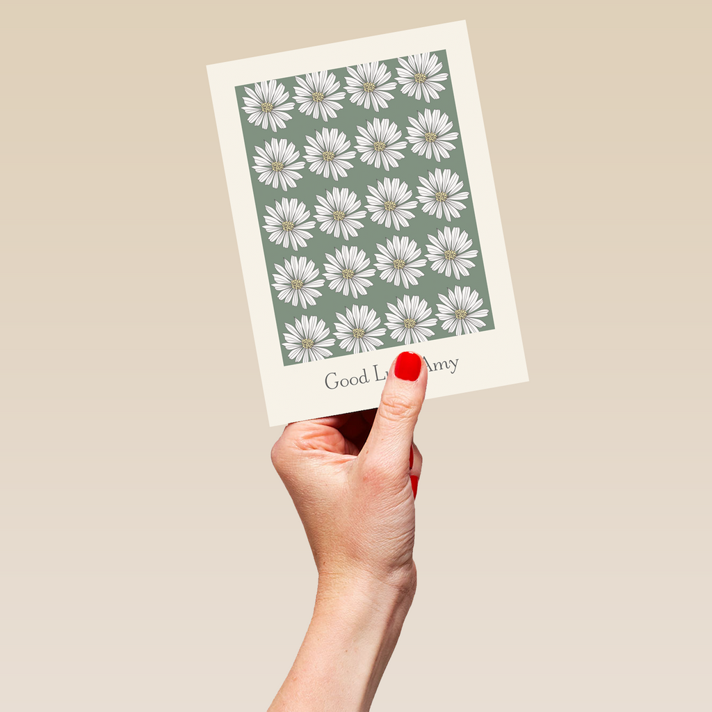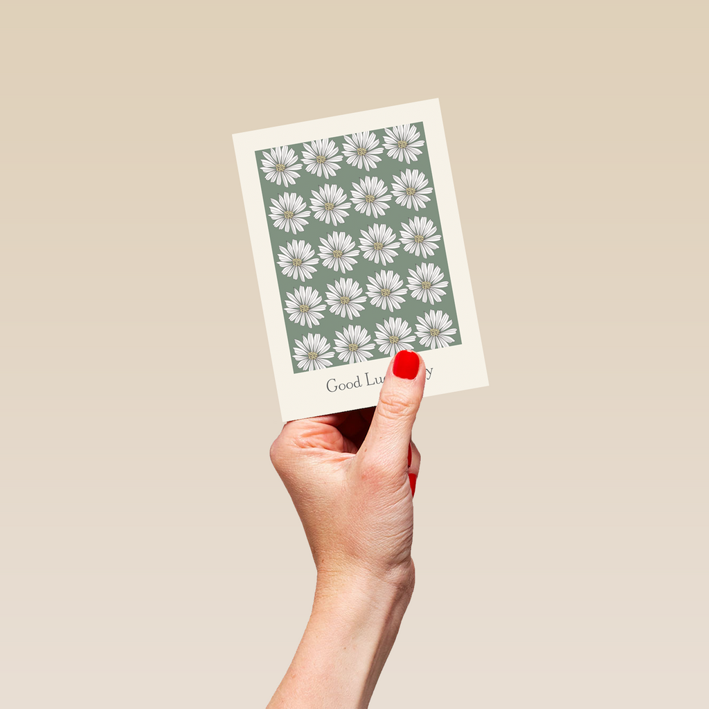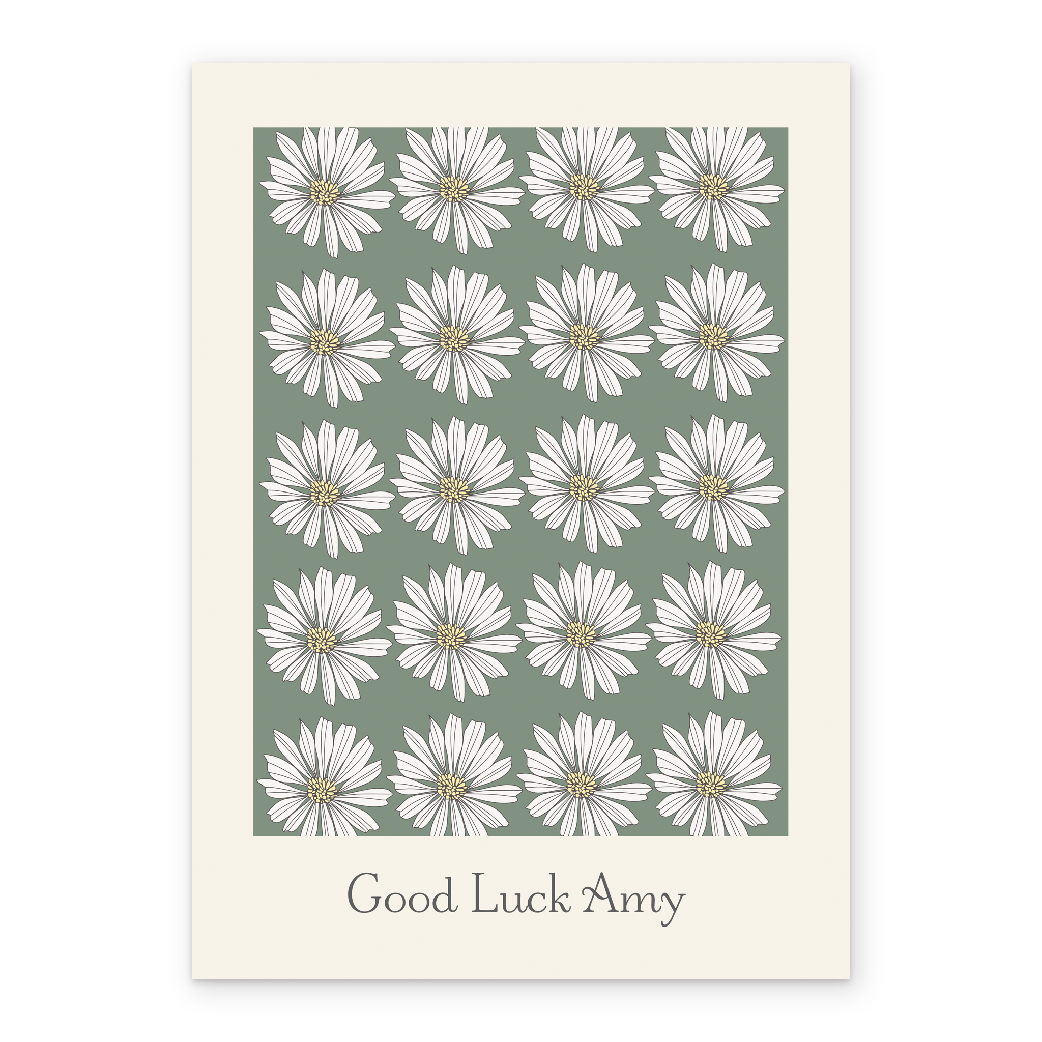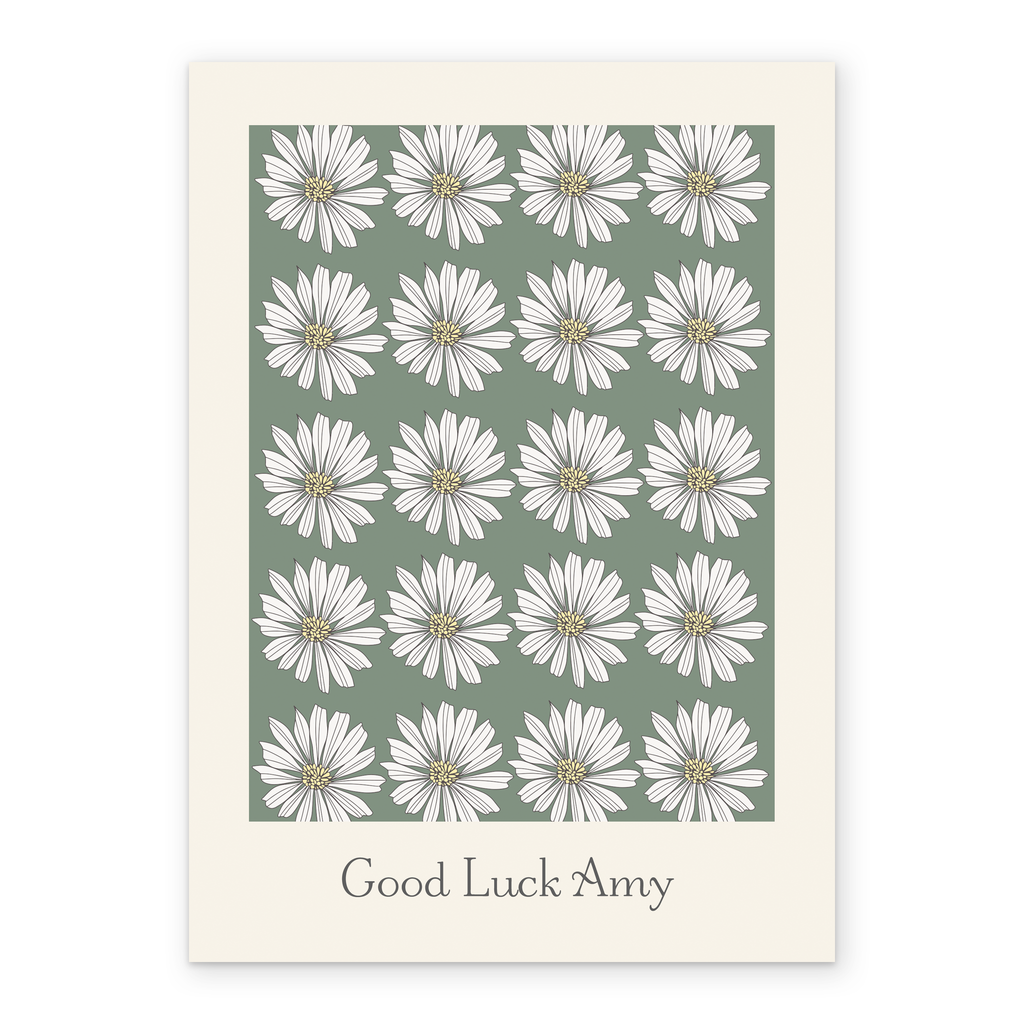 Printed on premium-quality board, this card features a daisy pattern, with the message 'Good Luck', space to personalise your message, and comes complete with a co-ordinating white envelope.