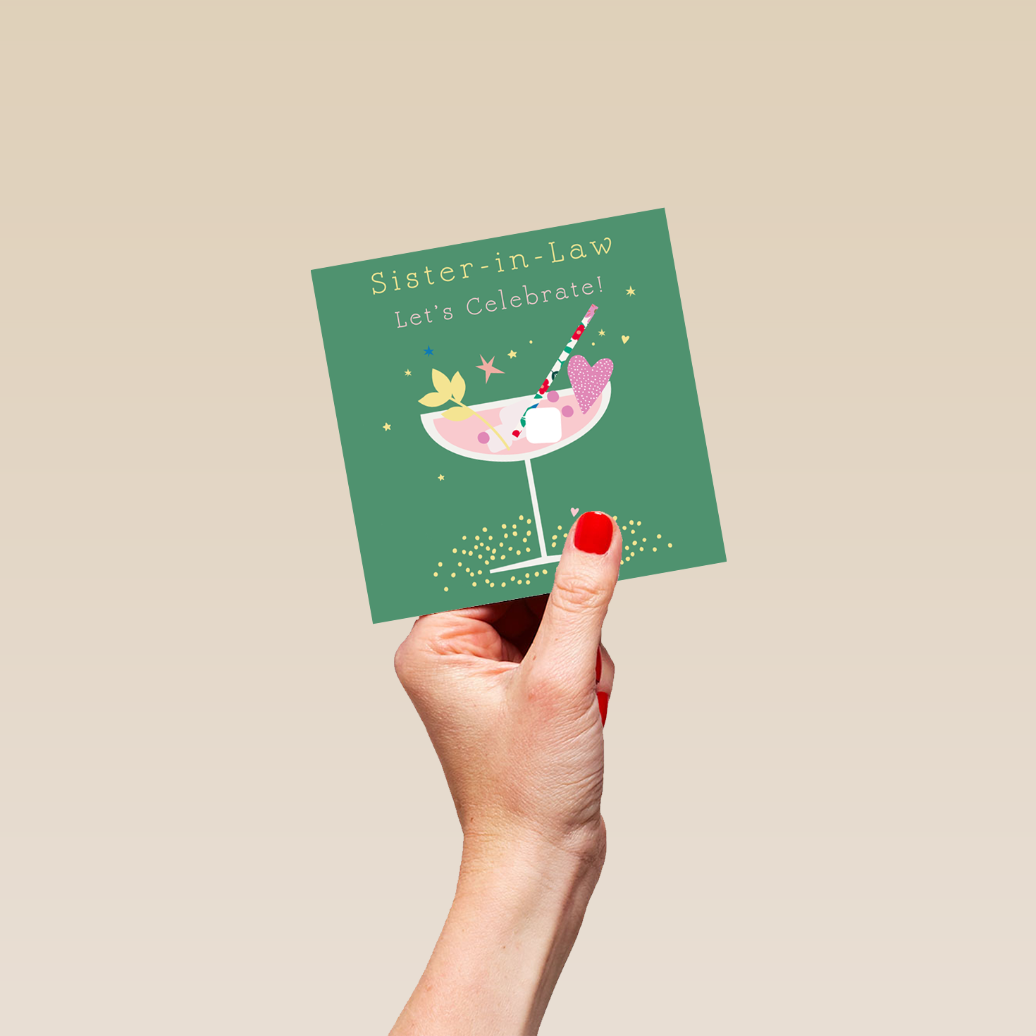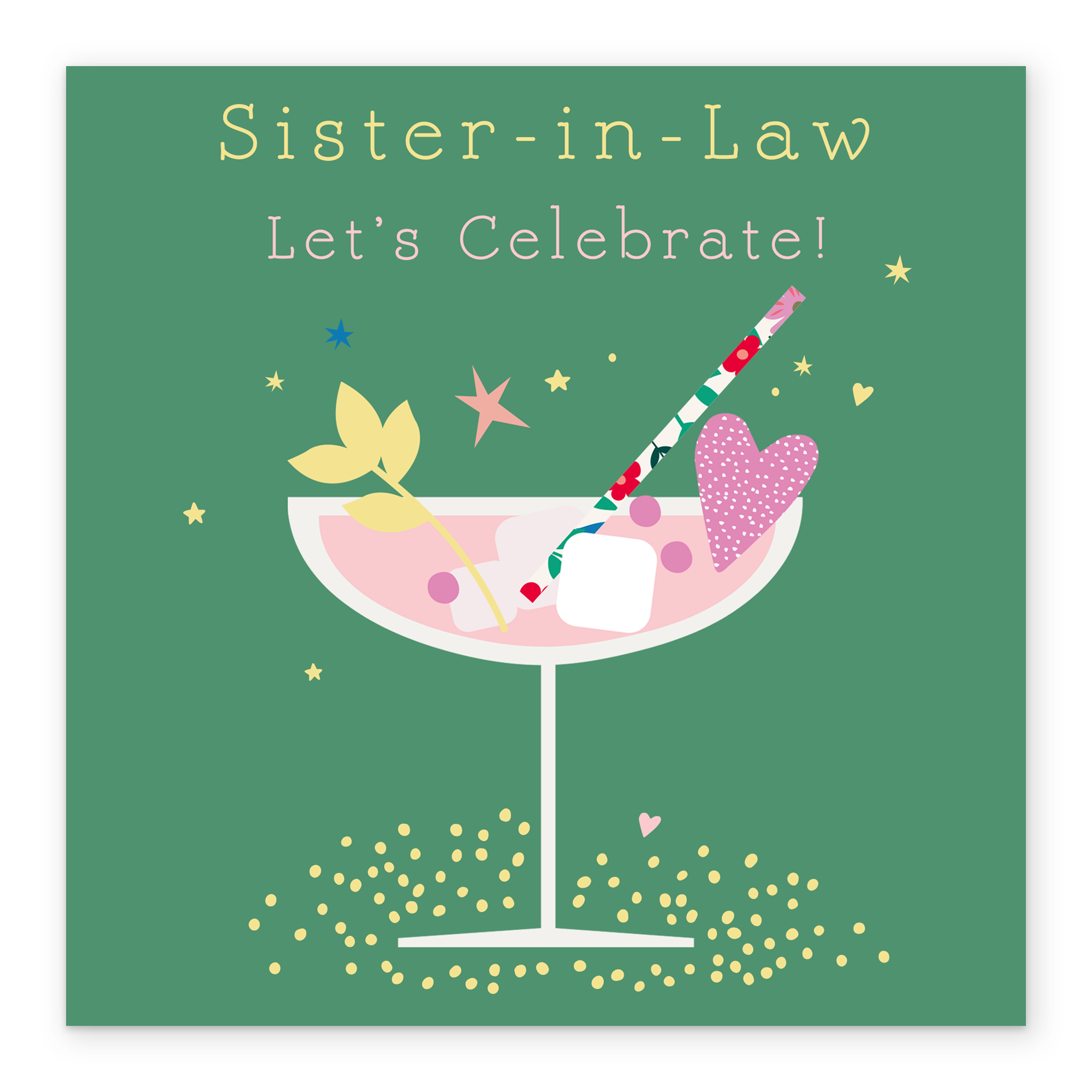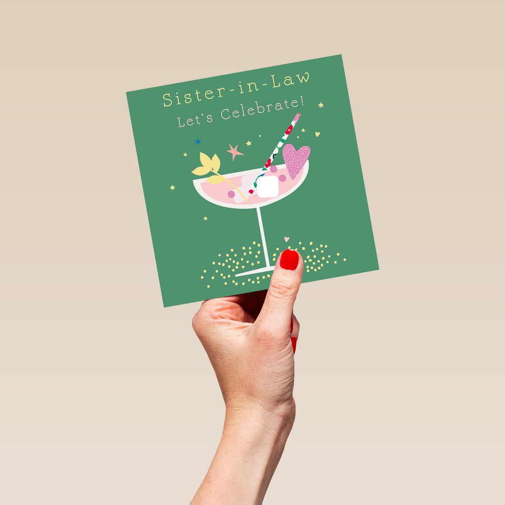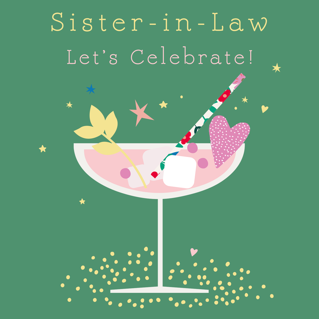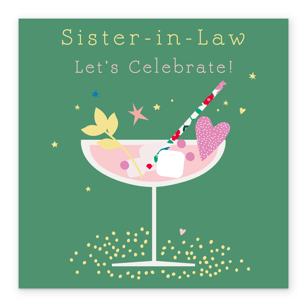 Printed on premium-quality board, this card features a pink champagne glass on green background, with the message 'Sister-in-Law Let's Celebrate!', space to personalise your message, and comes complete with a co-ordinating white envelope.