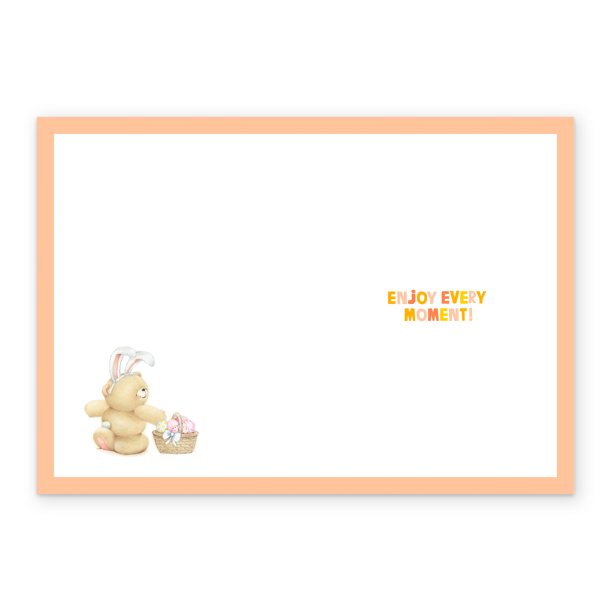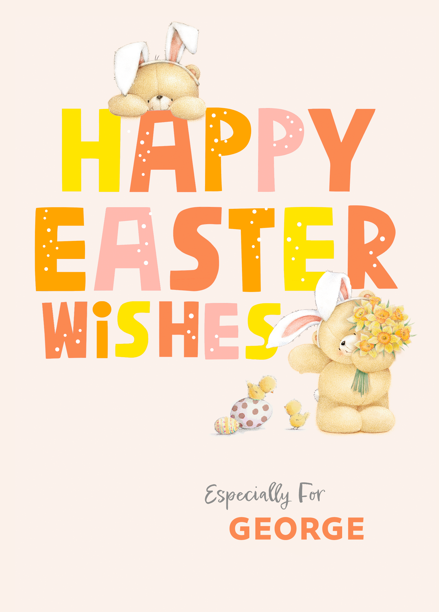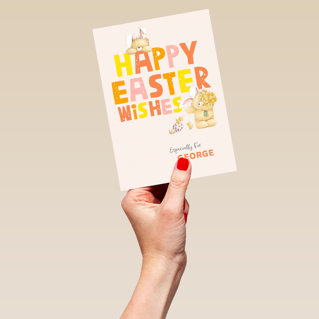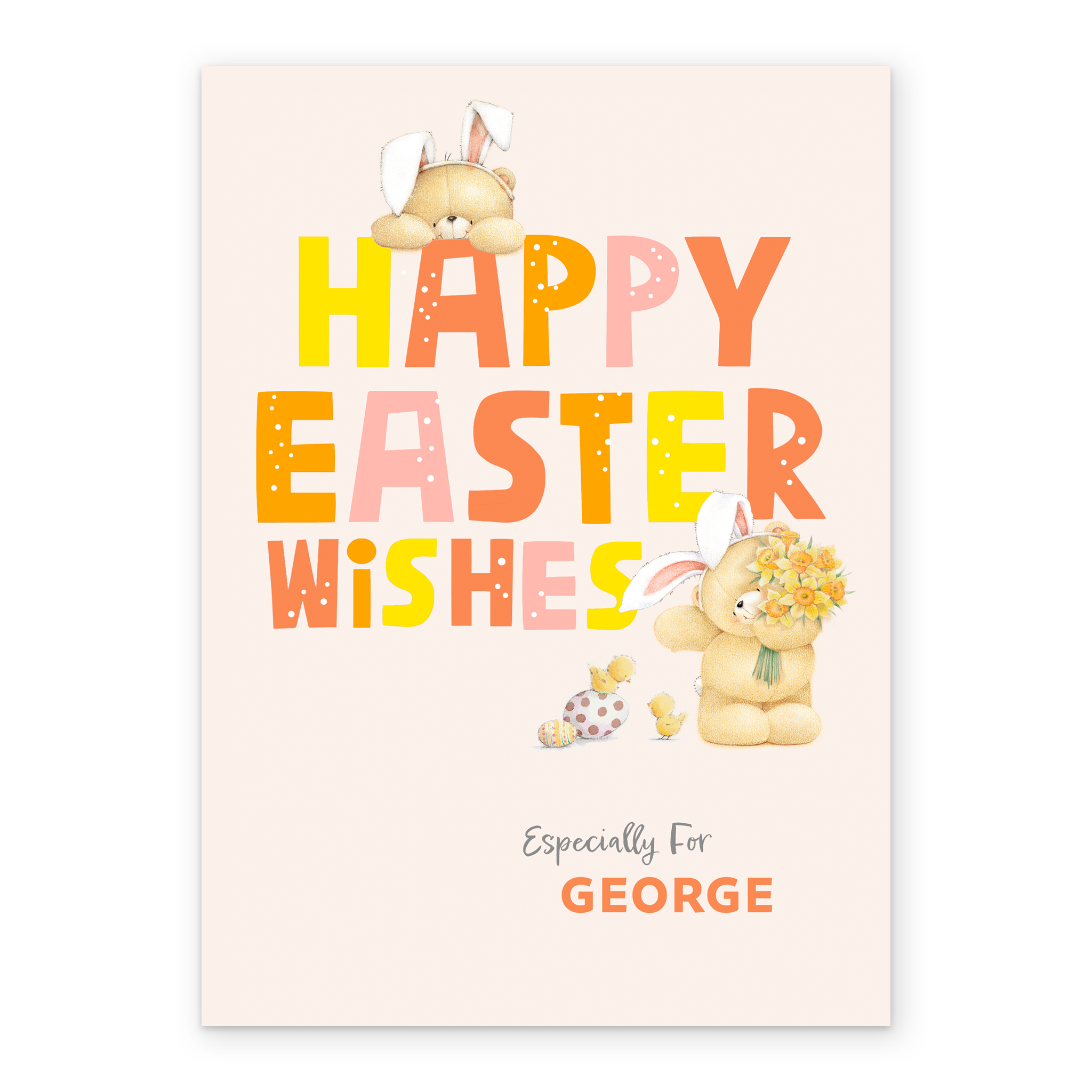 Printed on premium-quality board, this card features the Forever Friends bears wearing bunny ears and spring flowers, with the message 'Happy Easter Wishes. Especially For [NAME]', space to personalise a name, and comes complete with a co-ordinating white envelope.