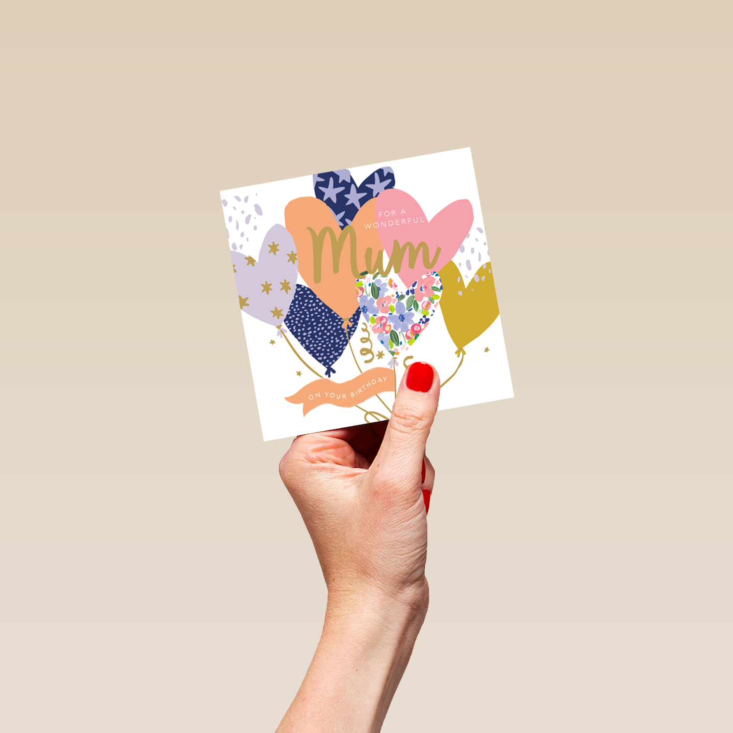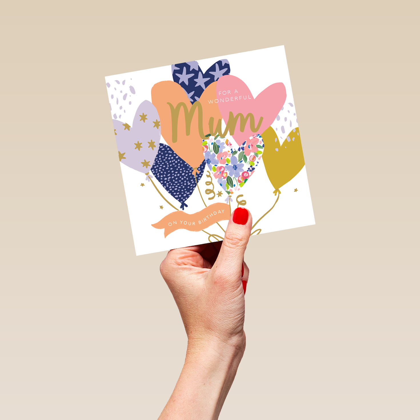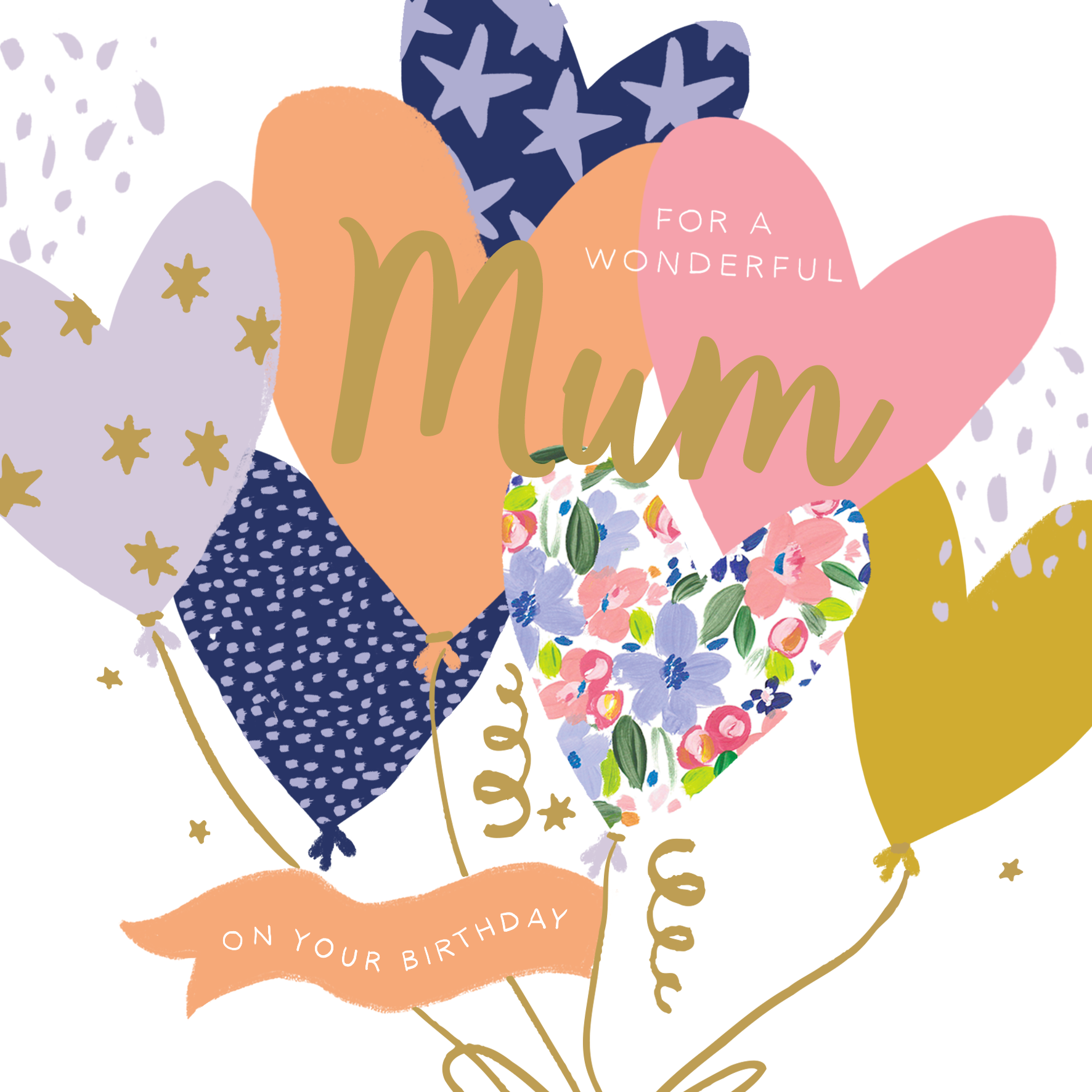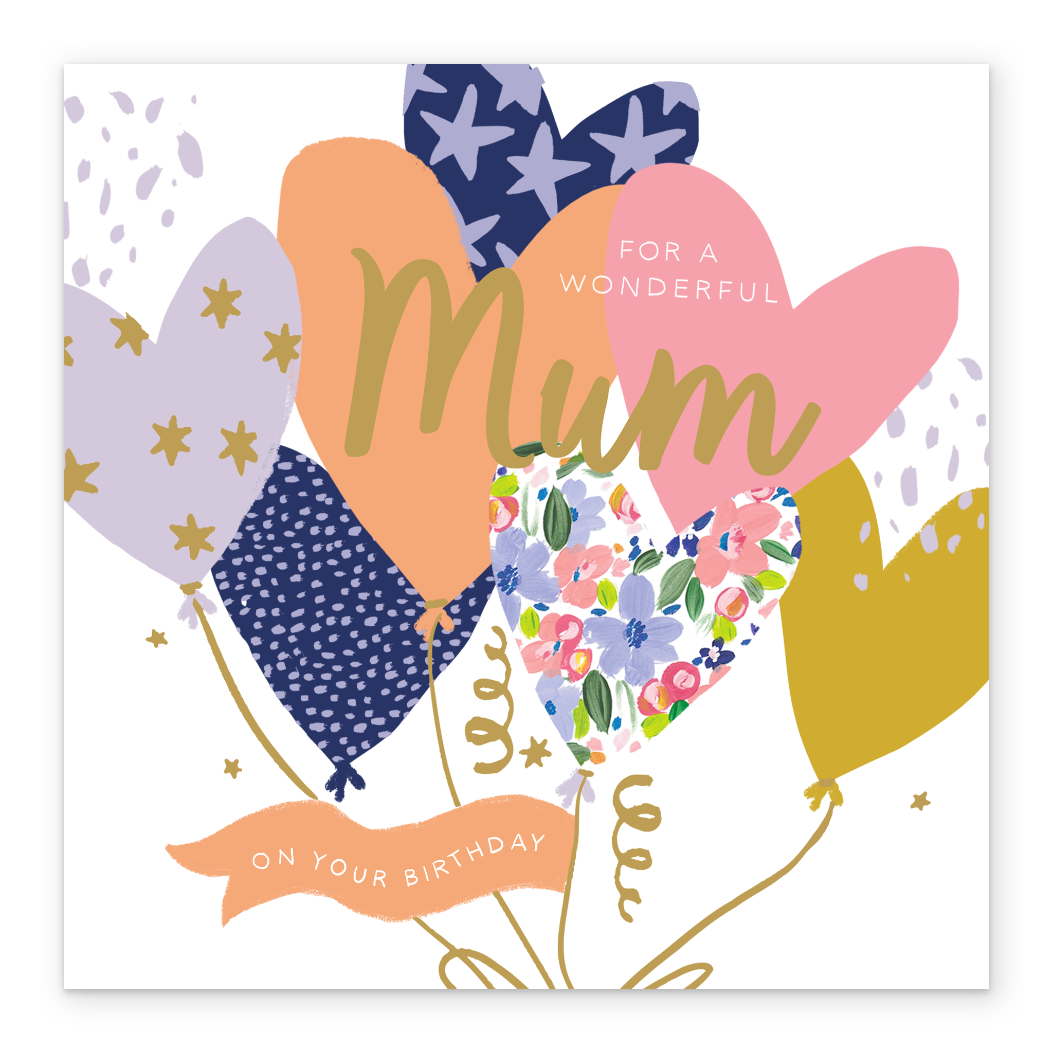 Printed on premium-quality board, this card features an illustration of heart shaped balloons with different patterns and colours, with the message 'For a Wonderful [NAME] on Your Birthday', space to personalise a name, and comes complete with a co-ordinating white envelope.