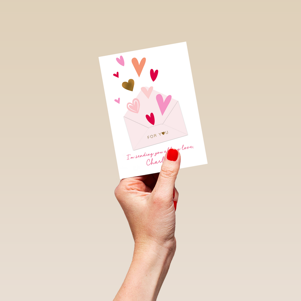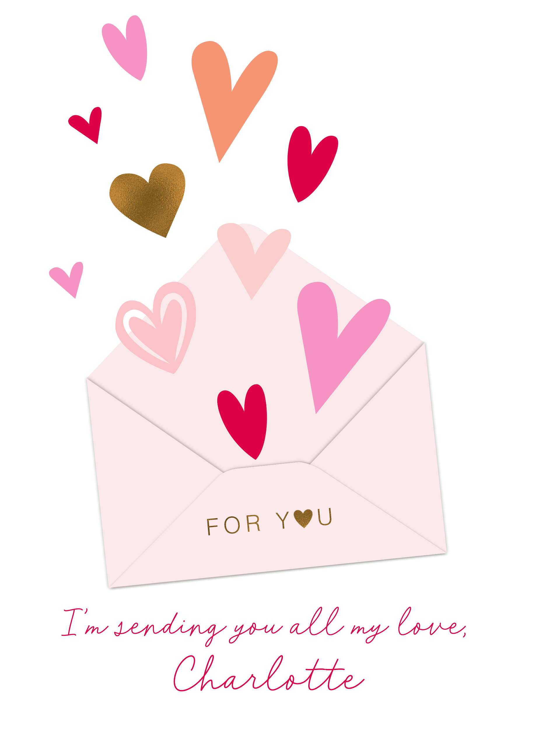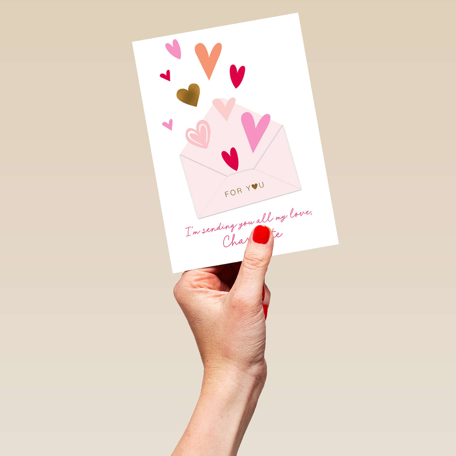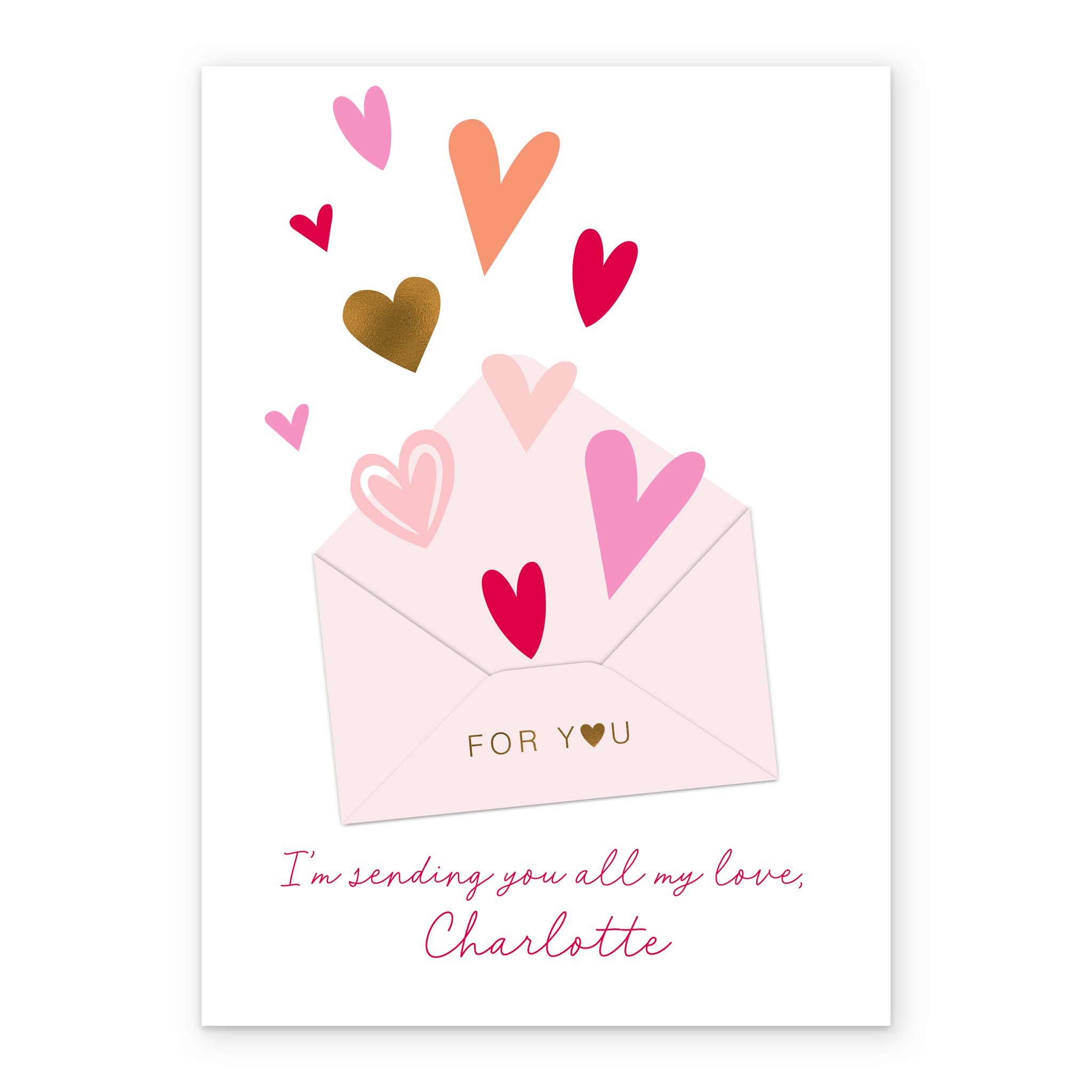 Printed on premium-quality board, this card features hearts coming out of an envelope, with the message 'I'm sending you all my love', space to personalise a name, and comes complete with a co-ordinating white envelope.