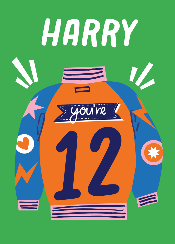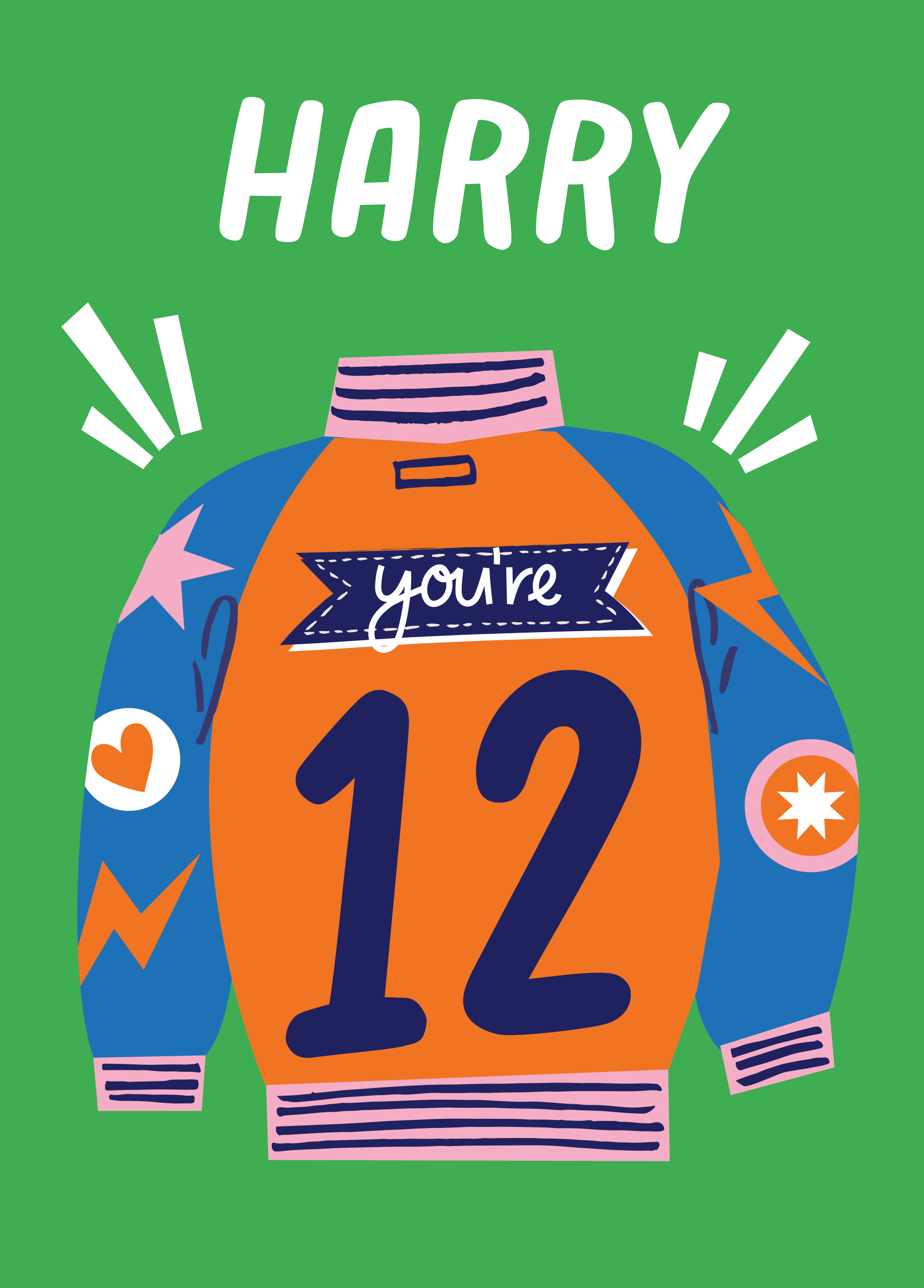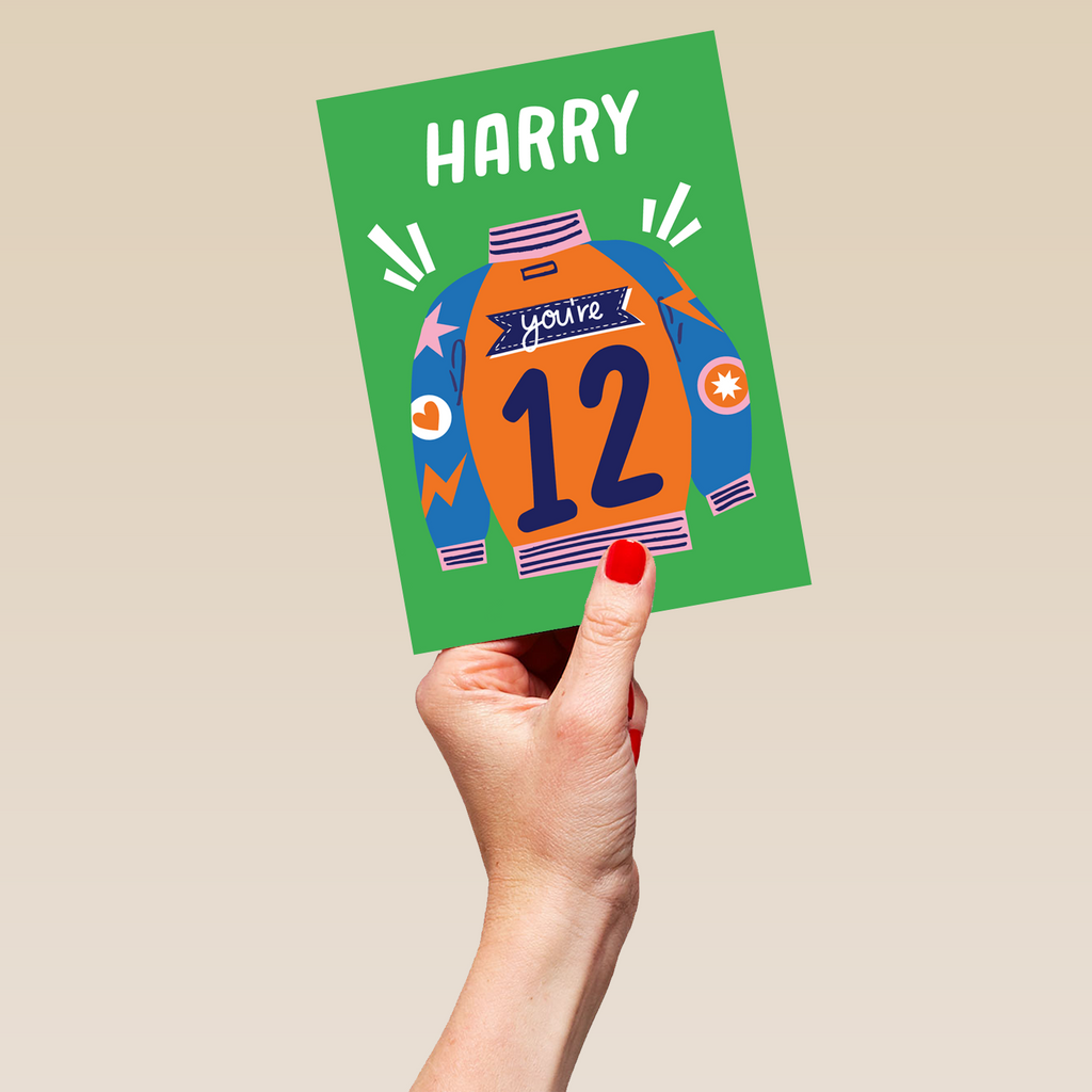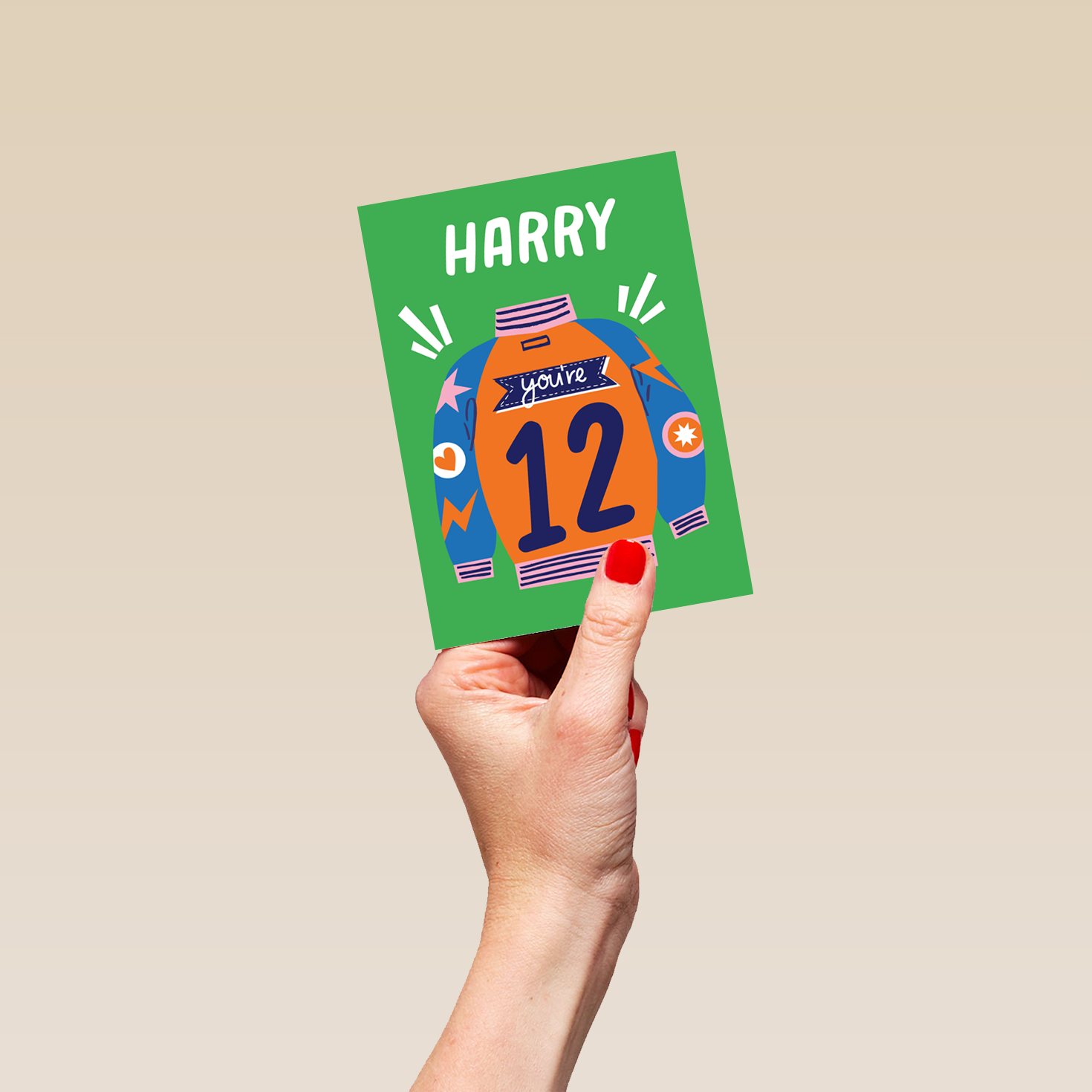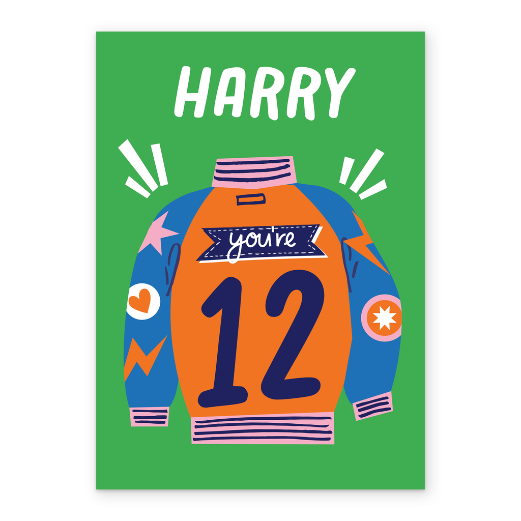 Printed on premium-quality board, this card features an illustration of a jacket, with the message 'You're 12', space to personalise a name and the age, and comes complete with a co-ordinating white envelope.