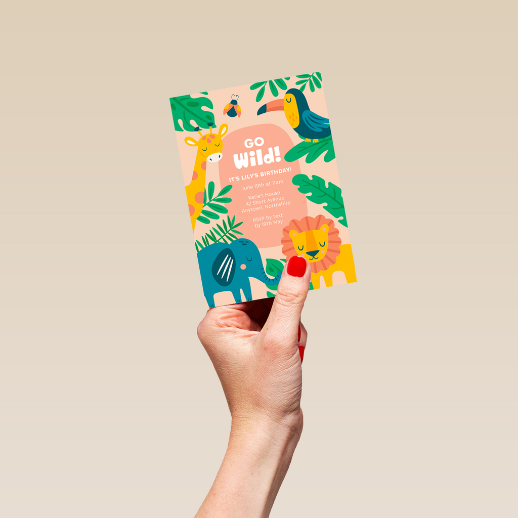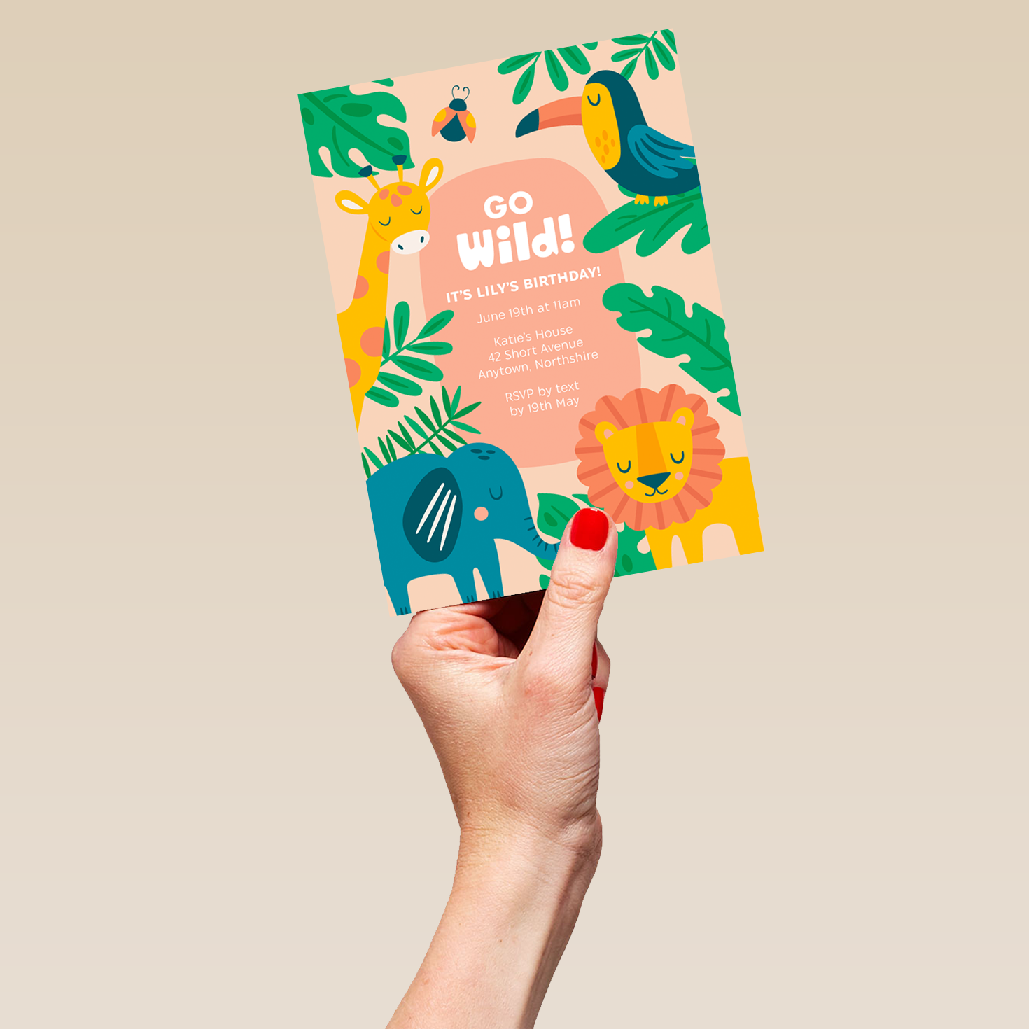 Printed on premium-quality board, this card features editable space for a date, address and contact details, adorable animals including a giraffe, toucan, elephant, lion and bug surrounded by leaves design, with the message 'Go Wild! It's [Name]'s Birthday!', space to personalise a name, and comes complete with a co-ordinating white envelope.