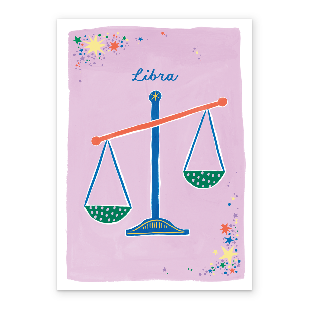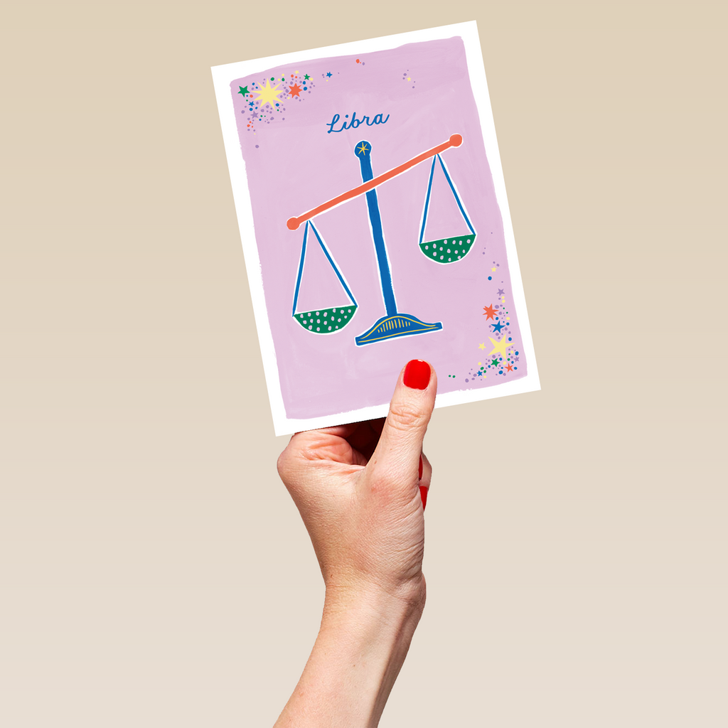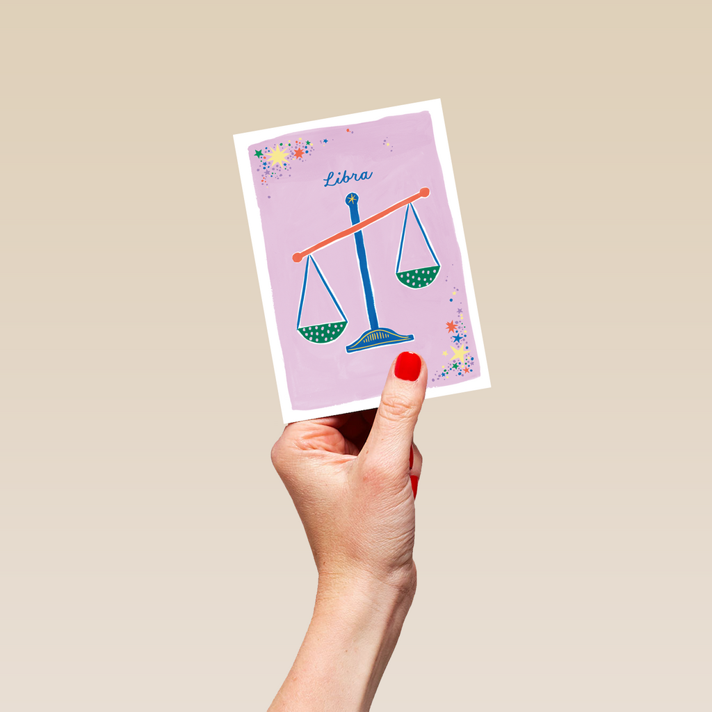 Printed on premium-quality board, this card features the star sign, Libra, with an illustration of Balance Scales, with the message 'Libra', space to personalise your message, and comes complete with a co-ordinating white envelope.