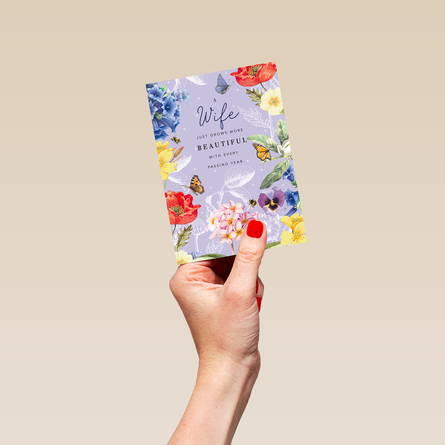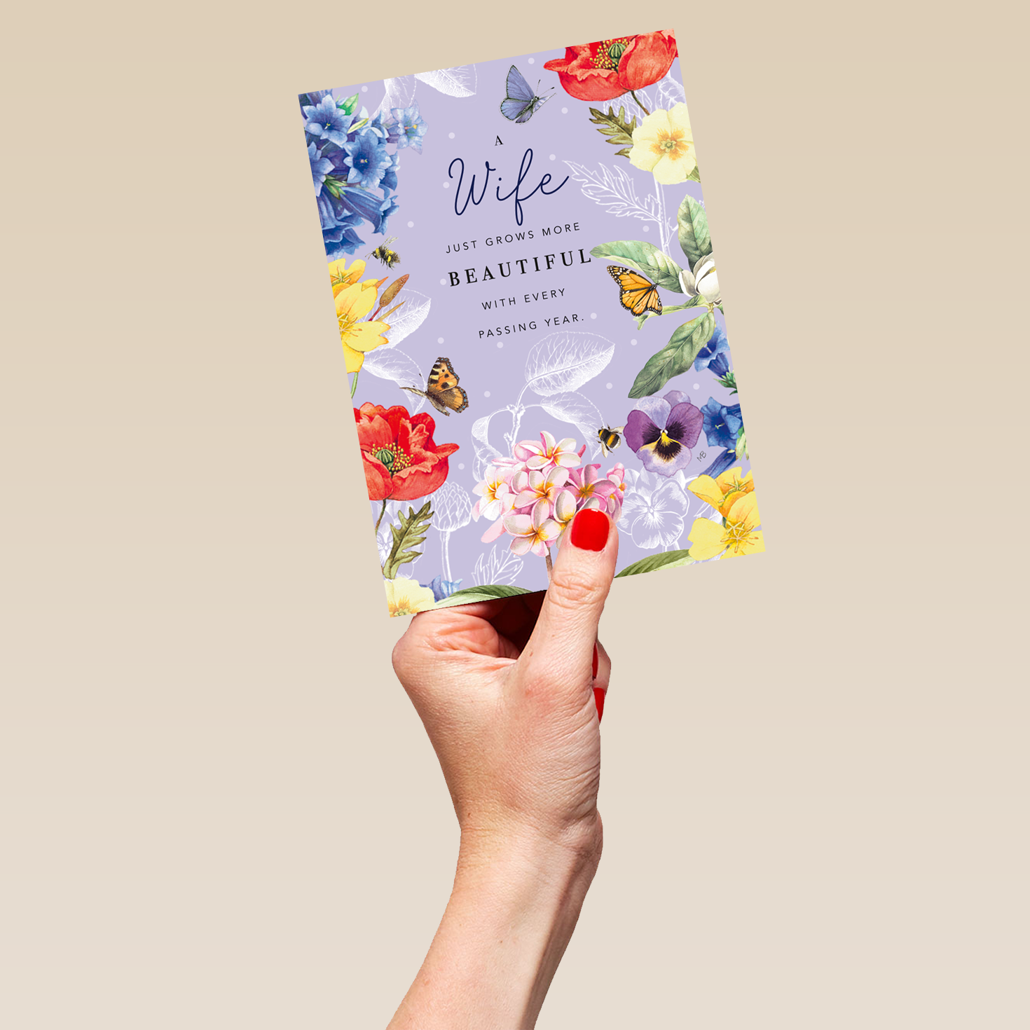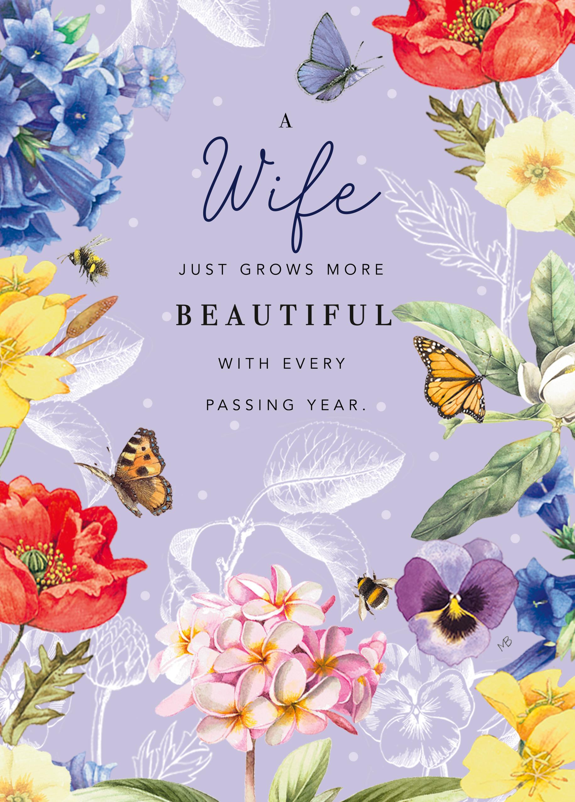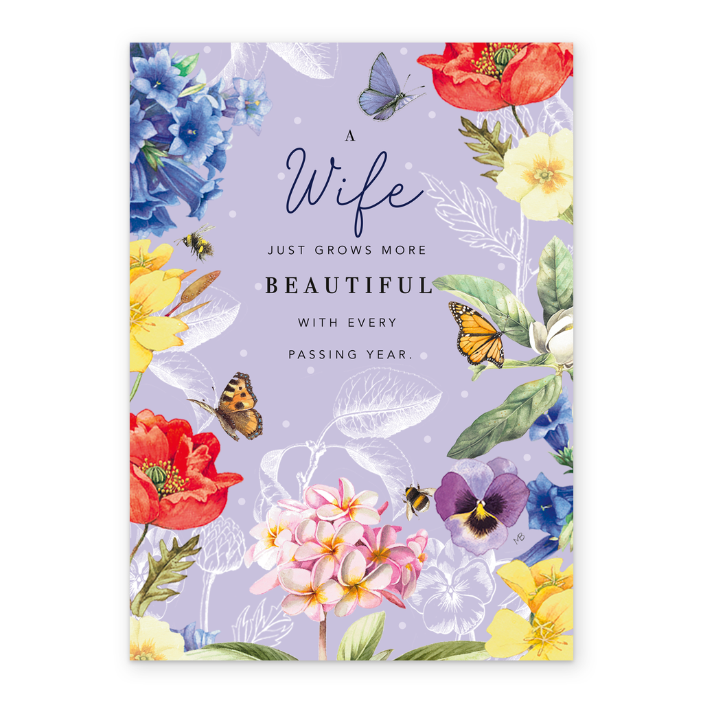 Printed on premium-quality board, this card features gorgeous floral artwork by Marjolein Bastin, with the message ‘A Wife just grows more beautiful with every passing year', space to personalise a name, and comes complete with a co-ordinating white envelope.