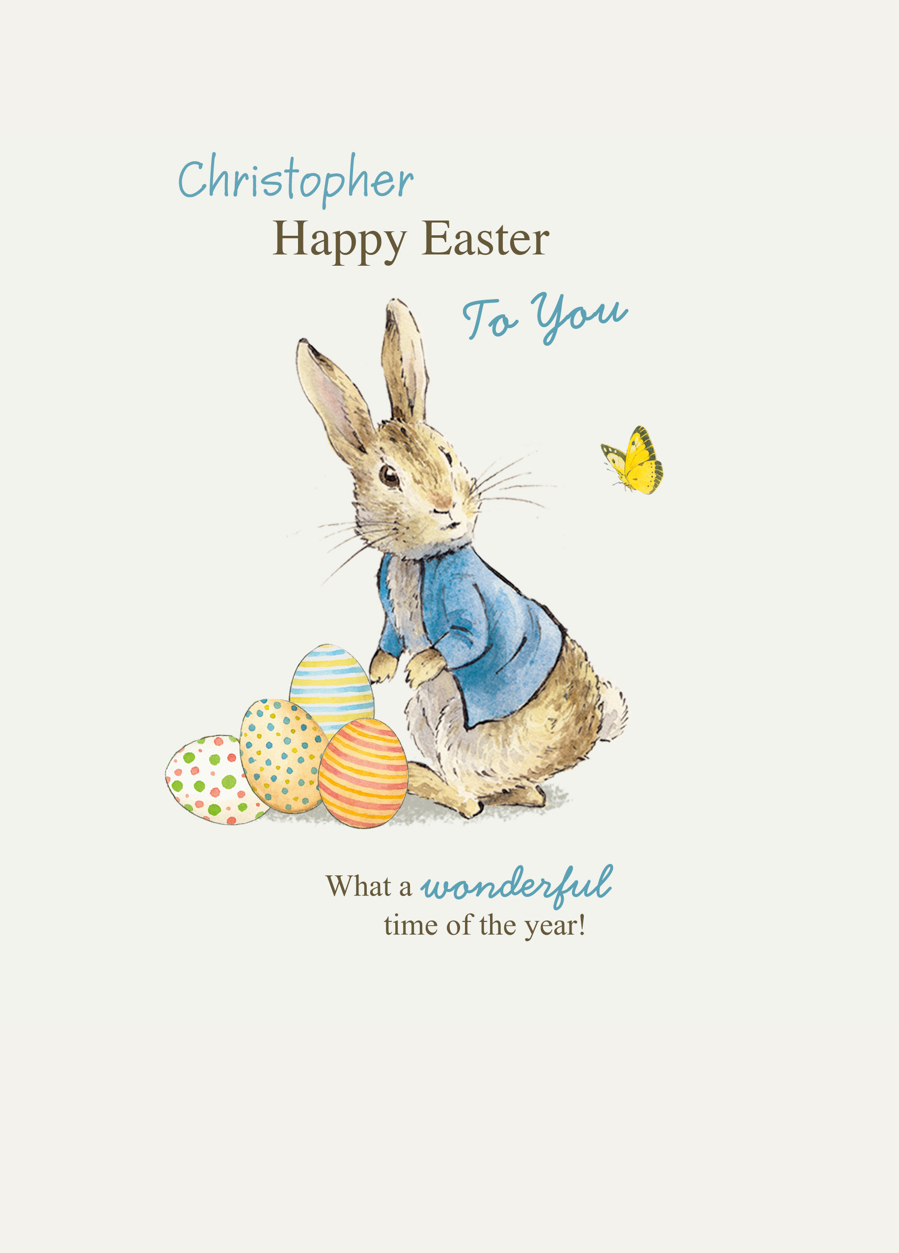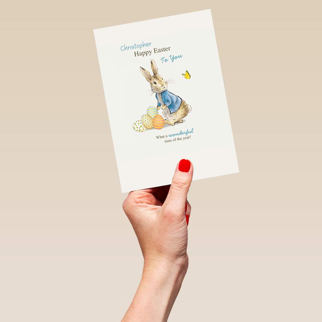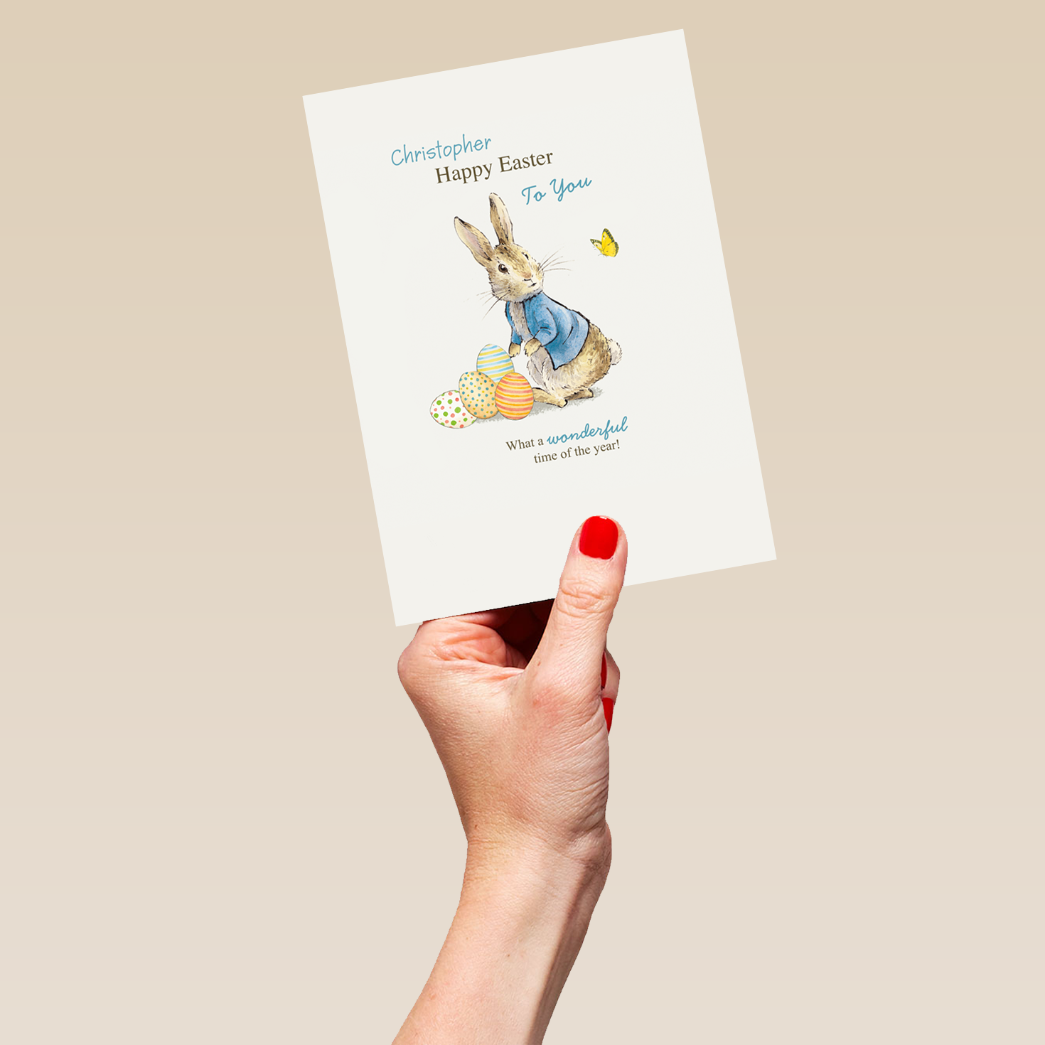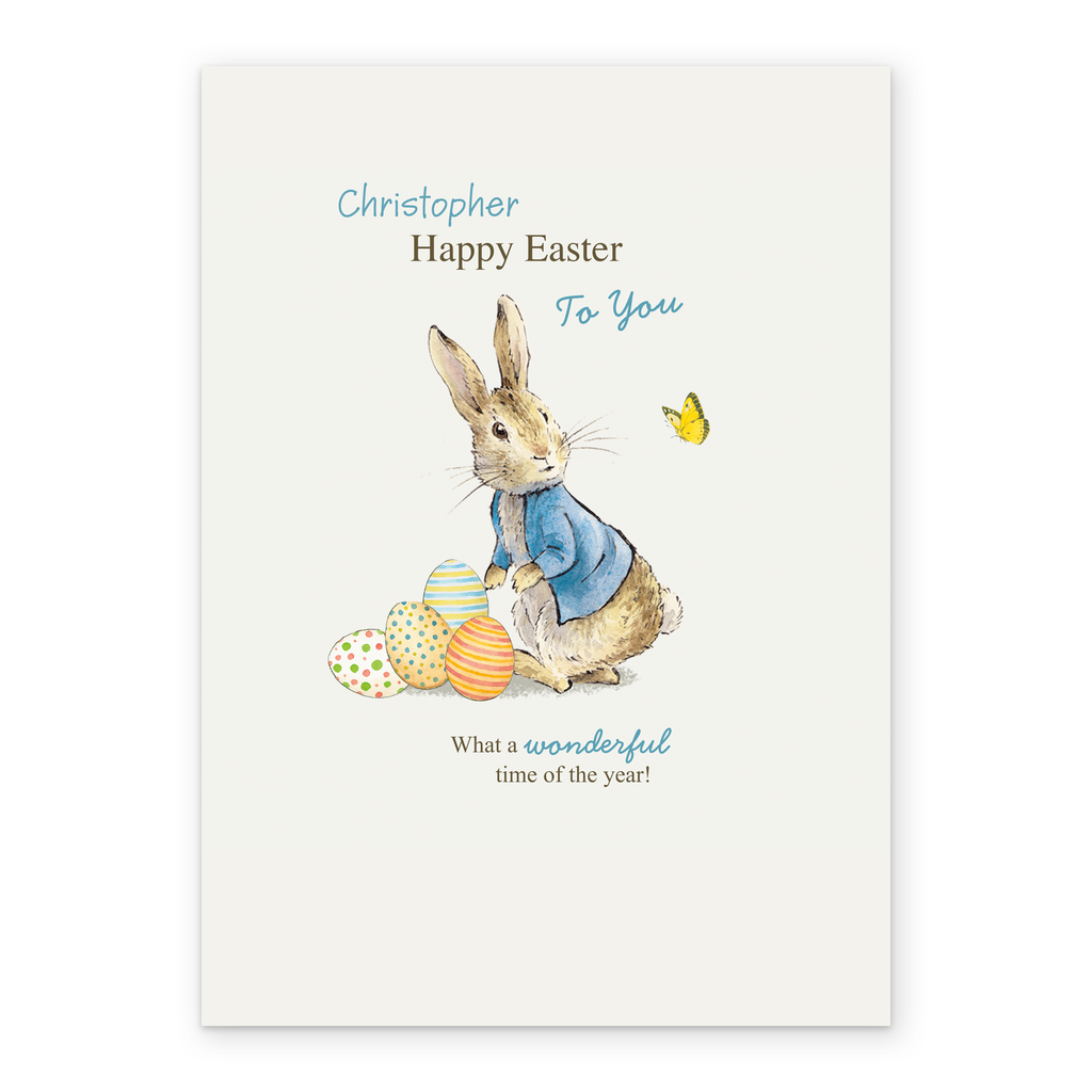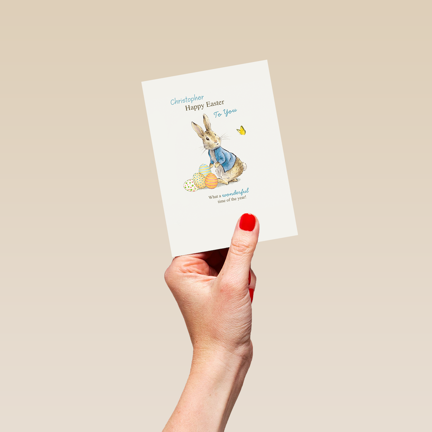 Printed on premium-quality board, this card features Beatrix Potter's mischief maker, Peter Rabbit™ with Easter eggs, and the message '[NAME] Happy Easter To You. What a wonderful time of the year!', space to personalise a name, and comes complete with a co-ordinating white envelope.